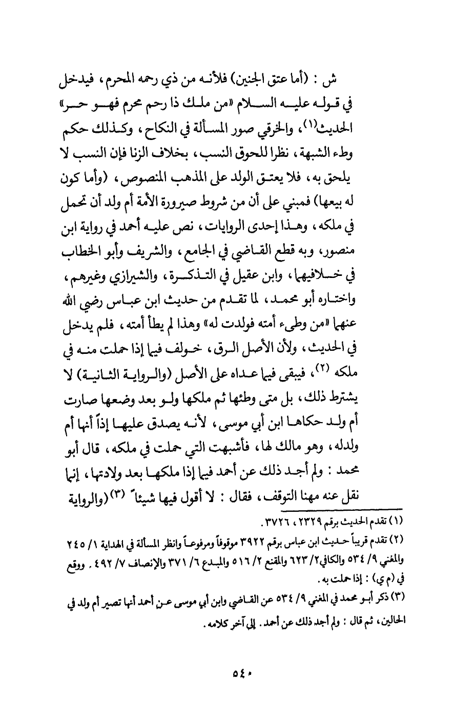 ش: (أما عتق الجنين) فلأنه من ذي رحمه المحرم، فيدخل في قوله - عَلَيْهِ السَّلَامُ -: «من ملك ذا رحم محرم فهو حر» الحديث، والخرقي صور المسألة في النكاح، وكذلك حكم وطء الشبهة، نظرا للحوق النسب، بخلاف الزنا فإن النسب لا يلحق به، فلا يعتق الولد على المذهب المنصوص، (وأما كون له بيعها) فمبني على أن من شروط صيرورة الأمة أم ولد أن تحمل في ملكه، وهذا إحدى الروايات، نص عليه أحمد في رواية ابن منصور، وبه قطع القاضي في الجامع، والشريف وأبو الخطاب في خلافيهما، وابن عقيل في التذكرة، والشيرازي وغيرهم، واختاره أبو محمد، لما تقدم من حديث ابن عباس - رَضِيَ اللَّهُ عَنْهُمَا -: من وطئ أمته فولدت له وهذا لم يطأ أمته، فلم يدخل في الحديث، ولأن الأصل الرق، خولف فيما إذا حملت منه في ملكه، فيبقى فيما عداه على الأصل (والرواية الثانية) لا يشترط ذلك، بل متى وطئها ثم ملكها ولو بعد وضعها صارت أم ولد حكاها ابن أبي موسى، لأنه يصدق عليها إذا أنها أم ولد له، وهو مالك لها، فأشبهت التي حملت في ملكه، قال أبو محمد: ولم أجد ذلك عن أحمد فيما إذا ملكها بعد ولادتها، إنما نقل عنه مهنا التوقف، فقال: لا أقول فيها شيئا (والرواية