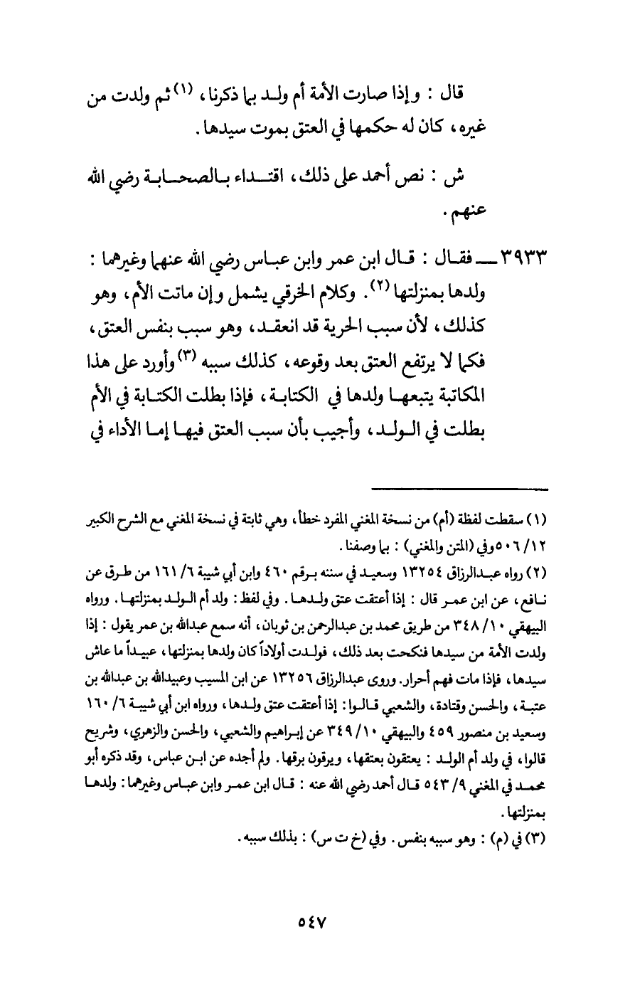 3933 - فقال: قال ابن عمر وابن عباس - رَضِيَ اللَّهُ عَنْهُمَا - وغيرهما: ولدها بمنزلتها. وكلام الخرقي يشمل وإن ماتت الأم، وهو كذلك، لأن سبب الحرية قد انعقد، وهو سبب بنفس العتق، فكما لا يرتفع العتق بعد وقوعه، كذلك سببه وأورد على هذا المكاتبة يتبعها ولدها في الكتابة، فإذا بطلت الكتابة في الأم بطلت في الولد، وأجيب بأن سبب العتق فيها إما الأداء في