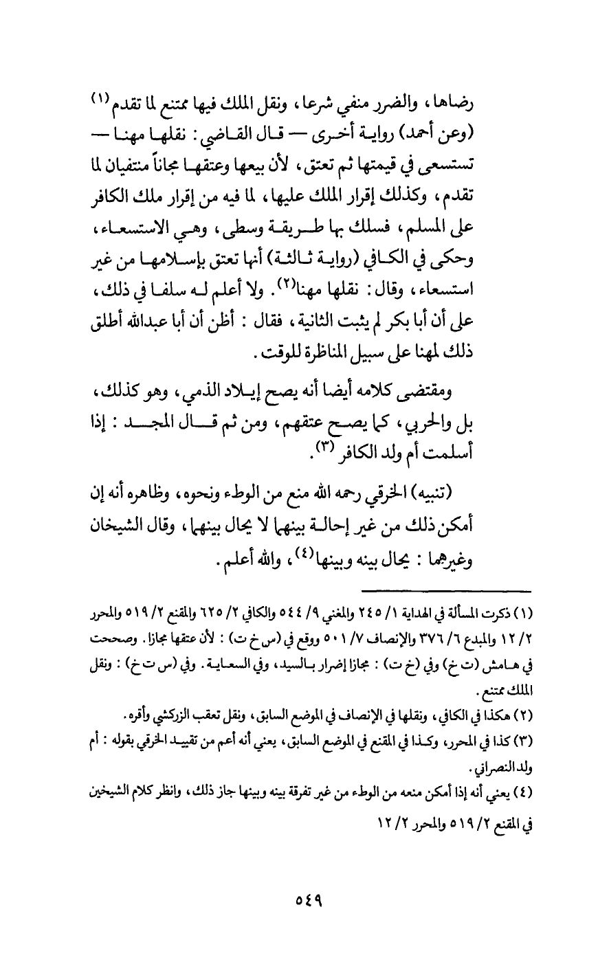 رضاها، والضرر منفي شرعا، ونقل الملك فيها ممتنع لما تقدم (وعن أحمد) رواية أخرى - قال القاضي: نقلها مهنا - تستسعى في قيمتها ثم تعتق، لأن بيعها وعتقها مجانا منتفيان لما تقدم، وكذلك إقرار الملك عليها، لما فيه من إقرار ملك الكافر على المسلم، فسلك بها طريقة وسطى، وهي الاستسعاء، وحكى في الكافي (رواية ثالثة) أنها تعتق بإسلامها من غير استسعاء، وقال: نقلها مهنا. ولا أعلم له سلفا في ذلك، على أن أبا بكر لم يثبت الثانية، فقال: أظن أن أبا عبد الله أطلق ذلك لمهنا على سبيل المناظرة للوقت. ومقتضى كلامه أيضا أنه يصح إيلاد الذمي، وهو كذلك، بل والحربي، كما يصح عتقهم، ومن ثم قال المجد: إذا أسلمت أم ولد الكافر.