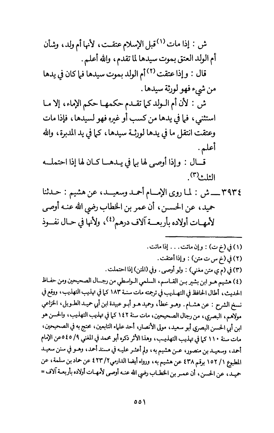 3934 - ش: لما روى الإمام أحمد وسعيد، عن هشيم: حدثنا حميد، عن الحسن، أن عمر بن الخطاب - رَضِيَ اللَّهُ عَنْهُ - أوصى لأمهات أولاده بأربعة ألاف درهم، ولأنها في حال نفوذ