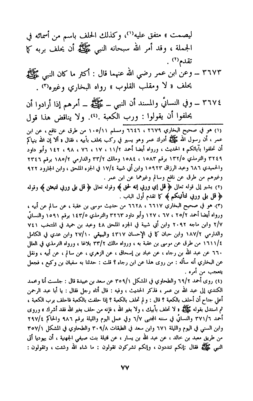 3673 - وعن ابن عمر - رَضِيَ اللَّهُ عَنْهُمَا - قال: «أكثر ما كان النبي - صَلَّى اللَّهُ عَلَيْهِ وَسَلَّمَ - يحلف لا ومقلب القلوب» رواه البخاري وغيره.