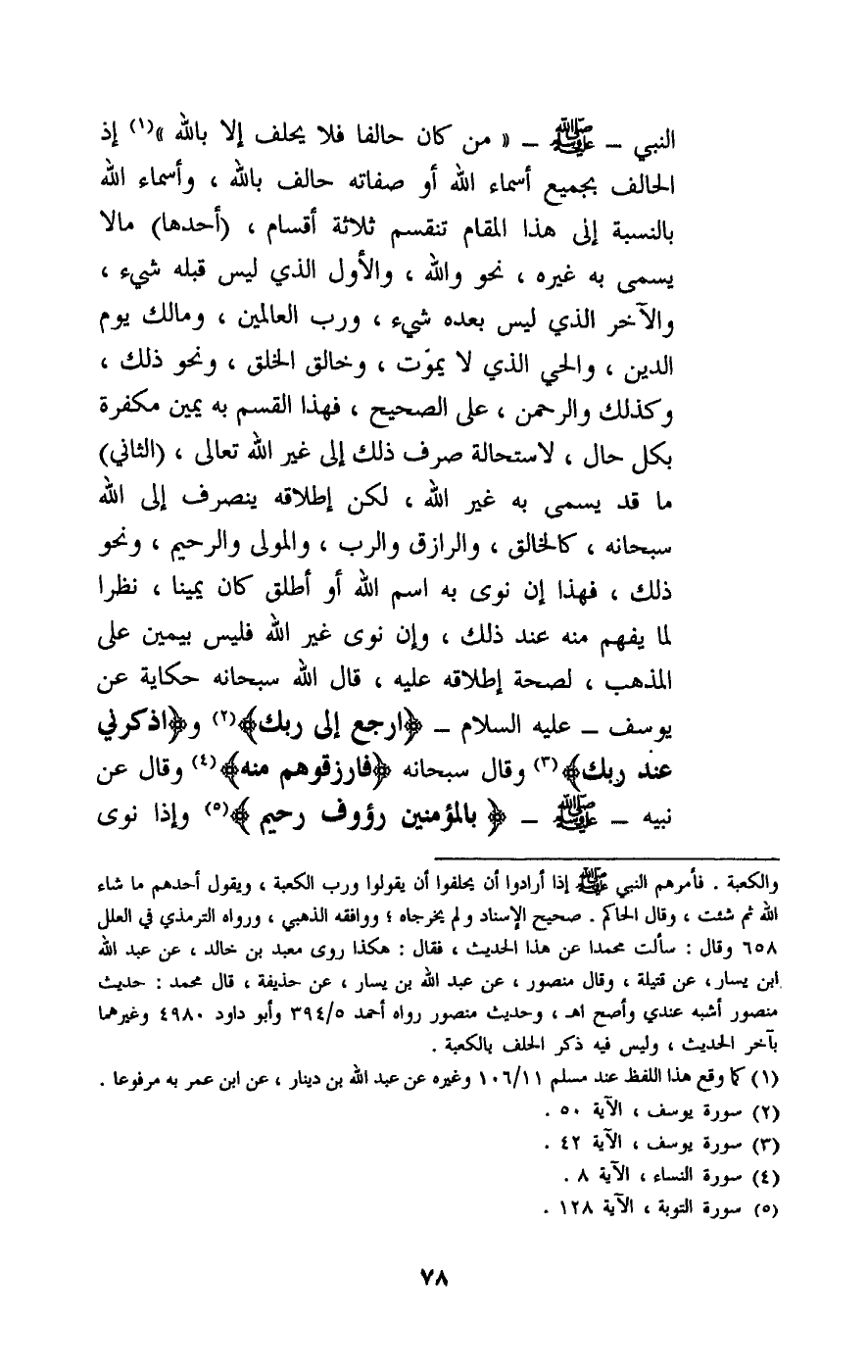 النبي - صَلَّى اللَّهُ عَلَيْهِ وَسَلَّمَ - «من كان حالفا فلا يحلف إلا بالله» إذ الحالف بجميع أسماء الله أو صفاته حالف بالله، وأسماء الله بالنسبة إلى هذا المقام تنقسم ثلاثة أقسام: (أحدها) : ما لا يسمى به غيره، نحو والله، والأول الذي ليس قبله شيء، والآخر الذي ليس بعده شيء، ورب العالمين، ومالك يوم الدين، والحي الذي لا يموت، وخالق الخلق، ونحو ذلك، وكذلك والرحمن، على الصحيح، فهذا القسم به يمين مكفرة بكل حال، لاستحالة صرف ذلك إلى غير الله تعالى. (الثاني) : ما قد يسمى به غير الله، لكن إطلاقه ينصرف إلى الله سبحانه، كالخلق، والرازق والرب، والمولى والرحيم، ونحو ذلك، فهذا إن نوى به اسم الله أو أطلق كان يمينا، نظرا لما يفهم منه عند ذلك، وإن نوى غير الله فليس بيمين على المذهب، لصحة إطلاقه عليه، قال الله سبحانه حكاية عن يوسف - عَلَيْهِ السَّلَامُ -: {ارْجِعْ إِلَى رَبِّكَ} [يوسف: 50] و {اذْكُرْنِي عِنْدَ رَبِّكَ} [يوسف: 42] وقال سبحانه: {فَارْزُقُوهُمْ مِنْهُ} [النساء: 8] وقال عن نبيه - صَلَّى اللَّهُ عَلَيْهِ وَسَلَّمَ -: {بِالْمُؤْمِنِينَ رَءُوفٌ رَحِيمٌ} [التوبة: 128] وإذا نوى