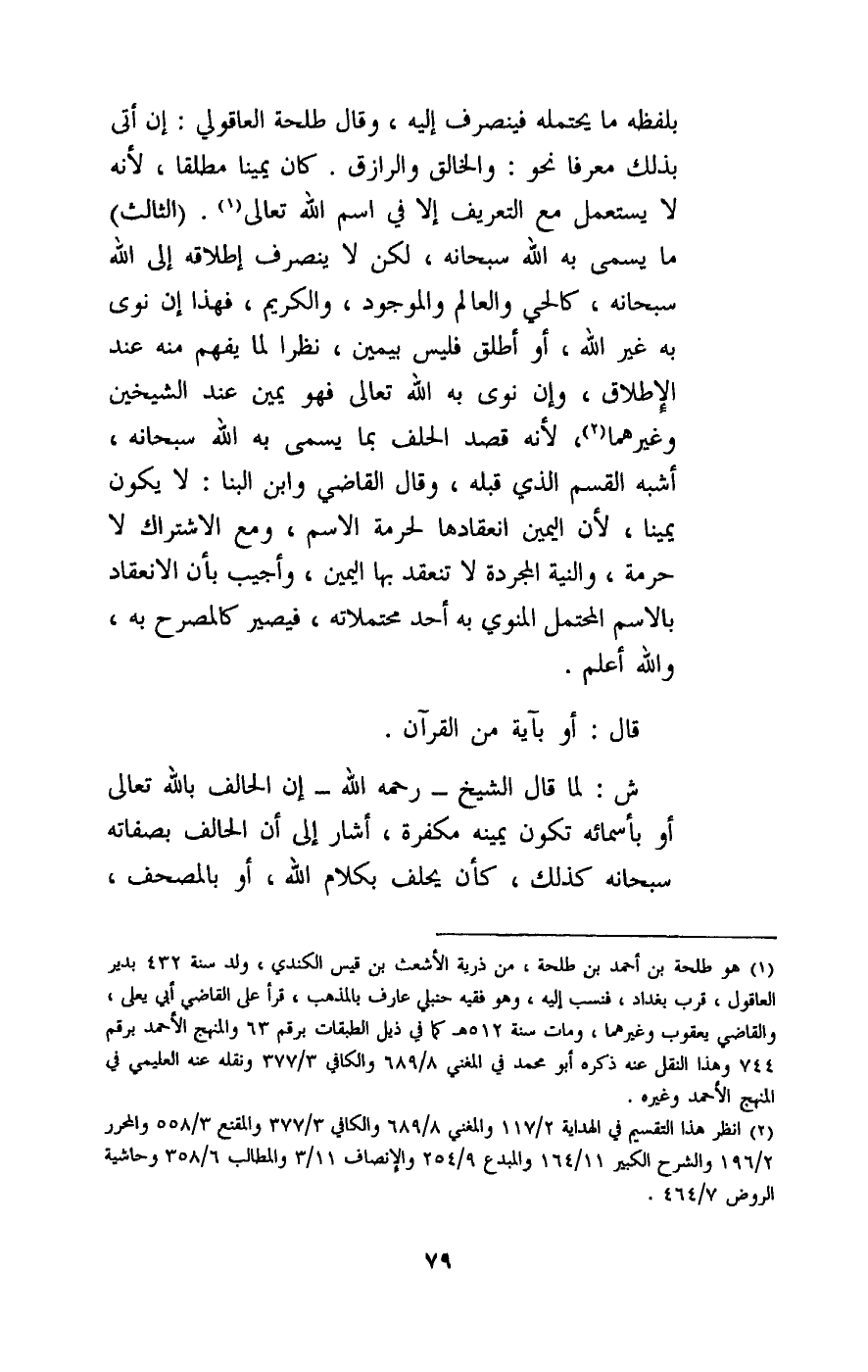 ش: لما قال الشيخ - رَحِمَهُ اللَّهُ - إن الحالف بالله تعالى أو بأسمائه تكون يمينه مكفرة، أشار إلى أن الحالف بصفاته سبحانه كذلك، كأن يحلف بكلام الله، أو بالمصحف،