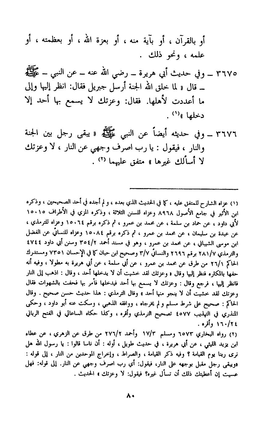3676 - وفي حديثه أيضا عن النبي - صَلَّى اللَّهُ عَلَيْهِ وَسَلَّمَ - «يبقى رجل بين الجنة والنار، فيقول: يا رب اصرف وجهي عن النار، لا وعزتك لا أسألك غيرها» متفق عليهما.