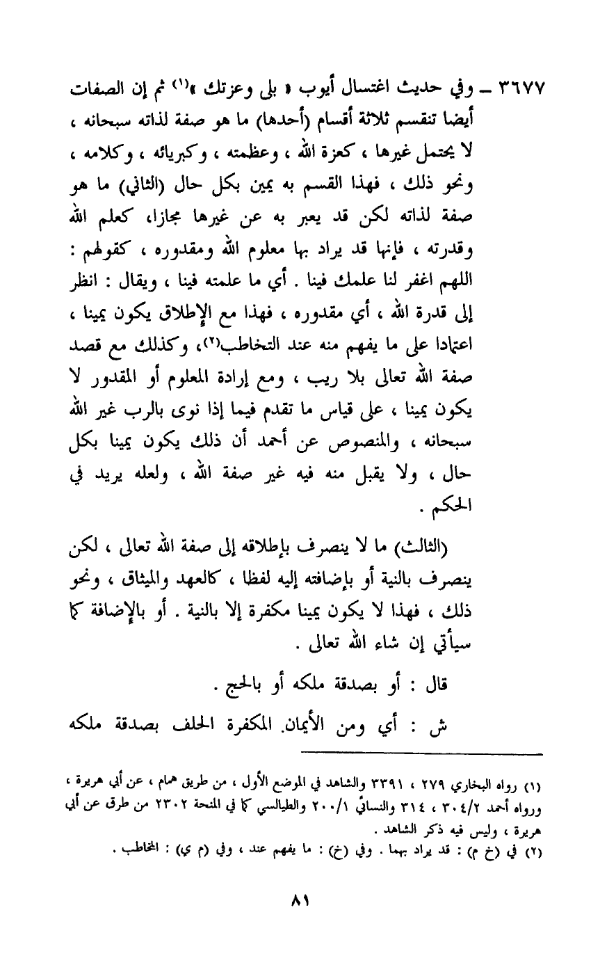 3677 - وفي حديث اغتسال أيوب «بلى وعزتك» ثم إن الصفات أيضا تنقسم ثلاثة أقسام: (أحدها) ما هو صفة لذاته سبحانه، لا يحتمل غيرها، كعزة الله، وعظمته، وكبريائه، وكلامه، ونحو ذلك، فهذا القسم به يمين بكل حال. (الثاني) : ما هو صفة لذاته لكن قد يعبر به عن غيرها مجازا، كعلم الله وقدرته، فإنها قد يراد بها معلوم الله ومقدوره، كقولهم: اللهم اغفر لنا علمك فينا. أي ما علمته فينا، ويقال: انظر إلى قدرة الله، أي مقدوره، فهذا مع الإطلاق يكون يمينا، اعتمادا على ما يفهم منه عند التخاطب، وكذلك مع قصد صفة الله تعالى بلا ريب، ومع إرادة المعلوم أو المقدور لا يكون يمينا، على قياس ما تقدم فيما إذا نوى بالرب غير الله سبحانه، والمنصوص عن أحمد أن ذلك يكون يمينا بكل حال، ولا يقبل منه فيه غير صفة الله، ولعله يريد في الحكم.