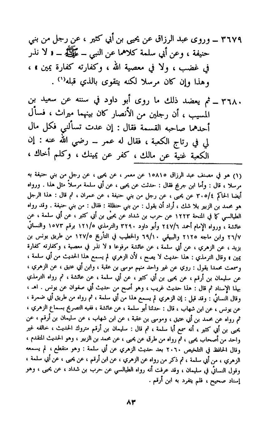 3679 - وروى عبد الرزاق، عن يحيى بن أبي كثير، عن رجل من بني حنيفة، وعن أبي سلمة كلاهما عن النبي - صَلَّى اللَّهُ عَلَيْهِ وَسَلَّمَ - «لا نذر في غضب، ولا في معصية الله، وكفارته كفارة يمين» ، وهذا وإن كان مرسلا لكنه يتقوى بالذي قبله.
