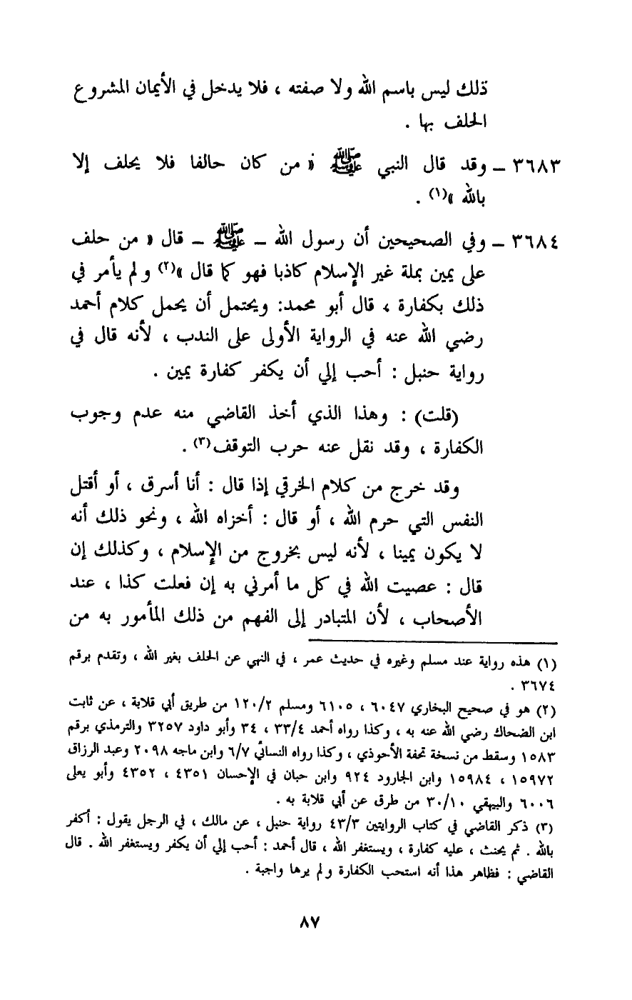 3684 - وفي الصحيحين أن رسول الله - صَلَّى اللَّهُ عَلَيْهِ وَسَلَّمَ - قال: «من حلف على يمين بملة غير الإسلام كاذبا فهو كما قال» ولم يأمر في ذلك بكفارة، قال أبو محمد: ويحتمل أن يحمل كلام أحمد - رَضِيَ اللَّهُ عَنْهُ - في الرواية الأولى على الندب، لأنه قال في رواية حنبل: أحب إلي أن يكفر كفارة يمين.