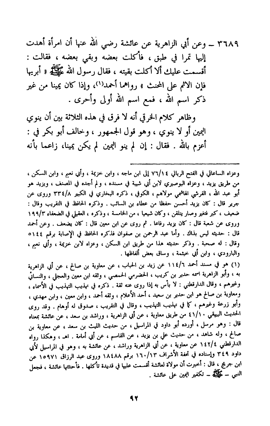 3689 - وعن أبي الزاهرية، «عن عائشة - رَضِيَ اللَّهُ عَنْهَا -: أن امرأة أهدت إليها تمرا في طبق، فأكلت بعضه وبقي بعضه، فقالت: أقسمت عليك ألا أكلت بقيته، فقال رسول الله - صَلَّى اللَّهُ عَلَيْهِ وَسَلَّمَ -: «أبريها فإن الإثم على المحنث» رواهما أحمد، وإذا كان يمينا من غير ذكر اسم الله، فمع اسم الله أولى وأحرى.
