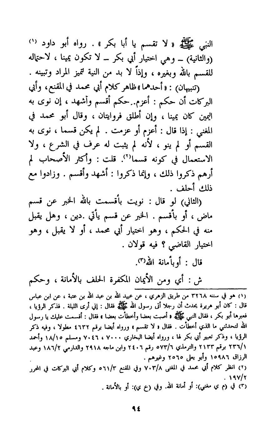 النبي - صَلَّى اللَّهُ عَلَيْهِ وَسَلَّمَ -: «لا تقسم يا أبا بكر» . رواه أبو داود، (والثانية) - وهي اختيار أبي بكر - لا تكون يمينا، لاحتماله للقسم بالله وبغيره، وإذا لا بد من النية لتميز المراد وتبينه.