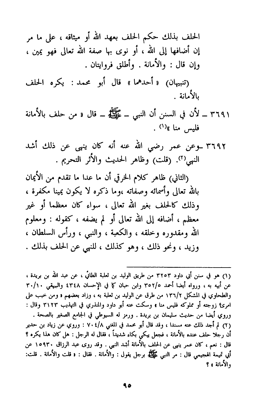 3691 - لأن في السنن أن النبي - صَلَّى اللَّهُ عَلَيْهِ وَسَلَّمَ - قال: «من حلف بالأمانة فليس منا» .