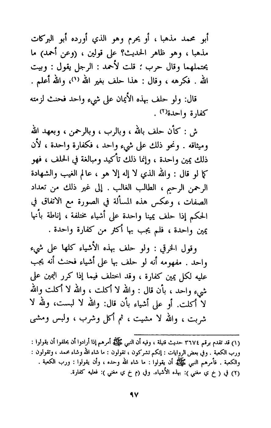 ش: كأن حلف بالله، وبالرب، وبالرحمن، وبعهد الله وميثاقه. ونحو ذلك على شيء واحد، فكفارة واحدة، لأن ذلك يمين واحدة، وإنما ذلك تأكيد ومبالغة في الحلف، فهو كما لو قال: والله الذي لا إله إلا هو، عالم الغيب والشهادة الرحمن الرحيم، الطالب الغالب. إلى غير ذلك من تعداد الصفات، وعكس هذه المسألة في الصورة مع الاتفاق في الحكم إذا حلف يمينا واحدة على أشياء مختلفة، إناطة بأنها يمين واحدة، فلم يجب بها أكثر من كفارة واحدة.