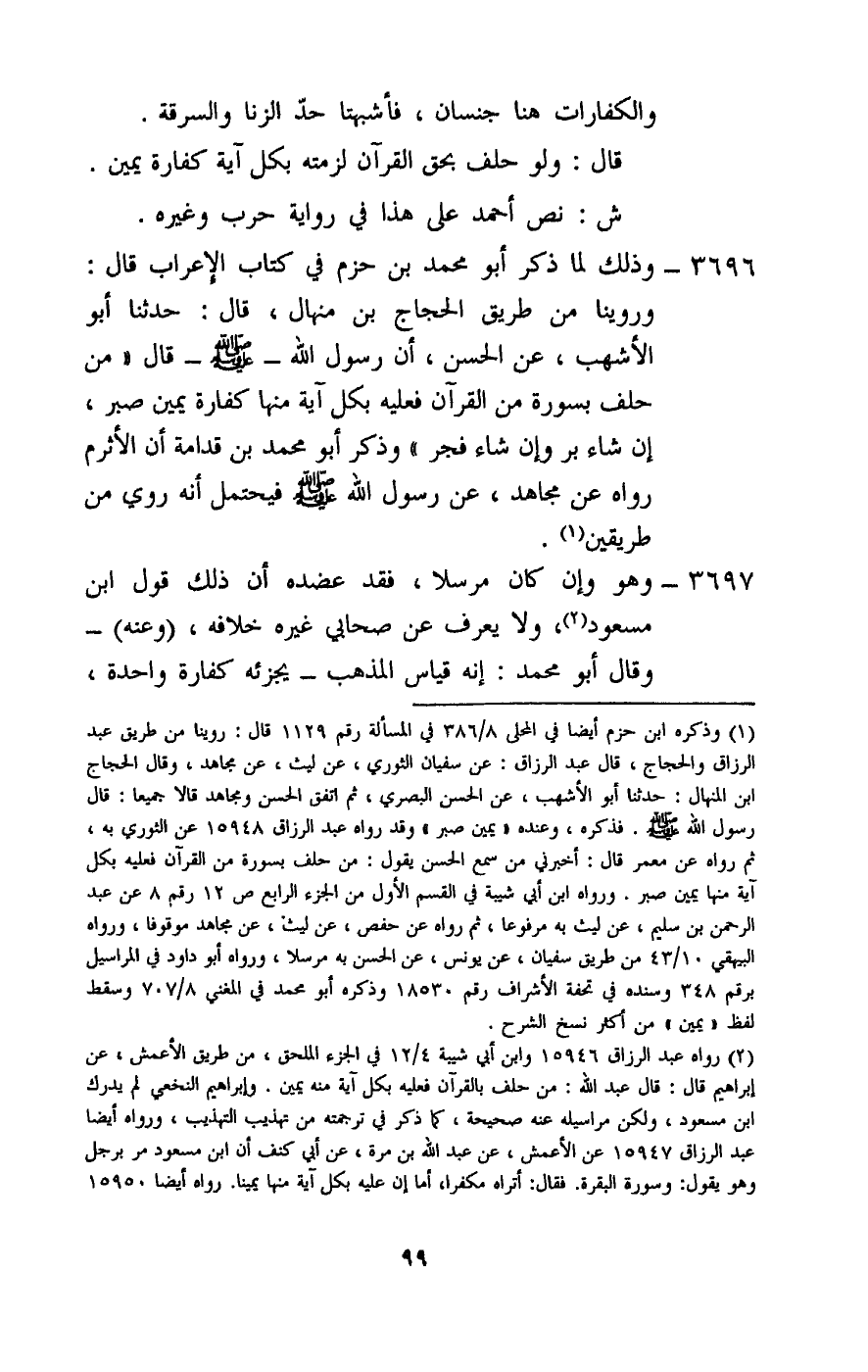 3696 - وذلك لما ذكر أبو محمد بن حزم في كتاب الإعراب، قال: وروينا من طريق الحجاج بن منهال، قال: حدثنا أبو الأشهب، عن الحسن، أن رسول الله - صَلَّى اللَّهُ عَلَيْهِ وَسَلَّمَ - قال: «من حلف بسورة من القرآن فعليه بكل آية منها كفارة يمين صبر، إن شاء بر وإن شاء فجر» وذكر أبو محمد بن قدامة أن الأثرم رواه عن مجاهد، عن رسول الله - صَلَّى اللَّهُ عَلَيْهِ وَسَلَّمَ - فيحتمل أنه روي من طريقين.