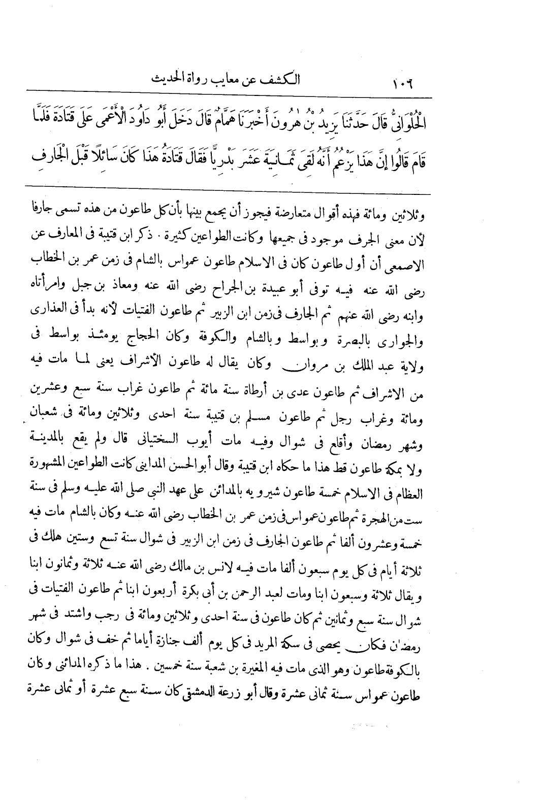 وَثَلَاثِينَ وَمِائَةٍ فَهَذِهِ أَقْوَالٌ مُتَعَارِضَةٌ فَيَجُوزُ أَنْ يُجْمَعَ بَيْنَهَا بِأَنَّ كُلَّ طَاعُونٍ مِنْ هَذِهِ تُسَمَّى جَارِفًا لِأَنَّ مَعْنَى الْجَرْفِ مَوْجُودٌ فِي جميعها وكانت الطواعين كثيرة ذكر بن قُتَيْبَةَ فِي الْمَعَارِفِ عَنِ الْأَصْمَعِيِّ أَنَّ أَوَّلَ طَاعُونٍ كَانَ فِي الْإِسْلَامِ طَاعُونُ عَمَوَاسَ بِالشَّامِ فِي زَمَنِ عُمَرَ بْنِ الْخَطَّابِ رَضِيَ اللَّهُ عَنْهُ فِيهِ تُوُفِّيَ أَبُو عُبَيْدَةَ بْنُ الْجَرَّاحِ رَضِيَ اللَّهُ عَنْهُ وَمُعَاذُ بْنُ جَبَلٍ وَامْرَأَتَاهُ وَابْنُهُ رَضِيَ اللَّهُ عَنْهُمْ ثُمَّ الْجَارِفُ فِي زمن بن الزُّبَيْرِ ثُمَّ طَاعُونُ الْفَتَيَاتِ لِأَنَّهُ بَدَأَ فِي العذارى والجوازى بِالْبَصْرَةِ وَبِوَاسِطٍ وَبِالشَّامِ وَالْكُوفَةِ وَكَانَ الْحَجَّاجُ يَوْمَئِذٍ بِوَاسِطٍ فِي وِلَايَةِ عَبْدِ الْمَلِكِ بْنِ مَرْوَانَ وَكَانَ يُقَالُ لَهُ طَاعُونُ الْأَشْرَافِ يَعْنِي لِمَا مَاتَ فِيهِ مِنَ الْأَشْرَافِ ثُمَّ طَاعُونُ عَدِيِّ بْنِ أَرَطْأَةَ سَنَةَ مِائَةٍ ثُمَّ طَاعُونُ غُرَابٍ سَنَةَ سَبْعٍ وَعِشْرِينَ وَمِائَةٍ وَغُرَابٌ رَجُلٌ ثُمَّ طَاعُونُ مُسْلِمِ بْنِ قُتَيْبَةَ سَنَةَ إِحْدَى وَثَلَاثِينَ وَمِائَةٍ فِي شَعْبَانَ وَشَهْرِ رَمَضَانَ وَأَقْلَعَ فِي شَوَّالٍ وَفِيهِ مَاتَ أَيُّوبُ السِّخْتِيَانِيُّ قَالَ وَلَمْ يَقَعْ بِالْمَدِينَةِ وَلَا بِمَكَّةَ طَاعُونٌ قَطُّ هَذَا ما حكاه بن قُتَيْبَةَ وَقَالَ أَبُو الْحَسَنِ الْمَدَايِنِيُّ كَانَتِ الطَّوَاعِينُ الْمَشْهُورَةُ الْعِظَامُ فِي الْإِسْلَامِ خَمْسَةً طَاعُونُ شِيرَوَيْهِ بِالْمَدَائِنِ عَلَى عَهْدِ النَّبِيِّ صَلَّى اللَّهُ عَلَيْهِ وَسَلَّمَ فِي سَنَةِ سِتٍّ مِنَ الْهِجْرَةِ ثُمَّ طَاعُونُ عَمَوَاسَ فِي زَمَنِ عُمَرَ بْنِ الْخَطَّابِ رَضِيَ اللَّهُ عَنْهُ وَكَانَ بِالشَّامِ مَاتَ فِيهِ خَمْسَةٌ وَعِشْرُونَ أَلْفًا ثُمَّ طَاعُونُ الْجَارِفِ فِي زمن بن الزُّبَيْرِ فِي شَوَّالٍ سَنَةَ تِسْعٍ وَسِتِّينَ هَلَكَ فِي ثَلَاثَةِ أَيَّامٍ فِي كُلِّ يَوْمٍ سَبْعُونَ أَلْفًا مَاتَ فِيهِ لِأَنَسِ بْنِ مَالِكٍ رَضِيَ اللَّهُ عَنْهُ ثَلَاثَةٌ وَثَمَانُونَ ابْنًا وَيُقَالُ ثَلَاثَةٌ وَسَبْعُونَ ابْنًا وَمَاتَ لِعَبْدِ الرَّحْمَنِ بْنِ أَبِي بَكْرَةَ أَرْبَعُونَ ابْنًا ثُمَّ طَاعُونُ الْفَتَيَاتِ فِي شَوَّالٍ سَنَةَ سَبْعٍ وَثَمَانِينَ ثُمَّ كَانَ طَاعُونٌ فِي سَنَةِ إِحْدَى وَثَلَاثِينَ وَمِائَةٍ فِي رَجَبٍ وَاشْتَدَّ فِي شَهْرِ رَمَضَانَ فَكَانَ يُحْصَى فِي سِكَّةِ الْمُرِيدِ فِي كُلِّ يَوْمٍ أَلْفُ جِنَازَةٍ أَيَّامًا ثُمَّ خَفَّ فِي شَوَّالٍ وَكَانَ بِالْكُوفَةِ طَاعُونٌ وَهُوَ الَّذِي مَاتَ فِيهِ الْمُغِيرَةُ بْنُ شُعْبَةَ سَنَةَ خَمْسِينَ هَذَا مَا ذَكَرَهُ الْمَدَائِنِيُّ وَكَانَ طَاعُونُ عَمَوَاسَ سَنَةَ ثَمَانِيَ عَشْرَةَ وَقَالَ أَبُو زُرْعَةَ الدِّمَشْقِيُّ كَانَ سَنَةَ سَبْعَ عَشْرَةَ أو ثمانى عشرة