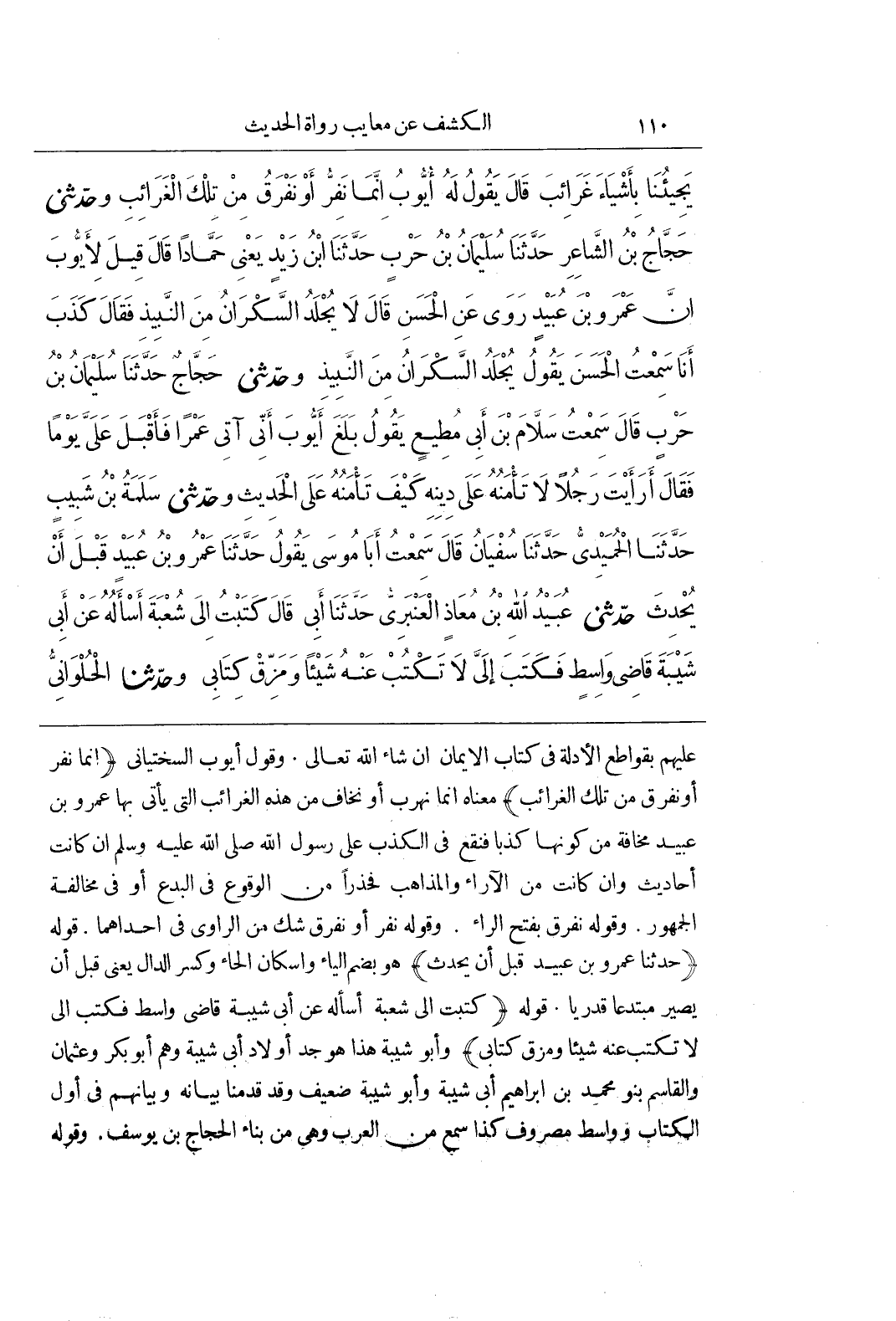عَلَيْهِمْ بِقَوَاطِعِ الْأَدِلَّةِ فِي كِتَابِ الْإِيمَانِ إِنْ شَاءَ اللَّهُ تَعَالَى وَقَوْلُ أَيُّوبَ السِّخْتِيَانِيِّ (إِنَّمَا نَفِرُّ أَوْ نَفْرَقُ مِنْ تِلْكَ الْغَرَائِبِ) مَعْنَاهُ إِنَّمَا نَهْرُبُ أَوْ نَخَافُ مِنْ هَذِهِ الْغَرَائِبِ الَّتِي يَأْتِي بِهَا عَمْرُو بْنُ عُبَيْدٍ مَخَافَةً مِنْ كَوْنِهَا كَذِبًا فَنَقَعُ فِي الْكَذِبِ عَلَى رَسُولِ اللَّهِ صَلَّى اللَّهُ عَلَيْهِ وَسَلَّمَ إن كَانَتْ أَحَادِيثَ وَإِنْ كَانَتْ مِنَ الْآرَاءِ وَالْمَذَاهِبِ فَحَذَرًا مِنَ الْوُقُوعِ فِي الْبِدَعِ أَوْ فِي مُخَالَفَةِ الْجُمْهُورِ وَقَوْلُهُ نَفْرَقُ بِفَتْحِ الرَّاءِ وَقَوْلُهُ نَفِرُّ أَوْ نَفْرَقُ شَكٌّ مِنَ الرَّاوِي فِي إِحْدَاهُمَا قَوْلُهُ (حَدَّثَنَا عَمْرُو بْنُ عُبَيْدٍ قَبْلَ أَنْ يُحْدِثَ) هُوَ بِضَمِّ الْيَاءِ وَإِسْكَانِ الْحَاءِ وَكَسْرِ الدَّالِ يَعْنِي قَبْلَ أَنْ يَصِيرَ مُبْتَدِعًا قَدَرِيًّا قَوْلُهُ (كَتَبْتُ إِلَى شُعْبَةَ أَسْأَلُهُ عَنْ أبى شيبة قاضى واسط فكتب إلى لاتكتب عَنْهُ شَيْئًا وَمَزِّقْ كِتَابِي) وَأَبُو شَيْبَةَ هَذَا هُوَ جَدُّ أَوْلَادِ أَبِي شَيْبَةَ وَهُمْ أَبُو بَكْرٍ وَعُثْمَانُ وَالْقَاسِمُ بَنُو مُحَمَّدِ بْنِ إِبْرَاهِيمَ أَبِي شَيْبَةَ وَأَبُو شَيْبَةَ ضَعِيفٌ وَقَدْ قَدَّمْنَا بَيَانَهُ وَبَيَانَهُمْ فِي أَوَّلِ الْكِتَابِ وَوَاسِطٌ مَصْرُوفٌ كَذَا سُمِعَ مِنَ الْعَرَبِ وَهِي مِنْ بِنَاءِ الْحَجَّاجِ بْنِ يُوسُفَ وَقَوْلُهُ