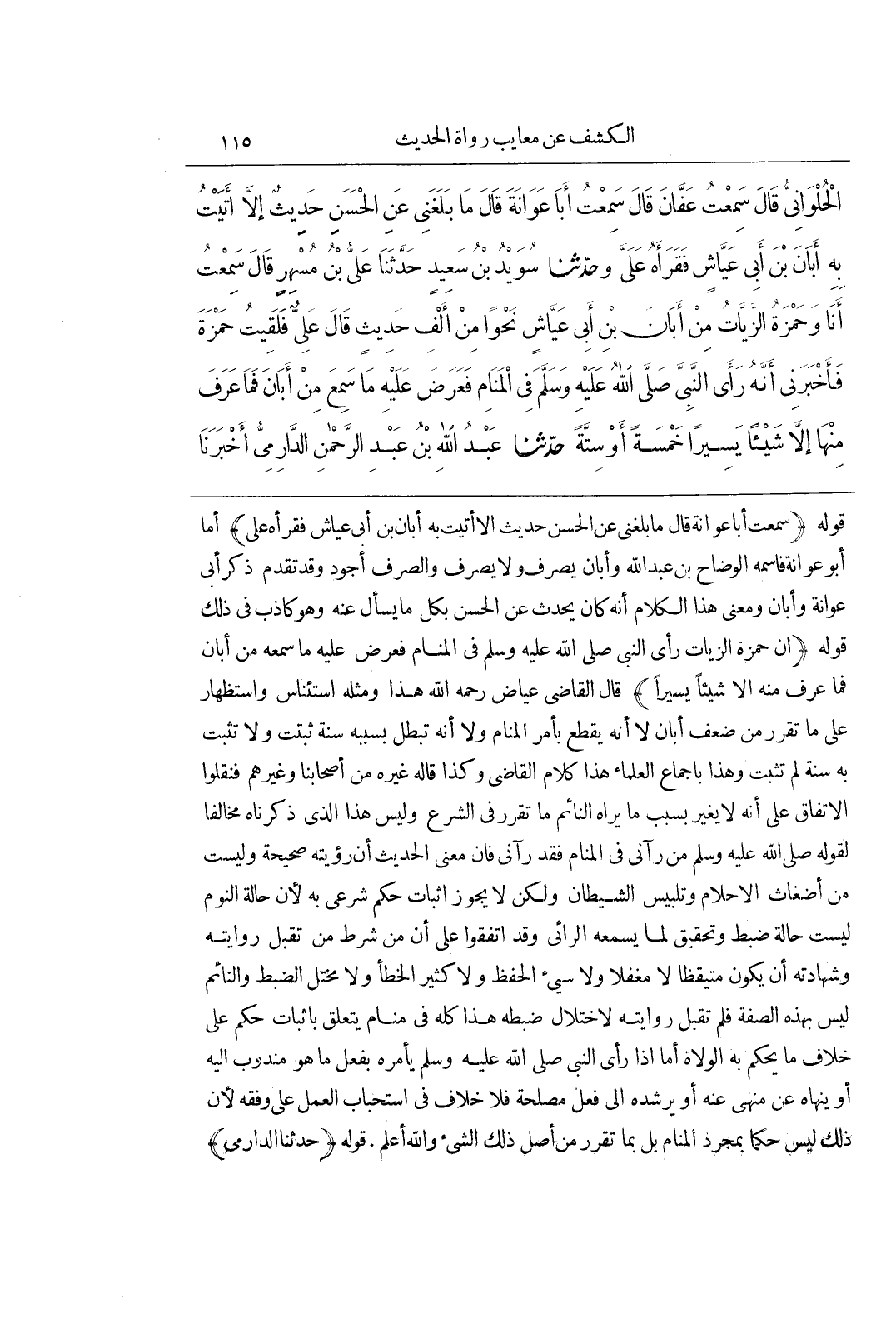 قَوْلُهُ (سَمِعْتُ أَبَا عَوَانَةَ قَالَ مَا بَلَغَنِي عَنِ الْحَسَنِ حَدِيثٌ إِلَّا أَتَيْتُ بِهِ أَبَانَ بْنَ أَبِي عَيَّاشٍ فَقَرَأَهُ عَلَيَّ) أَمَّا أَبُو عَوَانَةَ فَاسْمُهُ الْوَضَّاحُ بْنُ عَبْدِ اللَّهِ وَأَبَانٌ يُصْرَفُ وَلَا يُصْرَفُ وَالصَّرْفُ أَجْوَدُ وَقَدْ تَقَدَّمَ ذِكْرُ أَبِي عَوَانَةَ وَأَبَانٍ وَمَعْنَى هَذَا الْكَلَامِ أَنَّهُ كَانَ يُحَدِّثُ عَنِ الْحَسَنِ بِكُلِّ مَا يُسْأَلُ عَنْهُ وَهُوَ كَاذِبٌ فِي ذَلِكَ قَوْلُهُ (إِنَّ حَمْزَةَ الزَّيَّاتَ رَأَى النَّبِيَّ صَلَّى اللَّهُ عَلَيْهِ وَسَلَّمَ فِي الْمَنَامِ فَعَرَضَ عَلَيْهِ مَا سَمِعَهُ مِنْ أَبَانٍ فَمَا عَرَفَ مِنْهُ إِلَّا شَيْئًا يَسِيرًا) قَالَ الْقَاضِي عِيَاضٌ رَحِمَهُ اللَّهُ هَذَا وَمِثْلُهُ اسْتِئْنَاسٌ وَاسْتِظْهَارٌ عَلَى مَا تَقَرَّرَ مِنْ ضَعْفِ أَبَانٍ لَا أَنَّهُ يَقْطَعُ بِأَمْرِ الْمَنَامِ وَلَا أَنَّهُ تَبْطُلُ بِسَبَبِهِ سُنَّةٌ ثَبَتَتْ وَلَا تَثْبُتُ بِهِ سُنَّةٌ لَمْ تَثْبُتْ وَهَذَا بِإِجْمَاعِ الْعُلَمَاءِ هَذَا كَلَامُ الْقَاضِي وَكَذَا قَالَهُ غَيْرُهُ مِنْ أَصْحَابِنَا وَغَيْرُهُمْ فَنَقَلُوا الِاتِّفَاقَ عَلَى أَنَّهُ لَا يُغَيَّرُ بِسَبَبِ مَا يَرَاهُ النَّائِمُ مَا تَقَرَّرَ فِي الشَّرْعِ وَلَيْسَ هَذَا الَّذِي ذَكَرْنَاهُ مُخَالِفًا لِقَوْلِهِ صَلَّى اللَّهُ عَلَيْهِ وَسَلَّمَ مَنْ رَآنِي فِي الْمَنَامِ فَقَدْ رَآنِي فَإِنَّ مَعْنَى الْحَدِيثِ أَنَّ رُؤْيَتَهُ صَحِيحَةٌ وَلَيْسَتْ مِنْ أَضْغَاثِ الْأَحْلَامِ وَتَلْبِيسِ الشَّيْطَانِ وَلَكِنْ لَا يَجُوزُ إِثْبَاتُ حُكْمٍ شَرْعِيٍّ بِهِ لِأَنَّ حَالَةَ النَّوْمِ لَيْسَتْ حَالَةَ ضَبْطٍ وَتَحْقِيقٍ لِمَا يَسْمَعُهُ الرَّائِي وَقَدِ اتَّفَقُوا عَلَى أَنَّ مِنْ شَرْطِ مَنْ تُقْبَلُ رِوَايَتُهُ وَشَهَادَتُهُ أَنْ يَكُونَ مُتَيَقِّظًا لَا مغفلا ولا سىء الْحِفْظِ وَلَا كَثِيرَ الْخَطَأِ وَلَا مُخْتَلَّ الضَّبْطِ وَالنَّائِمُ لَيْسَ بِهَذِهِ الصِّفَةِ فَلَمْ تُقْبَلْ رِوَايَتُهُ لِاخْتِلَالِ ضَبْطِهِ هَذَا كُلُّهُ فِي مَنَامٍ يَتَعَلَّقُ بِإِثْبَاتِ حُكْمٍ عَلَى خِلَافِ مَا يَحْكُمُ بِهِ الْوُلَاةُ أَمَّا إِذَا رَأَى النَّبِيَّ صَلَّى اللَّهُ عَلَيْهِ وَسَلَّمَ يَأْمُرُهُ بِفِعْلِ مَا هُوَ مَنْدُوبٌ إِلَيْهِ أَوْ يَنْهَاهُ عَنْ مَنْهِيٍّ عَنْهُ أَوْ يُرْشِدُهُ إِلَى فِعْلِ مَصْلَحَةٍ فَلَا خِلَافَ فِي اسْتِحْبَابِ الْعَمَلِ عَلَى وَفْقِهِ لِأَنَّ ذَلِكَ لَيْسَ حُكْمًا بِمُجَرَّدِ الْمَنَامِ بَلْ تَقَرَّرَ مِنْ أَصْلِ ذَلِكَ الشَّيْءِ وَاللَّهُ أَعْلَمُ قَوْلُهُ (حَدَّثَنَا الدَّارِمِيُّ