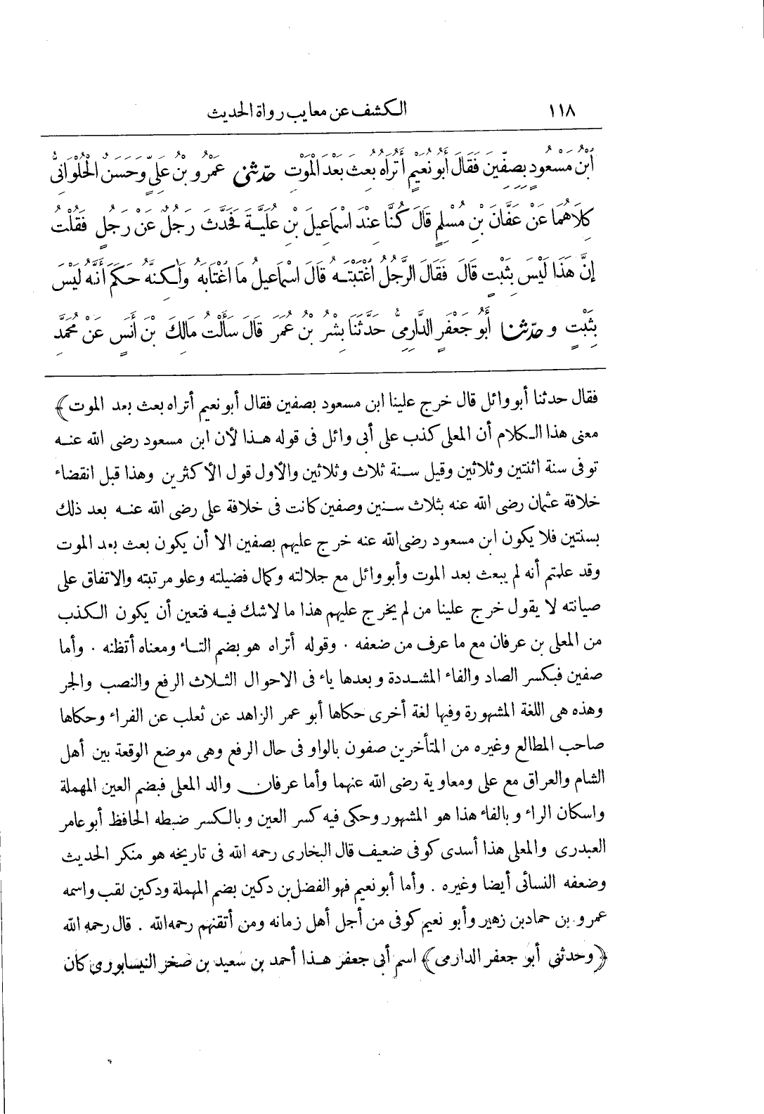 فَقَالَ حَدَّثَنَا أَبُو وَائِلٍ قَالَ خَرَجَ عَلَيْنَا بن مَسْعُودٍ بِصِفِّينَ فَقَالَ أَبُو نُعَيْمٍ أَتُرَاهُ بُعِثَ بَعْدَ الْمَوْتِ) مَعْنَى هَذَا الْكَلَامِ أَنَّ الْمُعَلَّى كَذَبَ عَلَى أَبِي وَائِلٍ فِي قَوْلِهِ هَذَا لأن بن مَسْعُودٍ رَضِيَ اللَّهُ عَنْهُ تُوُفِّيَ سَنَةَ اثْنَتَيْنِ وَثَلَاثِينَ وَقِيلَ سَنَةَ ثَلَاثٍ وَثَلَاثِينَ وَالْأَوَّلُ قَوْلُ الْأَكْثَرِينَ وَهَذَا قَبْلَ انْقِضَاءِ خِلَافَةِ عُثْمَانَ رَضِيَ اللَّهُ عَنْهُ بِثَلَاثِ سِنِينَ وَصِفِّينَ كَانَتْ فِي خِلَافَةِ عَلِيٍّ رَضِيَ اللَّهُ عَنْهُ بَعْدَ ذَلِكَ بسنتين فلا يكون بن مَسْعُودٍ رَضِيَ اللَّهُ عَنْهُ خَرَجَ عَلَيْهِمْ بِصِفِّينَ إِلَّا أَنْ يَكُونَ بُعِثَ بَعْدَ الْمَوْتِ وَقَدْ عَلِمْتُمْ أَنَّهُ لَمْ يُبْعَثْ بَعْدَ الْمَوْتِ وَأَبُو وَائِلٍ مَعَ جَلَالَتِهِ وَكَمَالِ فَضِيلَتِهِ وَعُلُوِّ مَرْتَبَتِهِ وَالِاتِّفَاقِ عَلَى صِيَانَتِهِ لَا يَقُولُ خَرَجَ عَلَيْنَا من لم يخرج عليهم هذا مالا شَكَّ فِيهِ فَتَعَيَّنَ أَنْ يَكُونَ الْكَذِبُ مِنَ الْمُعَلَّى بْنِ عُرْفَانَ مَعَ مَا عُرِفَ مِنْ ضَعْفِهِ وَقَوْلُهُ أَتُرَاهُ هُوَ بِضَمِّ التَّاءِ وَمَعْنَاهُ أَتَظُنُّهُ وَأَمَّا صِفِّينَ فَبِكَسْرِ الصَّادِ وَالْفَاءِ الْمُشَدَّدَةِ وَبَعْدَهَا يَاءٌ فِي الْأَحْوَالِ الثَّلَاثِ الرَّفْعِ وَالنَّصْبِ وَالْجَرِّ وَهَذِهِ هِيَ اللُّغَةُ الْمَشْهُورَةُ وَفِيهَا لُغَةٌ أُخْرَى حَكَاهَا أَبُو عُمَرَ الزَّاهِدُ عَنْ ثَعْلَبٍ عَنِ الْفَرَّاءِ وَحَكَاهَا صَاحِبُ الْمَطَالِعِ وَغَيْرُهُ مِنَ المتأخرين صفون بِالْوَاوِ فِي حَالِ الرَّفْعِ وَهِيَ مَوْضِعُ الْوَقْعَةِ بَيْنَ أَهْلِ الشَّامِ وَالْعِرَاقِ مَعَ عَلِيٍّ وَمُعَاوِيَةَ رَضِيَ اللَّهُ عَنْهُمَا وَأَمَّا عُرْفَانُ وَالِدُ الْمُعَلَّى فَبِضَمِّ الْعَيْنِ الْمُهْمَلَةِ وَإِسْكَانِ الرَّاءِ وَبِالْفَاءِ هَذَا هو الْمَشْهُورُ وَحُكِيَ فِيهِ كَسْرُ الْعَيْنِ وَبِالْكَسْرِ ضَبَطَهُ الْحَافِظُ أَبُو عَامِرٍ الْعَبْدَرِيُّ وَالْمُعَلَّى هَذَا أَسَدِيٌّ كُوفِيٌّ ضَعِيفٌ قَالَ الْبُخَارِيُّ رَحِمَهُ اللَّهُ فِي تَارِيخِهِ هُوَ مُنْكَرُ الْحَدِيثِ وَضَعَّفَهُ النَّسَائِيُّ أَيْضًا وَغَيْرُهُ وَأَمَّا أَبُو نُعَيْمٍ فَهُوَ الْفَضْلُ بْنُ دكين بضم المهملة ودكين لَقَبٌ وَاسْمُهُ عَمْرُو بْنُ حَمَّادِ بْنِ زُهَيْرٍ وَأَبُو نُعَيْمٍ كُوفِيٌّ مِنْ أَجَلِّ أَهْلِ زَمَانِهِ وَمِنْ أَتْقَنِهِمْ رَحِمَهُ اللَّهُ قَالَ رَحِمَهُ اللَّهُ (وحدثنى أبو جعفر الدارمى) اسم أبى جَعْفَرٍ هَذَا أَحْمَدُ بْنُ سَعِيدِ بْنِ صَخْرٍ النيسابورى كان