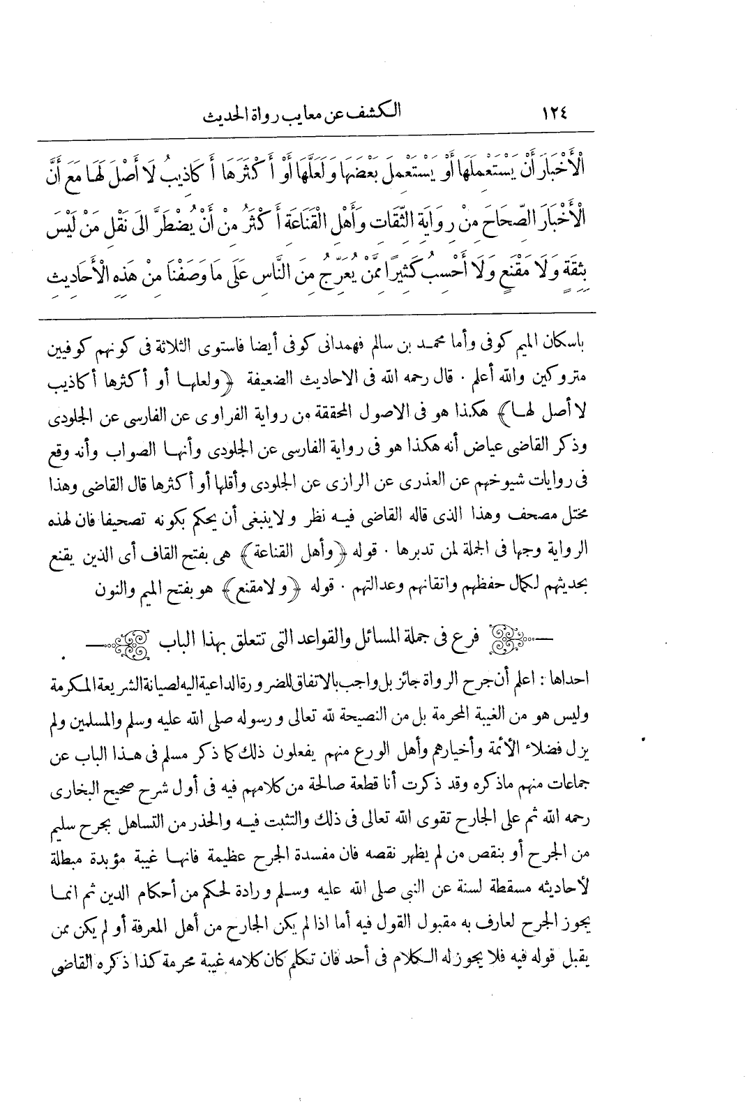 إِحْدَاهَا اعْلَمْ أَنَّ جَرْحَ الرُّوَاةِ جَائِزٌ بَلْ وَاجِبٌ بِالِاتِّفَاقِ لِلضَّرُورَةِ الدَّاعِيَةِ إِلَيْهِ لِصِيَانَةِ الشَّرِيعَةِ الْمُكَرَّمَةِ وَلَيْسَ هُوَ مِنَ الْغِيبَةِ الْمُحَرَّمَةِ بَلْ مِنَ النَّصِيحَةِ لِلَّهِ تَعَالَى وَرَسُولِهِ صَلَّى اللَّهُ عَلَيْهِ وَسَلَّمَ وَالْمُسْلِمِينَ وَلَمْ يَزَلْ فُضَلَاءُ الْأَئِمَّةِ وَأَخْيَارُهُمْ وَأَهْلُ الْوَرَعِ مِنْهُمْ يَفْعَلُونَ ذَلِكَ كَمَا ذَكَرَ مُسْلِمٌ فِي هَذَا الْبَابِ عَنْ جَمَاعَاتٍ مِنْهُمْ مَا ذَكَرَهُ وَقَدْ ذَكَرْتُ أَنَا قِطْعَةً صَالِحَةً مِنْ كَلَامِهِمْ فِيهِ فِي أَوَّلِ شَرْحِ صَحِيحِ الْبُخَارِيِّ رَحِمَهُ اللَّهُ ثُمَّ عَلَى الْجَارِحِ تَقْوَى اللَّهِ تَعَالَى فِي ذَلِكَ وَالتَّثَبُّتُ فِيهِ وَالْحَذَرُ مِنَ التَّسَاهُلِ بِجَرْحِ سَلِيمٍ مِنَ الْجَرْحِ أَوْ بِنَقْصِ مَنْ لَمْ يَظْهَرْ نَقْصُهُ فَإِنَّ مَفْسَدَةَ الْجَرْحِ عَظِيمَةٌ فَإِنَّهَا غِيبَةٌ مُؤَبَّدَةٌ مُبْطِلَةٌ لِأَحَادِيثِهِ مُسْقِطَةٌ لِسُنَّةٍ عَنِ النَّبِيِّ صَلَّى اللَّهُ عَلَيْهِ وَسَلَّمَ وَرَادَّةٌ لِحُكْمٍ مِنْ أَحْكَامِ الدِّينِ ثُمَّ إِنَّمَا يَجُوزُ الْجَرْحُ لِعَارِفٍ بِهِ مَقْبُولُ الْقَوْلِ فِيهِ أَمَّا إِذَا لَمْ يَكُنِ الْجَارِحُ مِنْ أَهْلِ الْمَعْرِفَةِ أَوْ لَمْ يَكُنْ مِمَّنْ يُقْبَلُ قَوْلُهُ فِيهِ فَلَا يَجُوزُ لَهُ الْكَلَامُ فِي أَحَدٍ فَإِنْ تَكَلَّمَ كَانَ كَلَامُهُ غِيبَةً مُحَرَّمَةً كَذَا ذَكَرَهُ الْقَاضِي