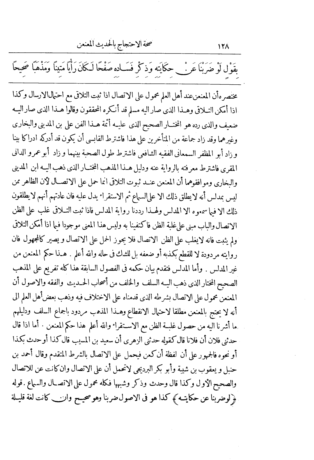 مُخْتَصَرُهُ أَنَّ الْمُعَنْعَنَ عِنْدَ أَهْلِ الْعِلْمِ مَحْمُولٌ عَلَى الِاتِّصَالِ إِذَا ثَبَتَ التَّلَاقِي مَعَ احْتِمَالِ الْإِرْسَالِ وَكَذَا إِذَا أَمْكَنَ التَّلَاقِي وَهَذَا الَّذِي صَارَ إِلَيْهِ مُسْلِمٌ قَدْ أَنْكَرَهُ الْمُحَقِّقُونَ وَقَالُوا هَذَا الَّذِي صَارَ إِلَيْهِ ضَعِيفٌ وَالَّذِي رَدَّهُ هو المختار الصحيح الَّذِي عَلَيْهِ أَئِمَّةُ هَذَا الْفَنِّ عَلِيُّ بْنُ الْمَدِينِيِّ وَالْبُخَارِيُّ وَغَيْرُهُمَا وَقَدْ زَادَ جَمَاعَةٌ مِنَ الْمُتَأَخِّرِينَ عَلَى هَذَا فَاشْتَرَطَ الْقَابِسِيُّ أَنْ يَكُونَ قَدْ أَدْرَكَهُ إِدْرَاكًا بَيِّنًا وَزَادَ أَبُو الْمُظَفَّرِ السَّمْعَانِيُّ الْفَقِيهُ الشَّافِعِيُّ فَاشْتَرَطَ طُولَ الصُّحْبَةِ بَيْنَهُمَا وزاد أبوعمرو الدانى المقرئ فَاشْتَرَطَ مَعْرِفَتَهُ بِالرِّوَايَةِ عَنْهُ وَدَلِيلُ هَذَا الْمَذْهَبِ المختار الذى ذهب إليه بن الْمَدِينِيِّ وَالْبُخَارِيُّ وَمُوَافِقُوهُمَا أَنَّ الْمُعَنْعَنَ عِنْدَ ثُبُوتِ التَّلَاقِي إِنَّمَا حُمِلَ عَلَى الِاتِّصَالِ لِأَنَّ الظَّاهِرَ مِمَّنْ لَيْسَ بِمُدَلِّسٍ أَنَّهُ لَا يُطْلَقُ ذَلِكَ إِلَّا عَلَى السَّمَاعِ ثُمَّ الِاسْتِقْرَاءُ يَدُلُّ عَلَيْهِ فَإِنَّ عَادَتَهُمْ أَنَّهُمْ لَا يُطْلِقُونَ ذَلِكَ إِلَّا فِيمَا سَمِعُوهُ إِلَّا الْمُدَلِّسَ وَلِهَذَا رَدَدْنَا رِوَايَةَ الْمُدَلِّسِ فَإِذَا ثَبَتَ التَّلَاقِي غَلَبَ عَلَى الظَّنِّ الِاتِّصَالُ وَالْبَابُ مَبْنِيٌّ عَلَى غَلَبَةِ الظَّنِّ فَاكْتَفَيْنَا بِهِ وَلَيْسَ هَذَا الْمَعْنَى مَوْجُودًا فِيمَا إِذَا أَمْكَنَ التَّلَاقِي وَلَمْ يَثْبُتْ فَإِنَّهُ لَا يَغْلِبُ عَلَى الظَّنِّ الِاتِّصَالُ فَلَا يَجُوزُ الْحَمْلُ عَلَى الِاتِّصَالِ وَيَصِيرُ كَالْمَجْهُولِ فَإِنَّ رِوَايَتَهُ مَرْدُودَةٌ لَا لِلْقَطْعِ بِكَذِبِهِ أَوْ ضَعْفِهِ بَلْ لِلشَّكِّ فِي حَالِهِ وَاللَّهُ أَعْلَمُ هَذَا حُكْمُ الْمُعَنْعَنِ مِنْ غَيْرِ الْمُدَلِّسِ وَأَمَّا الْمُدَلِّسُ فَتَقَدَّمَ بَيَانُ حُكْمِهِ فِي الْفُصُولِ السَّابِقَةِ هَذَا كُلُّهُ تَفْرِيعٌ عَلَى الْمَذْهَبِ الصَّحِيحِ الْمُخْتَارِ الَّذِي ذَهَبَ إِلَيْهِ السَّلَفُ وَالْخَلَفُ مِنْ أَصْحَابِ الْحَدِيثِ وَالْفِقْهِ وَالْأُصُولِ أَنَّ الْمُعَنْعَنَ مَحْمُولٌ عَلَى الِاتِّصَالِ بِشَرْطِهِ الَّذِي قَدَّمْنَاهُ عَلَى الِاخْتِلَافِ فِيهِ وَذَهَبَ بَعْضُ أَهْلِ الْعِلْمِ إِلَى أَنَّهُ لَا يُحْتَجُّ بِالْمُعَنْعَنِ مُطْلَقًا لِاحْتِمَالِ الِانْقِطَاعِ وَهَذَا الْمَذْهَبُ مَرْدُودٌ بِإِجْمَاعِ السَّلَفِ وَدَلِيلُهُمْ مَا أَشَرْنَا إِلَيْهِ مِنْ حُصُولِ غَلَبَةِ الظَّنِّ مَعَ الِاسْتِقْرَاءِ وَاللَّهُ أَعْلَمُ هَذَا حُكْمُ الْمُعَنْعَنِ أَمَّا إِذَا قَالَ حَدَّثَنِي فُلَانٌ أَنَّ فُلَانًا قَالَ كَقَوْلِهِ حَدَّثَنِي الزُّهْرِيُّ أَنَّ سَعِيدَ بْنَ الْمُسَيَّبِ قَالَ كَذَا أَوْ حَدَّثَ بِكَذَا أَوْ نَحْوَهُ فَالْجُمْهُورُ عَلَى أَنَّ لَفْظَةَ أَنَّ كَعَنْ فَيُحْمَلُ عَلَى الِاتِّصَالِ بِالشَّرْطِ الْمُتَقَدِّمِ وَقَالَ أَحْمَدُ بْنُ حَنْبَلٍ وَيَعْقُوبُ بْنُ شَيْبَةَ وَأَبُو بَكْرٍ البرديجى لَا تُحْمَلُ أَنَّ عَلَى الِاتِّصَالِ وَإِنْ كَانَتْ عَنْ لِلِاتِّصَالِ وَالصَّحِيحُ الْأَوَّلُ وَكَذَا قَالَ وَحَدَّثَ وَذَكَرَ وَشِبْهُهَا فَكُلُّهُ مَحْمُولٌ عَلَى الِاتِّصَالِ وَالسَّمَاعِ قَوْلُهُ (لَوْ ضَرَبْنَا عَنْ حِكَايَتِهِ) كَذَا هُوَ فِي الْأُصُولِ ضَرَبْنَا وَهُوَ صَحِيحٌ وَإِنْ كَانَتْ لغة قليلة