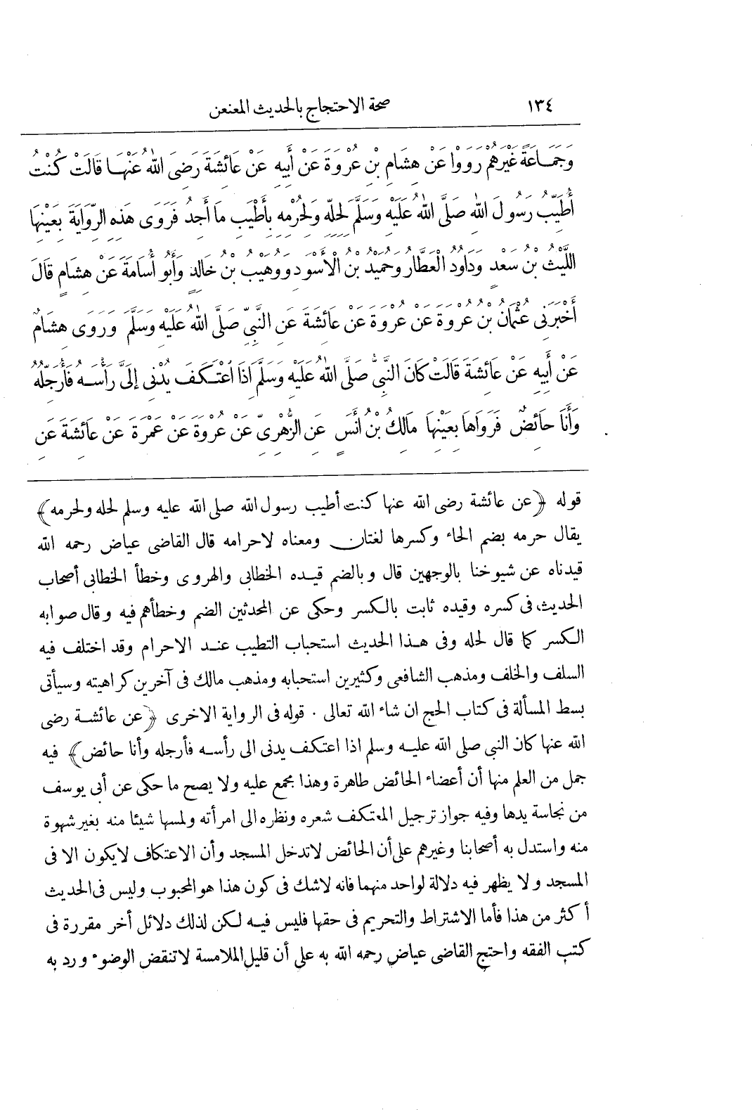 قَوْلُهُ (عَنْ عَائِشَةَ رَضِيَ اللَّهُ عَنْهَا كُنْتُ أُطَيِّبَ رَسُولَ اللَّهِ صَلَّى اللَّهُ عَلَيْهِ وَسَلَّمَ لِحِلِّهِ وَلِحُرْمِهِ) يُقَالُ حُرْمِهِ بِضَمِّ الْحَاءِ وَكَسْرِهَا لُغَتَانِ وَمَعْنَاهُ لِإِحْرَامِهِ قَالَ الْقَاضِي عِيَاضٌ رَحِمَهُ اللَّهُ قَيَّدْنَاهُ عَنْ شُيُوخِنَا بِالْوَجْهَيْنِ قَالَ وَبِالضَّمِّ قيده الخطابى والهروى وَخَطَّأَ الْخَطَّابِيُّ أَصْحَابَ الْحَدِيثِ فِي كَسْرِهِ وَقَيَّدَهُ ثَابِتٌ بِالْكَسْرِ وَحُكِيَ عَنِ الْمُحَدِّثِينَ الضَّمُّ وَخَطَّأَهُمْ فِيهِ وَقَالَ صَوَابُهُ الْكَسْرُ كَمَا قَالَ لِحِلِّهِ وَفِي هَذَا الْحَدِيثِ اسْتِحْبَابُ التَّطَيُّبِ عِنْدَ الْإِحْرَامِ وَقَدِ اخْتَلَفَ فِيهِ السَّلَفُ وَالْخَلَفُ وَمَذْهَبُ الشَّافِعِيِّ وَكَثِيرِينَ اسْتِحْبَابُهُ وَمَذْهَبُ مَالِكٍ فِي آخَرِينَ كَرَاهِيَتُهُ وَسَيَأْتِي بَسْطُ الْمَسْأَلَةِ فِي كِتَابِ الْحَجِّ إِنْ شَاءَ اللَّهُ تَعَالَى قَوْلُهُ فِي الرِّوَايَةِ الْأُخْرَى (عَنْ عَائِشَةَ رَضِيَ اللَّهُ عَنْهَا كَانَ النَّبِيُّ صَلَّى اللَّهُ عَلَيْهِ وَسَلَّمَ إِذَا اعْتَكَفَ يُدْنِي إِلَيَّ رَأْسَهُ فَأُرَجِّلُهُ وَأَنَا حَائِضٌ) فِيهِ جُمَلٌ مِنَ الْعِلْمِ مِنْهَا أَنَّ أَعْضَاءَ الْحَائِضِ طَاهِرَةٌ وَهَذَا مُجْمَعٌ عَلَيْهِ وَلَا يَصِحُّ مَا حُكِيَ عَنْ أَبِي يُوسُفَ مِنْ نَجَاسَةِ يَدِهَا وَفِيهِ جَوَازُ تَرْجِيلِ الْمُعْتَكِفِ شَعْرَهُ وَنَظَرُهُ إِلَى امْرَأَتِهِ وَلَمْسُهَا شَيْئًا مِنْهُ بِغَيْرِ شَهْوَةٍ مِنْهُ وَاسْتَدَلَّ بِهِ أَصْحَابُنَا وَغَيْرُهُمْ عَلَى أَنَّ الْحَائِضَ لَا تَدْخُلُ الْمَسْجِدَ وَأَنَّ الِاعْتِكَافَ لَا يَكُونُ إِلَّا فِي الْمَسْجِدِ وَلَا يَظْهَرُ فِيهِ دَلَالَةٌ لِوَاحِدٍ مِنْهُمَا فَإِنَّهُ لَا شَكَّ فِي كَوْنِ هَذَا هُوَ الْمَحْبُوبَ وَلَيْسَ فِي الْحَدِيثِ أَكْثَرُ مِنْ هَذَا فَأَمَّا الِاشْتِرَاطُ وَالتَّحْرِيمُ فِي حَقِّهَا فَلَيْسَ فِيهِ لَكِنَّ لِذَلِكَ دَلَائِلُ أُخَرُ مُقَرَّرَةٌ فِي كُتُبِ الْفِقْهِ وَاحْتَجَّ الْقَاضِي عِيَاضٌ رَحِمَهُ اللَّهُ بِهِ عَلَى أَنَّ قَلِيلَ الْمُلَامَسَةِ لَا تَنْقُضُ الْوُضُوءَ وَرُدَّ بِهِ