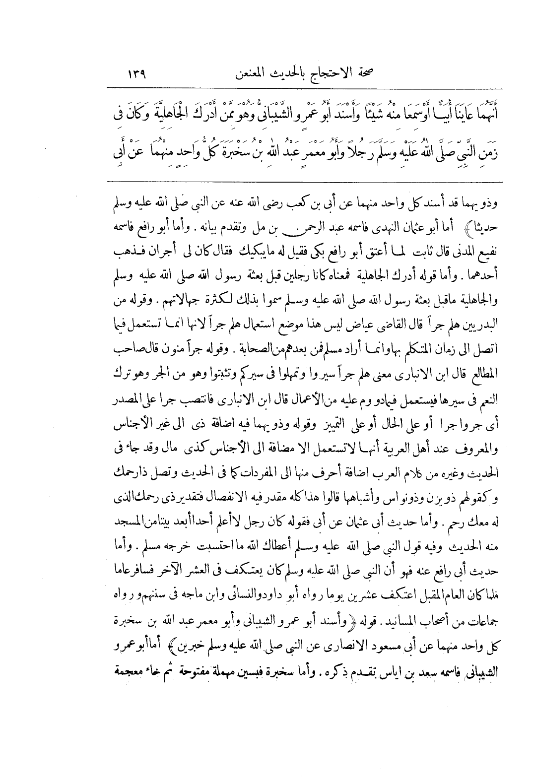 وَذَوِيهِمَا قَدْ أَسْنَدَ كُلُّ وَاحِدٍ مِنْهُمَا عَنْ أُبَيِّ بْنِ كَعْبٍ رَضِيَ اللَّهُ عَنْهُ عَنِ النَّبِيِّ صَلَّى اللَّهُ عَلَيْهِ وَسَلَّمَ حَدِيثًا) أَمَّا أَبُو عُثْمَانَ النَّهْدِيُّ فَاسْمُهُ عَبْدُ الرَّحْمَنِ بْنُ مُلٍّ وَتَقَدَّمَ بَيَانُهُ وَأَمَّا أَبُو رَافِعٍ فَاسْمُهُ نُفَيْعٌ الْمَدَنِيُّ قَالَ ثَابِتٌ لَمَّا أُعْتِقَ أَبُو رَافِعٍ بَكَى فَقِيلَ لَهُ مَا يُبْكِيكَ فَقَالَ كَانَ لِي أَجْرَانِ فَذَهَبَ أَحَدُهُمَا وَأَمَّا قَوْلُهُ أَدْرَكَ الْجَاهِلِيَّةَ فَمَعْنَاهُ كَانَا رَجُلَيْنِ قَبْلَ بَعْثَةِ رَسُولِ اللَّهِ صَلَّى اللَّهُ عَلَيْهِ وَسَلَّمَ وَالْجَاهِلِيَّةُ مَا قَبْلَ بَعْثَةِ رَسُولِ اللَّهِ صَلَّى اللَّهُ عَلَيْهِ وَسَلَّمَ سُمُّوا بِذَلِكَ لِكَثْرَةِ جَهَالَاتِهِمْ وَقَوْلُهُ مِنَ الْبَدْرِيِّينَ هَلُمَّ جَرًّا قَالَ الْقَاضِي عِيَاضٌ لَيْسَ هَذَا مَوْضِعَ اسْتِعْمَالٍ هَلُمَّ جَرًّا لِأَنَّهَا إِنَّمَا تُسْتَعْمَلُ فِيمَا اتَّصَلَ إِلَى زَمَانِ الْمُتَكَلِّمِ بِهَا وَإِنَّمَا أَرَادَ مُسْلِمٌ فَمَنْ بَعْدَهُمْ مِنَ الصَّحَابَةِ وَقَوْلُهُ جَرًّا مَنُونٌ قَالَ صَاحِبِ الْمَطَالِعِ قال بن الْأَنْبَارِيِّ مَعْنَى هَلُمَّ جَرًّا سِيرُوا وَتَمَهَّلُوا فِي سَيْرِكُمْ وَتَثَبَّتُوا وَهُوَ مِنَ الْجَرِّ وَهُوَ تَرْكُ النَّعَمِ فِي سَيْرِهَا فَيُسْتَعْمَلُ فِيمَا دُووِمَ عَلَيْهِ من الأعمال قال بن الْأَنْبَارِيِّ فَانْتَصَبَ جَرًّا عَلَى الْمَصْدَرِ أَيْ جَرُّوا جَرًّا أَوْ عَلَى الْحَالِ أَوْ عَلَى التَّمْيِيزِ وَقَوْلُهُ وَذَوِيهِمَا فِيهِ إِضَافَةُ ذِي إِلَى غَيْرِ الْأَجْنَاسِ وَالْمَعْرُوفُ عِنْدَ أَهْلِ الْعَرَبِيَّةِ أَنَّهَا لَا تُسْتَعْمَلُ إِلَّا مُضَافَةً إِلَى الْأَجْنَاسِ كَذِي مَالٍ وَقَدْ جَاءَ فِي الْحَدِيثِ وَغَيْرِهِ مِنْ كَلَامِ الْعَرَبِ إِضَافَةُ أَحْرُفٍ مِنْهَا إِلَى الْمُفْرَدَاتِ كَمَا فِي الْحَدِيثِ وَتَصِلُ ذَا رَحِمِكَ وَكَقَوْلِهِمْ ذُو يَزَنَ وَذُو نُوَاسٍ وَأَشْبَاهُهَا قَالُوا هَذَا كُلُّهُ مُقَدَّرٌ فِيهِ الِانْفِصَالُ فَتَقْدِيرُ ذِي رَحِمِكَ الَّذِي لَهُ مَعَكَ رَحِمٌ وَأَمَّا حَدِيثُ أَبِي عُثْمَانَ عَنْ أُبَيٍّ فَقَوْلُهُ كَانَ رَجُلٌ لَا أَعْلَمُ أَحَدًا أَبْعَدَ بَيْتًا مِنَ الْمَسْجِدِ مِنْهُ الْحَدِيثَ وَفِيهِ قَوْلُ النَّبِيِّ صَلَّى اللَّهُ عَلَيْهِ وَسَلَّمَ أَعْطَاكَ اللَّهُ مَا احْتَسَبْتَ خرَّجَهُ مُسْلِمٌ وَأَمَّا حَدِيثُ أَبِي رَافِعٍ عَنْهُ فَهُوَ أَنَّ النَّبِيَّ صَلَّى اللَّهُ عَلَيْهِ وَسَلَّمَ كَانَ يَعْتَكِفُ فِي الْعَشْرِ الْأُخَرِ فَسَافَرَ عَامًا فَلَمَّا كَانَ الْعَامُ الْمُقْبِلُ اعْتَكَفَ عِشْرِينَ يَوْمًا رَوَاهُ أَبُو دَاوُدَ والنسائى وبن مَاجَهْ فِي سُنَنِهِمْ وَرَوَاهُ جَمَاعَاتٌ مِنْ أَصْحَابِ الْمَسَانِيدِ قَوْلُهُ (وَأَسْنَدَ أَبُو عَمْرٍو الشَّيْبَانِيُّ وَأَبُو مَعْمَرٍ عَبْدُ اللَّهِ بْنُ سَخْبَرَةَ كُلُّ وَاحِدٍ مِنْهُمَا عَنْ أَبِي مَسْعُودٍ الْأَنْصَارِيِّ عَنِ النَّبِيِّ صَلَّى اللَّهُ عَلَيْهِ وَسَلَّمَ خَبَرَيْنِ) أَمَّا أَبُو عَمْرٍو الشَّيْبَانِيُّ فَاسْمُهُ سَعْدُ بْنُ إِيَاسٍ تَقَدَّمَ ذِكْرُهُ وَأَمَّا سَخْبَرَةُ فَبِسِينٍ مُهْمَلَةٍ مَفْتُوحَةٍ ثُمَّ خَاءٍ مُعْجَمَةٍ