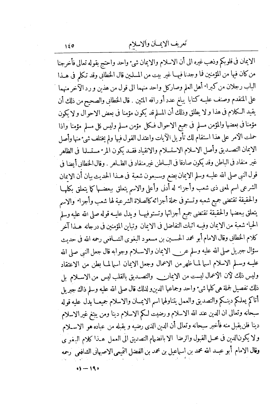 الايمان فى قلوبكم وَذَهَبَ غَيْرُهُ إِلَى أَنَّ الْإِسْلَامَ وَالْإِيمَانَ شَيْءٌ وَاحِدٌ وَاحْتَجَّ بِقَوْلِهِ تَعَالَى فَأَخْرَجْنَا مَنْ كَانَ فِيهَا مِنَ الْمُؤْمِنِينَ فَمَا وَجَدْنَا فِيهَا غَيْرَ بَيْتٍ مِنَ الْمُسْلِمِينَ قَالَ الْخَطَّابِيُّ وَقَدْ تَكَلَّمَ فِي هَذَا الْبَابِ رَجُلَانِ مِنْ كُبَرَاءِ أَهْلِ الْعِلْمِ وَصَارَ كُلُّ وَاحِدٍ مِنْهُمَا إِلَى قَوْلٍ مِنْ هَذَيْنِ وَرَدَّ الْآخَرُ مِنْهُمَا عَلَى الْمُتَقَدِّمِ وَصَنَّفَ عَلَيْهِ كِتَابًا يَبْلُغُ عَدَدُ أَوْرَاقِهِ الْمِئِينَ قَالَ الْخَطَّابِيُّ وَالصَّحِيحُ مِنْ ذَلِكَ أَنْ يُقَيَّدَ الْكَلَامُ فِي هَذَا وَلَا يُطْلَقَ وَذَلِكَ أَنَّ الْمُسْلِمَ قَدْ يَكُونُ مُؤْمِنًا فِي بَعْضِ الْأَحْوَالِ وَلَا يَكُونُ مُؤْمِنًا فِي بَعْضِهَا وَالْمُؤْمِنُ مُسْلِمٌ فِي جَمِيعِ الْأَحْوَالِ فَكُلُّ مُؤْمِنٍ مُسْلِمٌ وَلَيْسَ كُلُّ مُسْلِمٍ مُؤْمِنًا وَإِذَا حَمَلْتَ الْأَمْرَ عَلَى هَذَا اسْتَقَامَ لَكَ تَأْوِيلُ الْآيَاتِ وَاعْتَدَلَ الْقَوْلُ فِيهَا وَلَمْ يَخْتَلِفْ شَيْءٌ مِنْهَا وَأَصْلُ الْإِيمَانِ التَّصْدِيقُ وَأَصْلُ الْإِسْلَامِ الِاسْتِسْلَامُ وَالِانْقِيَادُ فَقَدْ يَكُونُ الْمَرْءُ مُسْتَسْلِمًا فِي الظَّاهِرِ غَيْرَ مُنْقَادٍ فِي الْبَاطِنِ وَقَدْ يَكُونُ صَادِقًا فِي الْبَاطِنِ غَيْرَ مُنْقَادٍ فِي الظَّاهِرِ وَقَالَ الْخَطَّابِيُّ أَيْضًا فِي قَوْلِ النَّبِيِّ صَلَّى اللَّهُ عَلَيْهِ وَسَلَّمَ الْإِيمَانُ بِضْعٌ وَسَبْعُونَ شُعْبَةً فِي هَذَا الْحَدِيثِ بَيَانٌ أَنَّ الْإِيمَانَ الشَّرْعِيَّ اسْمٌ لِمَعْنًى ذِي شُعَبٍ وَأَجْزَاءٍ لَهُ أَدْنَى وَأَعْلَى وَالِاسْمُ يَتَعَلَّقُ بِبَعْضِهَا كَمَا يَتَعَلَّقُ بِكُلِّهَا وَالْحَقِيقَةُ تَقْتَضِي جَمِيعَ شُعَبِهِ وَتَسْتَوْفِي جُمْلَةَ أَجْزَائِهِ كَالصَّلَاةِ الشَّرْعِيَّةِ لَهَا شُعَبٌ وَأَجْزَاءٌ وَالِاسْمُ يَتَعَلَّقُ بِبَعْضِهَا وَالْحَقِيقَةُ تَقْتَضِي جَمِيعَ أَجْزَائِهَا وَتَسْتَوْفِيهَا وَيَدُلُّ عَلَيْهِ قَوْلُهُ صَلَّى اللَّهُ عَلَيْهِ وَسَلَّمَ الْحَيَاءُ شُعْبَةً مِنَ الْإِيمَانِ وَفِيهِ إِثْبَاتُ التَّفَاضُلِ فِي الْإِيمَانِ وَتَبَايُنُ الْمُؤْمِنِينَ فِي دَرَجَاتِهِ هَذَا آخِرُ كَلَامِ الْخَطَّابِيِّ وَقَالَ الْإِمَامُ أَبُو مُحَمَّدٍ الْحُسَيْنُ بْنُ مَسْعُودٍ الْبَغَوِيُّ الشَّافِعِيُّ رَحِمَهُ اللَّهُ فِي حَدِيثِ سُؤَالِ جِبْرِيلَ صَلَّى اللَّهُ عَلَيْهِ وَسَلَّمَ عَنِ الْإِيمَانِ وَالْإِسْلَامِ وَجَوَابِهِ قَالَ جَعَلَ النَّبِيُّ صَلَّى اللَّهُ عَلَيْهِ وَسَلَّمَ الْإِسْلَامَ اسْمًا لِمَا ظَهَرَ مِنَ الْأَعْمَالِ وَجَعَلَ الْإِيمَانَ اسْمًا لِمَا بَطَنَ مِنَ الِاعْتِقَادِ وَلَيْسَ ذَلِكَ لِأَنَّ الْأَعْمَالَ لَيْسَتْ مِنَ الْإِيمَانِ وَالتَّصْدِيقَ بِالْقَلْبِ لَيْسَ مِنَ الْإِسْلَامِ بَلْ ذَلِكَ تَفْصِيلٌ لِجُمْلَةٍ هِيَ كُلُّهَا شَيْءٌ وَاحِدٌ وَجِمَاعُهَا الدِّينُ وَلِذَلِكَ قَالَ صَلَّى اللَّهُ عَلَيْهِ وَسَلَّمَ ذَاكَ جِبْرِيلُ أَتَاكُمْ يُعَلِّمُكُمْ دِينَكُمْ وَالتَّصْدِيقُ وَالْعَمَلُ يَتَنَاوَلُهُمَا اسْمُ الْإِيمَانِ وَالْإِسْلَامِ جَمِيعًا يَدُلُّ عَلَيْهِ قَوْلُهُ سُبْحَانَهُ وَتَعَالَى إِنَّ الدِّينَ عِنْدَ اللَّهِ الْإِسْلَامُ وَرَضِيتُ لَكُمُ الْإِسْلَامَ دينا وَمَنْ يَبْتَغِ غَيْرَ الْإِسْلَامِ دِينًا فَلَنْ يُقْبَلَ منه فَأَخْبَرَ سُبْحَانَهُ وَتَعَالَى أَنَّ الدِّينَ الَّذِي رَضِيَهُ وَيَقْبَلُهُ مِنْ عِبَادِهِ هُوَ الْإِسْلَامُ وَلَا يَكُونُ الدِّينُ فِي مَحَلِّ الْقَبُولِ وَالرِّضَا إِلَّا بِانْضِمَامِ التَّصْدِيقِ إِلَى الْعَمَلِ هَذَا كَلَامُ الْبَغَوِيِّ وَقَ