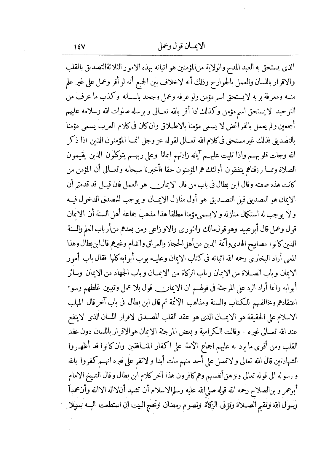 الَّذِي يَسْتَحِقُّ بِهِ الْعَبْدُ الْمَدْحَ وَالْوِلَايَةَ مِنَ الْمُؤْمِنِينَ هُوَ إِتْيَانُهُ بِهَذِهِ الْأُمُورِ الثَّلَاثَةِ التَّصْدِيقُ بِالْقَلْبِ وَالْإِقْرَارُ بِاللِّسَانِ وَالْعَمَلُ بِالْجَوَارِحِ وَذَلِكَ أَنَّهُ لَا خِلَافَ بَيْنَ الْجَمِيعِ أَنَّهُ لَوْ أَقَرَّ وَعَمِلَ عَلَى غَيْرِ عِلْمٍ مِنْهُ وَمَعْرِفَةٍ بِرَبِّهِ لَا يَسْتَحِقُّ اسْمَ مُؤْمِنٍ وَلَوْ عَرَفَهُ وَعَمِلَ وَجَحَدَ بِلِسَانِهِ وَكَذَبَ مَا عَرَفَ مِنَ التَّوْحِيدِ لَا يَسْتَحِقُّ اسْمَ مُؤْمِنٍ وَكَذَلِكَ إِذَا أَقَرَّ بِاللَّهِ تَعَالَى وَبِرُسُلِهِ صَلَوَاتُ اللَّهِ وَسَلَامُهُ عَلَيْهِمْ أَجْمَعِينَ وَلَمْ يَعْمَلْ بِالْفَرَائِضِ لَا يُسَمَّى مُؤْمِنًا بِالْإِطْلَاقِ وَإِنْ كَانَ فِي كَلَامِ الْعَرَبِ يُسَمَّى مُؤْمِنًا بِالتَّصْدِيقِ فَذَلِكَ غَيْرُ مُسْتَحَقٍّ فِي كَلَامِ اللَّهِ تَعَالَى لِقَوْلِهِ عَزَّ وَجَلَّ إِنَّمَا الْمُؤْمِنُونَ الَّذِينَ إِذَا ذُكِرَ اللَّهُ وَجِلَتْ قُلُوبُهُمْ وَإِذَا تُلِيَتْ عَلَيْهِمْ آيَاتُهُ زَادَتْهُمْ إِيمَانًا وَعَلَى رَبِّهِمْ يَتَوَكَّلُونَ الَّذِينَ يُقِيمُونَ الصَّلَاةَ وَمِمَّا رَزَقْنَاهُمْ يُنْفِقُونَ أولئك هم المؤمنون حقا فَأَخْبَرَنَا سُبْحَانَهُ وَتَعَالَى أَنَّ الْمُؤْمِنَ مَنْ كَانَتْ هذه صفته وقال بن بَطَّالٍ فِي بَابِ مَنْ قَالَ الْإِيمَانُ هُوَ الْعَمَلُ فَإِنْ قِيلَ قَدْ قَدَّمْتُمْ أَنَّ الْإِيمَانَ هُوَ التَّصْدِيقُ قِيلَ التَّصْدِيقُ هُوَ أَوَّلُ مَنَازِلِ الْإِيمَانِ وَيُوجِبُ لِلْمُصَدِّقِ الدُّخُولَ فِيهِ وَلَا يُوجِبُ لَهُ اسْتِكْمَالَ مَنَازِلِهِ وَلَا يُسَمَّى مُؤْمِنًا مُطْلَقًا هَذَا مَذْهَبُ جَمَاعَةِ أَهْلِ السُّنَّةِ أَنَّ الْإِيمَانَ قَوْلٌ وَعَمَلٌ قَالَ أَبُو عُبَيْدٍ وَهُوَ قَوْلُ مَالِكٍ وَالثَّوْرِيِّ وَالْأَوْزَاعِيِّ وَمَنْ بَعْدَهُمْ مِنْ أَرْبَابِ الْعِلْمِ وَالسُّنَّةِ الَّذِينَ كَانُوا مَصَابِيحَ الْهُدَى وَأَئِمَّةَ الدِّينِ مِنْ أَهْلِ الْحِجَازِ وَالْعِرَاقِ وَالشَّامِ وَغَيْرِهِمْ قال بن بَطَّالٍ وَهَذَا الْمَعْنَى أَرَادَ الْبُخَارِيُّ رَحِمَهُ اللَّهُ إِثْبَاتَهُ فِي كِتَابِ الْإِيمَانِ وَعَلَيْهِ بَوَّبَ أَبْوَابَهُ كُلَّهَا فَقَالَ بَابُ أُمُورِ الْإِيمَانِ وَبَابُ الصَّلَاةُ مِنَ الْإِيمَانِ وَبَابُ الزَّكَاةُ مِنَ الْإِيمَانِ وَبَابُ الْجِهَادُ مِنَ الْإِيمَانِ وَسَائِرُ أَبْوَابِهِ وَإِنَّمَا أَرَادَ الرَّدَّ عَلَى الْمُرْجِئَةِ فِي قَوْلِهِمْ إِنَّ الْإِيمَانَ قَوْلٌ بِلَا عَمَلٍ وَتَبْيِينَ غَلَطِهِمْ وَسُوءَ اعْتِقَادِهِمْ وَمُخَالَفَتِهِمْ لِلْكِتَابِ وَالسُّنَّةِ وَمَذَاهِبِ الْأَئِمَّةِ ثُمَّ قَالَ بن بَطَّالٍ فِي بَابٍ آخَرَ قَالَ الْمُهَلَّبُ الْإِسْلَامُ عَلَى الْحَقِيقَةِ هُوَ الْإِيمَانُ الَّذِي هُوَ عَقْدُ الْقَلْبِ الْمُصَدِّقِ لِإِقْرَارِ اللِّسَانِ الَّذِي لَا يَنْفَعُ عِنْدَ اللَّهِ تَعَالَى غَيْرُهُ وَقَالَتِ الْكَرَّامِيَّةُ وَبَعْضُ الْمُرْجِئَةُ الْإِيمَانُ هُوَ الْإِقْرَارُ بِاللِّسَانِ دُونَ عَقْدِ الْقَلْبِ وَمِنْ أَقْوَى مَا يُرَدُّ بِهِ عَلَيْهِمْ إِجْمَاعُ الْأُمَّةِ عَلَى إِكْفَارِ الْمُنَافِقِينَ وَإِنْ كَانُوا قَدْ أَظْهَرُوا الشَّهَادَتَيْنِ قَالَ اللَّهُ تَعَالَى وَلَا تُصَلِّ عَلَى أَحَدٍ مِنْهُمْ مَاتَ أَبَدًا وَلَا تَقُمْ عَلَى قَبْرِهِ إِنَّهُمْ كَفَرُوا بِاللَّهِ وَرَسُولِهِ إِلَى قَوْلِهِ تَعَالَى وَتَزْهَقَ أَنْفُسُهُمْ وَهُمْ كَافِرُونَ هذا آخر كلام بن بَطَّالٍ وَقَالَ الشَّيْخُ الْإِمَامُ أَبُو عَمْرِو بْنُ الصَّلَاحِ رَحِمَهُ اللَّهُ قَوْلُهُ صَلَّى اللَّهُ عَلَيْهِ وَسَلَّمَ الاسلام أن تشهد أن لااله إِلَ