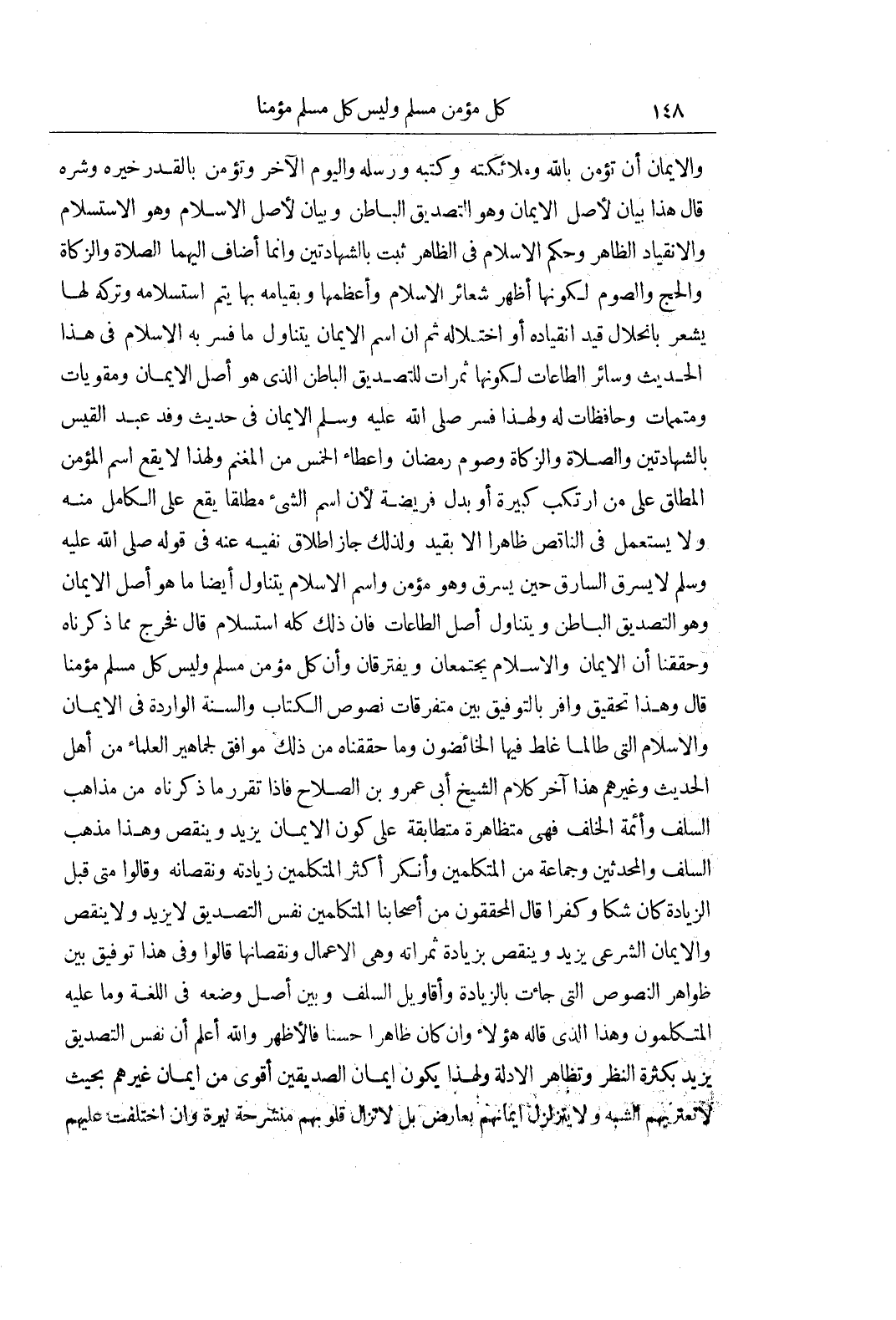 وَالْإِيمَانُ أَنْ تُؤْمِنَ بِاللَّهِ وَمَلَائِكَتِهِ وَكُتُبِهِ وَرُسُلِهِ وَالْيَوْمِ الْآخِرِ وَتُؤْمِنَ بِالْقَدَرِ خَيْرِهِ وَشَرِّهِ قَالَ هَذَا بَيَانٌ لِأَصْلِ الْإِيمَانِ وَهُوَ التَّصْدِيقُ الْبَاطِنُ وَبَيَانٌ لِأَصْلِ الْإِسْلَامِ وَهُوَ الِاسْتِسْلَامُ وَالِانْقِيَادُ الظَّاهِرُ وَحُكْمُ الْإِسْلَامِ فِي الظَّاهِرِ ثَبَتَ بِالشَّهَادَتَيْنِ وَإِنَّمَا أَضَافَ إِلَيْهِمَا الصَّلَاةَ وَالزَّكَاةَ وَالْحَجَّ وَالصَّوْمَ لِكَوْنِهَا أَظْهَرَ شَعَائِرِ الْإِسْلَامِ وَأَعْظَمَهَا وَبِقِيَامِهِ بِهَا يَتِمُّ اسْتِسْلَامُهُ وَتَرْكُهُ لَهَا يُشْعِرُ بِانْحِلَالِ قَيْدِ انْقِيَادِهِ أَوِ اخْتِلَالِهِ ثُمَّ إِنَّ اسْمَ الْإِيمَانِ يَتَنَاوَلُ مَا فُسِّرَ بِهِ الْإِسْلَامُ فِي هَذَا الْحَدِيثِ وسائر الطاعات لكونها ثَمَرَاتٌ لِلتَّصْدِيقِ الْبَاطِنِ الَّذِي هُوَ أَصْلُ الْإِيمَانِ وَمُقَوِّيَاتٌ وَمُتَمِّمَاتٌ وَحَافِظَاتٌ لَهُ وَلِهَذَا فَسَّرَ صَلَّى اللَّهُ عَلَيْهِ وَسَلَّمَ الْإِيمَانُ فِي حَدِيثِ وَفْدِ عَبْدِ الْقَيْسِ بِالشَّهَادَتَيْنِ وَالصَّلَاةِ وَالزَّكَاةِ وَصَوْمِ رَمَضَانَ وَإِعْطَاءِ الْخُمُسِ مِنَ الْمَغْنَمِ وَلِهَذَا لَا يَقَعُ اسْمُ الْمُؤْمِنِ الْمُطْلَقِ عَلَى مَنِ ارْتَكَبَ كَبِيرَةً أَوْ بَدَّلَ فَرِيضَةً لِأَنَّ اسْمَ الشَّيْءِ مُطْلَقًا يَقَعُ عَلَى الْكَامِلِ مِنْهُ وَلَا يُسْتَعْمَلُ فِي النَّاقِصِ ظَاهِرًا إِلَّا بِقَيْدٍ وَلِذَلِكَ جَازَ إِطْلَاقُ نَفْيِهِ عَنْهُ فِي قَوْلِهِ صَلَّى اللَّهُ عَلَيْهِ وَسَلَّمَ لَا يَسْرِقُ السَّارِقُ حِينَ يَسْرِقُ وَهُوَ مُؤْمِنٌ وَاسْمُ الْإِسْلَامِ يَتَنَاوَلُ أَيْضًا مَا هُوَ أَصْلُ الْإِيمَانِ وَهُوَ التَّصْدِيقُ الْبَاطِنُ وَيَتَنَاوَلُ أَصْلَ الطَّاعَاتِ فَإِنَّ ذَلِكَ كُلَّهُ اسْتِسْلَامٌ قَالَ فَخَرَجَ مِمَّا ذَكَرْنَاهُ وَحَقَقْنَا أَنَّ الْإِيمَانَ وَالْإِسْلَامَ يَجْتَمِعَانِ وَيَفْتَرِقَانِ وَأَنَّ كُلَّ مُؤْمِنٍ مُسْلِمٌ وَلَيْسَ كُلُّ مُسْلِمٍ مُؤْمِنًا قَالَ وَهَذَا تَحْقِيقٌ وَافِرٌ بِالتَّوْفِيقِ بَيْنَ مُتَفَرِّقَاتِ نُصُوصِ الْكِتَابِ وَالسُّنَّةِ الْوَارِدَةِ فِي الْإِيمَانِ وَالْإِسْلَامِ الَّتِي طَالَمَا غَلِطَ فِيهَا الْخَائِضُونَ وَمَا حَقَّقْنَاهُ مِنْ ذَلِكَ مُوَافِقٌ لِجَمَاهِيرِ الْعُلَمَاءِ مِنْ أَهْلِ الْحَدِيثِ وَغَيْرِهِمْ هَذَا آخِرُ كَلَامِ الشَّيْخِ أَبِي عَمْرِو بْنِ الصَّلَاحِ فَإِذَا تَقَرَّرَ مَا ذَكَرْنَاهُ مِنْ مَذَاهِبِ السَّلَفِ وَأَئِمَّةِ الْخَلَفِ فَهِيَ مُتَظَاهِرَةٌ مُتَطَابِقَةٌ عَلَى كَوْنِ الْإِيمَانِ يَزِيدُ وَيَنْقُصُ وَهَذَا مَذْهَبُ السَّلَفِ وَالْمُحَدِّثِينَ وَجَمَاعَةٍ مِنَ الْمُتَكَلِّمِينَ وَأَنْكَرَ أَكْثَرُ الْمُتَكَلِّمِينَ زِيَادَتَهُ وَنُقْصَانَهُ وَقَالُوا مَتَى قَبِلَ الزِّيَادَةَ كَانَ شَكًّا وَكُفْرًا قَالَ الْمُحَقِّقُونَ مِنْ أَصْحَابِنَا الْمُتَكَلِّمِينَ نَفْسُ التَّصْدِيقِ لَا يَزِيدُ وَلَا يَنْقُصُ وَالْإِيمَانُ الشَّرْعِيُّ يَزِيدُ وَيَنْقُصُ بِزِيَادَةِ ثَمَرَاتِهِ وَهِيَ الْأَعْمَالُ وَنُقْصَانِهَا قَالُوا وَفِي هَذَا تَوْفِيقٌ بَيْنَ ظَوَاهِرِ النُّصُوصِ الَّتِي جَاءَتْ بِالزِّيَادَةِ وَأَقَاوِيلِ السَّلَفِ وَبَيْنَ أَصْلِ وَضْعِهِ فِي اللُّغَةِ وَمَا عَلَيْهِ الْمُتَكَلِّمُونَ وَهَذَا الَّذِي قَالَهُ هَؤُلَاءِ وَإِنْ كَانَ ظَاهِرًا حَسَنًا فَالْأَظْهَرُ وَاللَّهُ أَعْلَمُ أَنَّ نَفْسَ التَّصْدِيقِ يَزِيدُ بِكَثْرَةِ النَّظَرِ وَتَظَاهُرِ الْأَدِلَّةِ وَلِهَذَا يَكُونُ إِيمَانُ الصِّدِّيقِينَ أَقْوَى مِنْ إِيمَانِ غَيْرِهِمْ بِحَيْثُ لَا تَعْتَرِيهِمُ الشُّبَهُ وَلَا