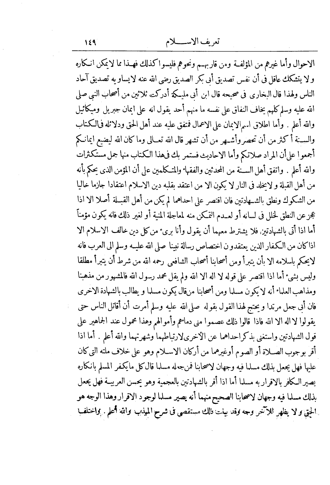 الْأَحْوَالُ وَأَمَّا غَيْرُهُمْ مِنَ الْمُؤَلَّفَةِ وَمَنْ قَارَبَهُمْ وَنَحْوِهِمْ فَلَيْسُوا كَذَلِكَ فَهَذَا مِمَّا لَا يُمْكِنُ إِنْكَارُهُ وَلَا يَتَشَكَّكُ عَاقِلٌ فِي أَنَّ نَفْسَ تَصْدِيقِ أَبِي بَكْرٍ الصِّدِّيقِ رَضِيَ اللَّهُ عَنْهُ لَا يُسَاوِيهِ تَصْدِيقُ آحَادِ النَّاسِ وَلِهَذَا قَالَ البخارى فى صحيحه قال بن أَبِي مُلَيْكَةَ أَدْرَكْتُ ثَلَاثِينَ مِنْ أَصْحَابِ النَّبِيِّ صَلَّى اللَّهُ عَلَيْهِ وَسَلَّمَ كُلُّهُمْ يَخَافُ النِّفَاقَ عَلَى نَفْسِهِ مَا مِنْهُمْ أَحَدٌ يَقُولُ إِنَّهُ عَلَى إِيمَانِ جِبْرِيلَ وَمِيكَائِيلَ وَاللَّهُ أَعْلَمُ وَأَمَّا إِطْلَاقُ اسْمِ الْإِيمَانِ عَلَى الْأَعْمَالِ فَمُتَّفَقٌ عَلَيْهِ عِنْدَ أَهْلِ الْحَقِّ وَدَلَائِلُهُ فِي الْكِتَابِ وَالسُّنَّةِ أَكْثَرُ مِنْ أَنْ تُحْصَرَ وَأَشْهَرُ مِنْ أَنْ تُشْهَرَ قَالَ اللَّهُ تَعَالَى وَمَا كَانَ اللَّهُ ليضيع ايمانكم أَجْمَعُوا عَلَى أَنَّ الْمُرَادَ صَلَاتَكُمْ وَأَمَّا الْأَحَادِيثُ فَسَتَمُرُّ بِكَ فِي هَذَا الْكِتَابِ مِنْهَا جُمَلٌ مُسْتَكْثَرَاتٌ وَاللَّهُ أَعْلَمُ وَاتَّفَقَ أَهْلُ السُّنَّةِ مِنَ الْمُحَدِّثِينَ وَالْفُقَهَاءِ وَالْمُتَكَلِّمِينَ عَلَى أَنَّ الْمُؤْمِنَ الَّذِي يُحْكَمُ بِأَنَّهُ مِنْ أَهْلِ الْقِبْلَةِ وَلَا يُخَلَّدُ فِي النَّارِ لَا يَكُونُ إِلَّا مَنِ اعْتَقَدَ بِقَلْبِهِ دِينَ الْإِسْلَامِ اعْتِقَادًا جَازِمًا خَالِيًا مِنَ الشُّكُوكِ وَنَطَقَ بِالشَّهَادَتَيْنِ فَإِنِ اقْتَصَرَ عَلَى إِحْدَاهُمَا لَمْ يَكُنْ مِنْ أَهْلِ الْقِبْلَةِ أَصْلًا إِلَّا إِذَا عَجَزَ عَنِ النُّطْقِ لِخَلَلٍ فِي لِسَانِهِ أَوْ لِعَدَمِ التَّمَكُّنِ مِنْهُ لِمُعَاجَلَةِ الْمَنِيَّةِ أَوْ لِغَيْرِ ذَلِكَ فَإِنَّهُ يَكُونُ مُؤْمِنًا أَمَّا إِذَا أَتَى بِالشَّهَادَتَيْنِ فَلَا يُشْتَرَطُ مَعَهُمَا أَنْ يَقُولَ وَأَنَا بَرِيءٌ مِنْ كُلِّ دِينٍ خَالَفَ الْإِسْلَامَ إِلَّا إِذَا كَانَ مِنَ الْكُفَّارِ الَّذِينَ يَعْتَقِدُونَ اخْتِصَاصَ رِسَالَةِ نَبِيِّنَا صَلَّى اللَّهُ عَلَيْهِ وَسَلَّمَ إِلَى الْعَرَبِ فَإِنَّهُ لَا يُحْكَمُ بِإِسْلَامِهِ إِلَّا بِأَنْ يَتَبَرَّأَ وَمِنْ أَصْحَابِنَا أَصْحَابِ الشَّافِعِيِّ رَحِمَهُ اللَّهُ مَنْ شَرَطَ أَنْ يَتَبَرَّأَ مُطْلَقًا وَلَيْسَ بِشَيْءٍ أَمَّا إِذَا اقْتَصَرَ عَلَى قَوْلِهِ لَا إِلَهَ إِلَّا اللَّهُ وَلَمْ يَقُلْ مُحَمَّدٌ رَسُولُ اللَّهِ فَالْمَشْهُورُ مِنْ مَذْهَبِنَا وَمَذَاهِبِ الْعُلَمَاءِ أَنَّهُ لايكون مُسْلِمًا وَمِنْ أَصْحَابِنَا مَنْ قَالَ يَكُونُ مُسْلِمًا وَيُطَالَبُ بِالشَّهَادَةِ الْأُخْرَى فَإِنْ أَبَى جُعِلَ مُرْتَدًّا وَيُحْتَجُّ لِهَذَا الْقَوْلِ بِقَوْلِهِ صَلَّى اللَّهُ عَلَيْهِ وَسَلَّمَ أُمِرْتُ أَنْ أُقَاتِلَ النَّاسَ حَتَّى يَقُولُوا لَا إِلَهَ إِلَّا اللَّهُ فَإِذَا قَالُوا ذَلِكَ عَصَمُوا مِنِّي دِمَاءَهُمْ وَأَمْوَالَهُمْ وَهَذَا مَحْمُولٌ عِنْدَ الْجَمَاهِيرِ عَلَى قَوْلِ الشَّهَادَتَيْنِ وَاسْتَغْنَى بِذِكْرِ إِحْدَاهُمَا عَنِ الْأُخْرَى لِارْتِبَاطِهِمَا وَشُهْرَتِهِمَا وَاللَّهُ أَعْلَمُ أَمَّا إِذَا أَقَرَّ بِوُجُوبِ الصَّلَاةِ أَوِ الصَّوْمِ أَوْ غَيْرِهِمَا مِنْ أَرْكَانِ الْإِسْلَامِ وَهُوَ عَلَى خِلَافِ مِلَّتِهِ الَّتِي كَانَ عَلَيْهَا فَهَلْ يُجْعَلُ بِذَلِكَ مُسْلِمًا فِيهِ وَجْهَانِ لِأَصْحَابِنَا فَمَنْ جَعَلَهُ مُسْلِمًا قَالَ كُلُّ مَا يَكْفُرُ الْمُسْلِمُ بِإِنْكَارِهِ يَصِيرُ الْكَافِرُ بِالْإِقْرَارِ بِهِ مُسْلِمًا أَمَّا إِذَا أَقَرَّ بِالشَّهَادَتَيْنِ بِالْعَجَمِيَّةِ وَهُوَ يُحْسِنُ الْعَرَبِيَّةَ فَهَلْ يُجْعَلُ بِذَلِكَ مُسْلِمًا فِيهِ 