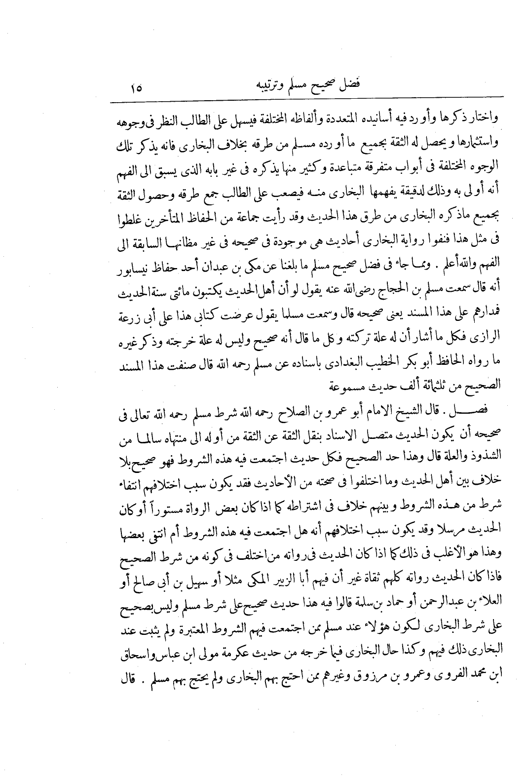 قال الشَّيْخُ الْإِمَامُ أَبُو عَمْرِو بْنُ الصَّلَاحِ رَحِمَهُ الله شرط مسلم رحمه الله تعالى في صحيحه أن يكون الحديث متصل الاسناد بنقل الثقة عن الثقة من أوله إلى منتهاه سالما من الشذوذ والعلة قال وهذا حد الصحيح فكل حديث اجتمعت فيه هذه الشروط فهو صحيح بلا خلاف بين أهل الحديث وما اختلفوا في صحته من الأحاديث فقد يكون سبب اختلافهم انتفاء شرط من هذه الشروط وبينهم خلاف في اشتراطه كما اذا كان بعض الرواة مستورا أو كان الحديث مرسلا وقد يكون سبب اختلافهم أنه هل اجتمعت فيه هذه الشروط أم انتفى بعضها وهذا هو الأغلب في ذلك كما اذا كان الحديث في رواته من اختلف في كونه من شرط الصحيح فاذا كان الحديث رواته كلهم ثقات غير أن فيهم أبا الزبير المكي مثلا أو سهيل بن أبي صالح أو العلاء بن عبد الرحمن أو حماد بن سلمة قالوا فيه هذا حديث صحيح على شرط مسلم وليس بصحيح على شرط البخاري لكون هؤلاء عند مسلم ممن اجتمعت فيهم الشروط المعتبرة ولم يثبت عند البخاري ذلك فيهم وكذا حال البخاري فيما خرجه من حديث عكرمة مولى بن عباس واسحاق بن محمد الفروي وعمرو بن مرزوق وغيرهم ممن احتج بهم البخاري ولم يحتج بهم مسلم قال