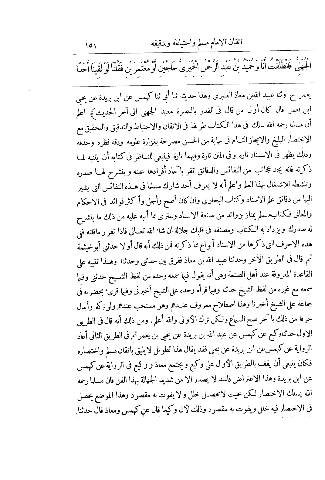 يعمر ح وثنا عُبَيْدُ اللَّهِ بْنُ مُعَاذٍ الْعَنْبَرِيُّ وَهَذَا حَدِيثُهُ ثنا أبى ثنا كهمس عن بن بُرَيْدَةَ عَنْ يَحْيَى بْنِ يَعْمَرَ قَالَ كَانَ أَوَّلَ مَنْ قَالَ فِي الْقَدَرِ بِالْبَصْرَةِ مَعْبَدٌ الْجُهَنِيُّ إِلَى آخِرِ الْحَدِيثِ) اعْلَمْ أَنَّ مُسْلِمًا رَحِمَهُ اللَّهُ سَلَكَ فِي هَذَا الْكِتَابِ طَرِيقَةً فِي الْإِتْقَانِ وَالِاحْتِيَاطِ وَالتَّدْقِيقِ وَالتَّحْقِيقِ مَعَ الِاخْتِصَارِ الْبَلِيغِ وَالْإِيجَازِ التَّامِّ فِي نِهَايَةٍ مِنَ الْحُسْنِ مُصَرِّحَةً بِغَزَارَةِ عُلُومِهِ وَدِقَّةِ نَظَرِهِ وَحِذْقِهِ وَذَلِكَ يَظْهَرُ فِي الْإِسْنَادِ تَارَةً وَفِي الْمَتْنِ تَارَةً وَفِيهِمَا تَارَةً فَيَنْبَغِي لِلنَّاظِرِ فِي كِتَابِهِ أَنْ يَتَنَبَّهَ لِمَا ذَكَرْتُهُ فَإِنَّهُ يَجِدُ عَجَائِبَ مِنَ النَّفَائِسِ وَالدَّقَائِقِ تَقَرُّ بِآحَادِ أَفْرَادِهَا عَيْنُهُ وَيَنْشَرِحُ لَهَا صَدْرُهُ وَتُنَشِّطُهُ لِلِاشْتِغَالِ بِهَذَا الْعِلْمِ وَاعْلَمْ أَنَّهُ لَا يُعْرَفُ أَحَدٌ شَارَكَ مُسْلِمًا فِي هَذِهِ النَّفَائِسِ الَّتِي يُشِيرُ إِلَيْهَا مِنْ دَقَائِقِ عِلْمِ الْإِسْنَادِ وَكِتَابُ الْبُخَارِيِّ وَإِنْ كَانَ أَصَحَّ وَأَجَلَّ وَأَكْثَرَ فَوَائِدَ فِي الْأَحْكَامِ وَالْمَعَانِي فَكِتَابُ مُسْلِمٍ يَمْتَازُ بِزَوَائِدَ مِنْ صَنْعَةِ الْإِسْنَادِ وَسَتَرَى مِمَّا أُنَبِّهُ عَلَيْهِ مِنْ ذَلِكَ مَا يَنْشَرِحُ لَهُ صَدْرُكَ وَيَزْدَادُ بِهِ الْكِتَابُ وَمُصَنِّفُهُ فِي قَلْبِكَ جَلَالَةً إِنْ شَاءَ اللَّهُ تَعَالَى فَإِذَا تَقَرَّرَ مَا قُلْتُهُ فَفِي هَذِهِ الْأَحْرُفِ الَّتِي ذَكَرَهَا مِنَ الْإِسْنَادِ أَنْوَاعٌ مِمَّا ذَكَرْتُهُ فَمِنْ ذَلِكَ أَنَّهُ قَالَ أَوَّلًا حَدَّثَنِي أَبُو خَيْثَمَةَ ثُمَّ قَالَ فِي الطَّرِيقِ الْآخَرِ وَحَدَّثَنَا عُبَيْدُ اللَّهِ بْنُ مُعَاذٍ فَفَرَّقَ بَيْنَ حَدَّثَنِي وَحَدَّثَنَا وَهَذَا تَنْبِيهٌ عَلَى الْقَاعِدَةِ الْمَعْرُوفَةِ عِنْدَ أَهْلِ الصَّنْعَةِ وَهِيَ أَنَّهُ يَقُولُ فِيمَا سَمِعَهُ وَحْدَهُ مِنْ لَفْظِ الشَّيْخِ حَدَّثَنِي وَفِيمَا سَمِعَهُ مَعَ غَيْرِهِ مِنْ لَفْظِ الشَّيْخِ حَدَّثَنَا وَفِيمَا قَرَأَهُ وَحْدَهُ عَلَى الشَّيْخِ أَخْبَرَنِي وَفِيمَا قُرِئَ بِحَضْرَتِهِ فِي جَمَاعَةٍ عَلَى الشَّيْخِ أَخْبَرَنَا وَهَذَا اصْطِلَاحٌ مَعْرُوفٌ عِنْدَهُمْ وَهُوَ مُسْتَحَبٌّ عِنْدَهُمْ وَلَوْ تَرَكَهُ وَأَبْدَلَ حَرْفًا مِنْ ذَلِكَ بِآخَرَ صَحَّ السَّمَاعُ وَلَكِنْ تَرَكَ الْأَوْلَى وَاللَّهُ أَعْلَمُ وَمِنْ ذَلِكَ أَنَّهُ قَالَ فِي الطَّرِيقِ الْأَوَّلِ حَدَّثَنَا وَكِيعٌ عَنْ كَهْمَسٍ عَنْ عَبْدِ اللَّهِ بْنِ بُرَيْدَةَ عَنْ يَحْيَى بْنِ يَعْمَرَ ثُمَّ فِي الطَّرِيقِ الثانى أعاد الرواية عن كهمس عن بن بُرَيْدَةَ عَنْ يَحْيَى فَقَدْ يُقَالُ هَذَا تَطْوِيلٌ لَا يَلِيقُ بِإِتْقَانِ مُسْلِمٍ وَاخْتِصَارِهِ فَكَانَ يَنْبَغِي أَنْ يَقِفَ بِالطَّرِيقِ الْأَوَّلِ عَلَى وَكِيعٍ وَيَجْتَمِعُ مُعَاذٌ وَوَكِيعٌ فِي الرِّوَايَةِ عَنْ كَهْمَسٍ عَنِ بن بُرَيْدَةَ وَهَذَا الِاعْتِرَاضُ فَاسِدٌ لَا يَصْدُرُ إِلَّا مِنْ شَدِيدِ الْجَهَالَةِ بِهَذَا الْفَنِّ فَإِنَّ مُسْلِمًا رَحِمَهُ اللَّهُ يَسْلُكُ الِاخْتِصَارَ لَكِنْ بِحَيْثُ لَا يَحْصُلُ خَلَلٌ وَلَا يَفُوتُ بِهِ مَقْصُودٌ وَهَذَا الْمَوْضِعُ يَحْصُلُ فِي الِاخْتِصَارِ فِيهِ خَلَلٌ وَيَفُوتُ بِهِ مَقْصُودٌ وَذَلِكَ لِأَنَّ وَكِيعًا قَالَ عَنْ كَهْمَسٍ وَمُعَاذٌ قَالَ حَدَّثَنَا