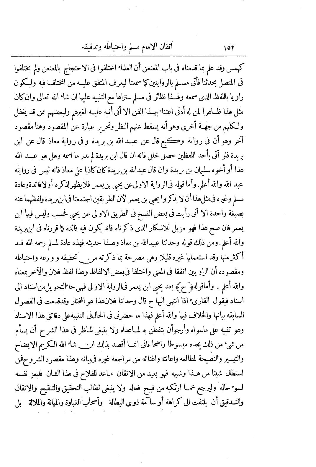 كَهْمَسٌ وَقَدْ عُلِمَ بِمَا قَدَّمْنَاهُ فِي بَابِ المعنعن أن العلماء اختلفوا فى الاحتجاج بالمعنعن ولم يختلفوا فى المتصل بحدثنا فَأَتَى مُسْلِمٌ بِالرِّوَايَتَيْنِ كَمَا سُمِعَتَا لِيُعْرَفَ الْمُتَّفَقُ عَلَيْهِ مِنَ الْمُخْتَلَفِ فِيهِ وَلِيَكُونَ رَاوِيًا بِاللَّفْظِ الَّذِي سَمِعَهُ وَلِهَذَا نَظَائِرُ فِي مُسْلِمٍ سَتَرَاهَا مَعَ التَّنْبِيهِ عَلَيْهَا إِنْ شَاءَ اللَّهُ تَعَالَى وَإِنْ كَانَ مِثْلُ هَذَا ظَاهِرًا لِمَنْ لَهُ أَدْنَى اعْتِنَاءٍ بِهَذَا الْفَنِّ إِلَّا أَنِّي أُنَبِّهُ عَلَيْهِ لِغَيْرِهِمْ وَلِبَعْضِهِمْ مِمَّنْ قَدْ يَغْفُلُ وَلِكُلِّهِمْ مِنْ جِهَةٍ أُخْرَى وَهُوَ أَنَّهُ يَسْقُطُ عَنْهُمُ النَّظَرُ وَتَحْرِيرُ عِبَارَةٍ عَنِ الْمَقْصُودِ وَهُنَا مَقْصُودٌ آخَرُ وَهُوَ أَنَّ فِي رِوَايَةِ وَكِيعٍ قَالَ عَنْ عَبْدِ اللَّهِ بْنِ بُرَيْدَةَ وَفِي رِوَايَةِ معاذ قال عن بن بُرَيْدَةَ فَلَوْ أَتَى بِأَحَدِ اللَّفْظَيْنِ حَصَلَ خَلَلٌ فانه ان قال بن بُرَيْدَةَ لَمْ نَدْرِ مَا اسْمُهُ وَهَلْ هُوَ عَبْدُ اللَّهِ هَذَا أَوْ أَخُوهُ سُلَيْمَانُ بْنُ بُرَيْدَةَ وَإِنْ قَالَ عَبْدُ اللَّهِ بْنُ بُرَيْدَةَ كَانَ كَاذِبًا عَلَى مُعَاذٍ فَإِنَّهُ لَيْسَ فِي رِوَايَتِهِ عَبْدُ اللَّهِ وَاللَّهُ أَعْلَمُ وَأَمَّا قَوْلُهُ فِي الرِّوَايَةِ الْأُولَى عَنْ يَحْيَى بْنِ يَعْمَرَ فَلَا يَظْهَرُ لِذِكْرِهِ أَوَّلًا فَائِدَةٌ وَعَادَةُ مُسْلِمٍ وَغَيْرِهِ فِي مِثْلِ هَذَا أَنْ لَا يَذْكُرُوا يَحْيَى بْنَ يَعْمَرَ لِأَنَّ الطَّرِيقَيْنِ اجْتَمَعَتَا فِي بن بُرَيْدَةَ وَلَفْظُهُمَا عَنْهُ بِصِيغَةٍ وَاحِدَةٍ إِلَّا أَنِّي رَأَيْتُ فِي بَعْضِ النُّسَخِ فِي الطَّرِيقِ الْأُولَى عن يحيى فحسب وليس فيها بن يَعْمَرَ فَإِنْ صَحَّ هَذَا فَهُوَ مُزِيلٌ لِلْإِنْكَارِ الَّذِي ذَكَرْنَاهُ فَإِنَّهُ يَكُونُ فِيهِ فَائِدَةٌ كَمَا قررناه فى بن بريدة والله أعلم ومن ذلك قوله حدثنا عُبَيْدُ اللَّهِ بْنُ مُعَاذٍ وَهَذَا حَدِيثُهُ فَهَذِهِ عَادَةٌ لِمُسْلِمٍ رَحِمَهُ اللَّهُ قَدْ أَكْثَرَ مِنْهَا وَقَدِ اسْتَعْمَلَهَا غَيْرُهُ قَلِيلًا وَهِيَ مُصَرِّحَةٌ بِمَا ذَكَرْتُهُ مِنْ تَحْقِيقِهِ وَوَرَعِهِ وَاحْتِيَاطِهِ وَمَقْصُودُهُ أَنَّ الرَّاوِيَيْنِ اتَّفَقَا فِي الْمَعْنَى وَاخْتَلَفَا فِي بَعْضِ الْأَلْفَاظِ وَهَذَا لَفْظُ فُلَانٍ وَالْآخَرُ بِمَعْنَاهُ وَاللَّهُ أعلم وأما قوله بَعْدَ يَحْيَى بْنِ يَعْمَرَ فِي الرِّوَايَةِ الْأُولَى فَهِيَ حَاءُ التَّحْوِيلِ مِنْ إِسْنَادٍ إِلَى إِسْنَادٍ فيقول القارىء إِذَا انْتَهَى إِلَيْهَا ح قَالَ وَحَدَّثَنَا فُلَانٌ هَذَا هُوَ الْمُخْتَارُ وَقَدْ قَدَّمْتُ فِي الْفُصُولِ السَّابِقَةِ بَيَانَهَا وَالْخِلَافَ فِيهَا وَاللَّهُ أَعْلَمُ فَهَذَا مَا حَضَرَنِي فِي الْحَالِ فِي التَّنْبِيهِ عَلَى دَقَائِقِ هَذَا الْإِسْنَادِ وَهُوَ تَنْبِيهٌ عَلَى مَا سِوَاهُ وَأَرْجُو أَنْ يُتَفَطَّنَ بِهِ لِمَا عَدَاهُ وَلَا يَنْبَغِي لِلنَّاظِرِ فِي هَذَا الشَّرْحِ أَنْ يَسْأَمَ مِنْ شَيْءٍ مِنْ ذَلِكَ يَجِدُهُ مَبْسُوطًا وَاضِحًا فَإِنِّي إِنَّمَا أَقْصِدُ بِذَلِكَ إِنْ شَاءَ اللَّهُ الْكَرِيمُ الْإِيضَاحَ وَالتَّيْسِيرَ وَالنَّصِيحَةَ لِمُطَالِعِهِ وَإِعَانَتَهُ واغنائه مِنْ مُرَاجَعَةِ غَيْرِهِ فِي بَيَانِهِ وَهَذَا مَقْصُودُ الشُّرُوحِ فَمَنِ اسْتَطَالَ شَيْئًا مِنْ هَذَا وَشِبْهِهِ فَهُوَ بَعِيدٌ مِنَ الْإِتْقَانِ مُبَاعِدٌ لِلْفَلَاحِ فِي هَذَا الشَّأْنِ فَلْيُعَزِّ نَفْسَهُ لِسُوءِ حَالِهِ وَلْيَرْجِعْ عَمَّا ارْتَكَبَهُ مِنْ قَبِيحِ فِعَالِهِ وَلَا يَنْبَغِي لِطَالِبِ التَّحْقِيقِ وَالتَّنْقِيحِ وَالْإِتْقَانِ وَالتَّدْقِيقِ أَنْ يَل