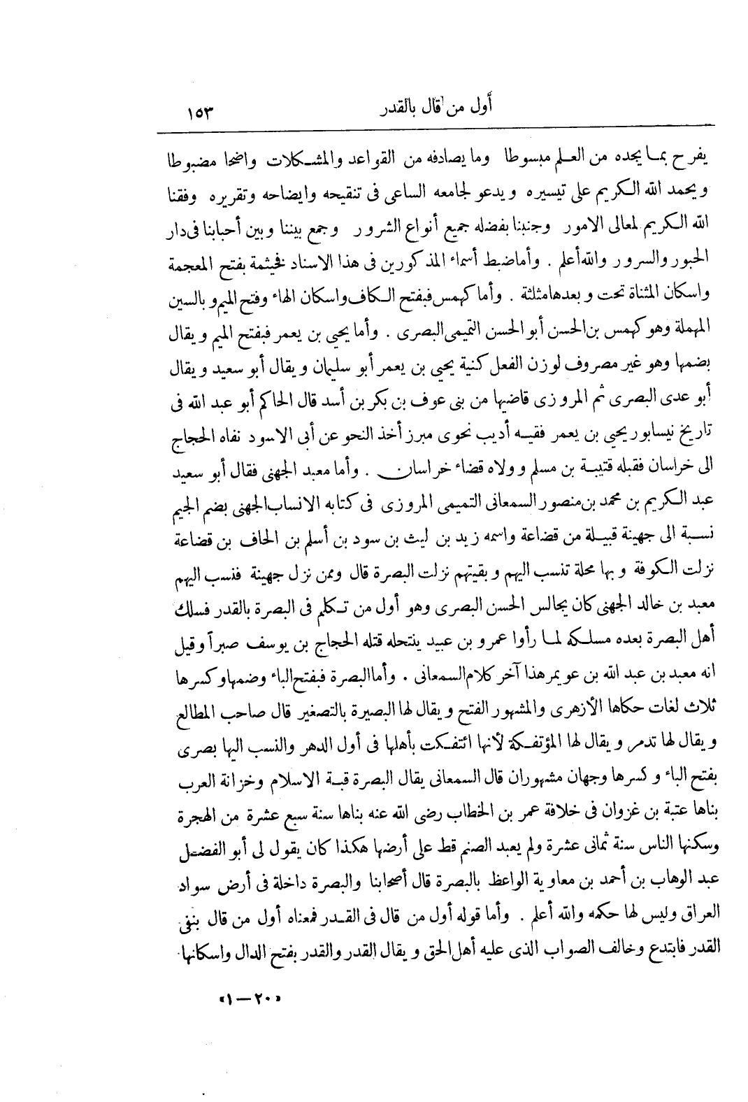 يَفْرَحُ بِمَا يَجِدُهُ مِنَ الْعِلْمِ مَبْسُوطًا وَمَا يُصَادِفهُ مِنَ الْقَوَاعِدِ وَالْمُشْكِلَاتِ وَاضِحًا مَضْبُوطًا وَيَحْمَدُ اللَّهَ الْكَرِيمَ عَلَى تَيْسِيرِهِ وَيَدْعُو لِجَامِعِهِ السَّاعِي فِي تَنْقِيحِهِ وَإِيضَاحِهِ وَتَقْرِيرِهِ وَفَّقَنَا اللَّهُ الْكَرِيمُ لِمَعَالِي الْأُمُورِ وَجَنَّبَنَا بِفَضْلِهِ جَمِيعَ أَنْوَاعِ الشُّرُورِ وَجَمَعَ بَيْنَنَا وَبَيْنَ أَحْبَابِنَا فِي دَارِ الْحُبُورِ وَالسُّرُورِ وَاللَّهُ أَعْلَمُ وَأَمَّا ضَبْطُ أَسْمَاءِ الْمَذْكُورِينَ فِي هَذَا الْإِسْنَادِ فَخَيْثَمَةُ بِفَتْحِ الْمُعْجَمَةِ وَإِسْكَانِ الْمُثَنَّاةِ تَحْتُ وَبَعْدَهَا مُثَلَّثَةٌ وَأَمَّا كَهْمَسٌ فَبِفَتْحِ الْكَافِ وَإِسْكَانِ الْهَاءِ وَفَتْحِ الْمِيمِ وَبِالسِّينِ الْمُهْمَلَةِ وَهُوَ كَهْمَسُ بْنُ الْحَسَنِ أَبُو الْحَسَنِ التَّمِيمِيُّ الْبَصْرِيُّ وَأَمَّا يَحْيَى بْنُ يَعْمَرَ فَبِفَتْحِ الْمِيمِ وَيُقَالُ بِضَمِّهَا وَهُوَ غَيْرُ مَصْرُوفٍ لِوَزْنِ الْفِعْلِ كُنْيَةُ يَحْيَى بْنِ يَعْمَرَ أَبُو سُلَيْمَانَ وَيُقَالُ أَبُو سَعِيدٍ وَيُقَالُ أَبُو عَدِيٍّ الْبَصْرِيُّ ثُمَّ الْمَرْوَزِيُّ قَاضِيهَا مِنْ بَنِي عَوْفِ بْنِ بَكْرِ بْنِ أَسَدٍ قَالَ الْحَاكِمُ أَبُو عَبْدِ اللَّهِ فى تاريخ نيسابور يحيى بن يعمر فقيه أديب نحوى مبرر أَخَذَ النَّحْوَ عَنْ أَبِي الْأَسْوَدِ نَفَاهُ الْحَجَّاجُ إِلَى خُرَاسَانَ فَقَبِلَهُ قُتَيْبَةُ بْنُ مُسْلِمٍ وَوَلَّاهُ قَضَاءَ خُرَاسَانَ وَأَمَّا مَعْبَدٌ الْجُهَنِيُّ فَقَالَ أَبُو سَعِيدٍ عَبْدُ الْكَرِيمِ بْنُ مُحَمَّدِ بْنِ مَنْصُورٍ السَّمْعَانِيُّ التَّمِيمِيُّ الْمَرْوَزِيُّ فِي كِتَابِهِ الْأَنْسَابُ الْجُهَنِيُّ بِضَمِّ الْجِيمِ نِسْبَةً إِلَى جُهَيْنَةَ قَبِيلَةٌ مِنْ قُضَاعَةَ وَاسْمُهُ زَيْدُ بْنُ لَيْثِ بْنِ سَوْدِ بْنِ أَسْلَمَ بْنِ الْحَافِّ بْنِ قُضَاعَةَ نَزَلَتِ الْكُوفَةَ وَبِهَا مَحِلَّةٌ تُنْسَبُ إِلَيْهِمْ وَبَقِيَّتُهُمْ نَزَلَتِ الْبَصْرَةَ قَالَ وَمِمَّنْ نَزَلَ جُهَيْنَةَ فَنُسِبَ إِلَيْهِمْ مَعْبَدُ بْنُ خَالِدٍ الْجُهَنِيُّ كَانَ يُجَالِسُ الْحَسَنَ الْبَصْرِيَّ وَهُوَ أَوَّلُ مَنْ تَكَلَّمَ فِي الْبَصْرَةِ بِالْقَدَرِ فَسَلَكَ أَهْلُ الْبَصْرَةِ بَعْدَهُ مَسْلَكَهُ لَمَّا رَأَوْا عَمْرَو بْنَ عُبَيْدٍ يَنْتَحِلُهُ قَتَلَهُ الْحَجَّاجُ بْنُ يُوسُفَ صَبْرًا وَقِيلَ إِنَّهُ مَعْبَدُ بْنُ عَبْدِ اللَّهِ بْنِ عُوَيْمِرٍ هَذَا آخِرُ كَلَامِ السَّمْعَانِيِّ وَأَمَّا الْبَصْرَةُ فَبِفَتْحِ الْبَاءِ وَضَمِّهَا وَكَسْرِهَا ثَلَاثُ لُغَاتٍ حَكَاهَا الْأَزْهَرِيُّ وَالْمَشْهُورُ الْفَتْحُ وَيُقَالُ لَهَا الْبُصَيْرَةُ بِالتَّصْغِيرِ قَالَ صَاحِبُ الْمَطَالِعِ وَيُقَالُ لَهَا تَدْمُرَ وَيُقَالُ لَهَا الْمُؤْتَفِكَةُ لِأَنَّهَا ائْتَفَكَتْ بِأَهْلِهَا فِي أَوَّلِ الدَّهْرِ وَالنَّسَبُ إِلَيْهَا بَصْرِيُّ بِفَتْحِ الْبَاءِ وَكَسْرِهَا وَجْهَانِ مَشْهُورَانِ قَالَ السَّمْعَانِيُّ يُقَالُ الْبَصْرَةُ قُبَّةُ الْإِسْلَامِ وَخِزَانَةُ الْعَرَبِ بَنَاهَا عُتْبَةُ بْنُ غَزْوَانَ فِي خِلَافَةِ عُمَرَ بْنِ الْخَطَّابِ رَضِيَ اللَّهُ عَنْهُ بَنَاهَا سَنَةَ سَبْعَ عَشْرَةَ مِنَ الْهِجْرَةِ وَسَكَنَهَا النَّاسُ سَنَةَ ثَمَانِيَ عَشْرَةَ وَلَمْ يُعْبَدَ الصَّنَمُ قَطُّ عَلَى أَرْضِهَا هَكَذَا كَانَ يَقُولُ لِي أَبُو الْفَضْلِ عَبْدُ الْوَهَّابِ بْنُ أَحْمَدَ بْنِ مُعَاوِيَةَ الْوَاعِظُ بِالْبَصْرَةِ قَالَ أَصْحَابُنَا وَالْبَصْرَةُ دَاخِلَةٌ فِي أَرْضِ سَوَادِ الْعِرَاقِ وَلَيْسَ لَهَا حُكْمُهُ وَاللَّهُ أَعْلَمُ وَأَمَّا قَوْلُهُ أَوَّلَ مَنْ قَالَ فِي الْقَدَرِ فَمَ