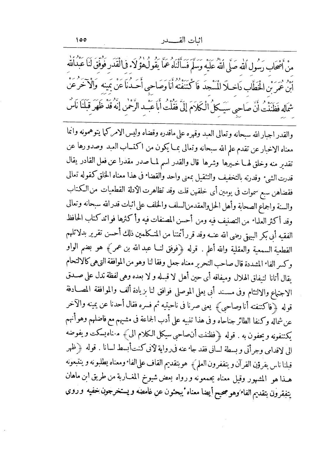 وَالْقَدَرِ إِجْبَارُ اللَّهِ سُبْحَانَهُ وَتَعَالَى الْعَبْدَ وَقَهْرُهُ عَلَى مَا قَدَّرَهُ وَقَضَاهُ وَلَيْسَ الْأَمْرُ كَمَا يَتَوَهَّمُونَهُ وَإِنَّمَا مَعْنَاهُ الْإِخْبَارُ عَنْ تَقَدُّمِ عِلْمِ اللَّهِ سُبْحَانَهُ وَتَعَالَى بِمَا يَكُونُ مِنَ اكْتِسَابِ الْعَبْدِ وَصُدُورِهَا عَنْ تَقْدِيرٍ مِنْهُ وَخَلَقَ لَهَا خَيْرَهَا وَشَرَّهَا قَالَ وَالْقَدَرُ اسْمٌ لِمَا صَدَرَ مُقَدَّرًا عَنْ فِعْلِ الْقَادِرِ يُقَالُ قَدَرْتُ الشَّيْءَ وَقَدَّرْتُهُ بِالتَّخْفِيفِ وَالتَّثْقِيلِ بِمَعْنًى وَاحِدٍ وَالْقَضَاءُ فِي هَذَا مَعْنَاهُ الْخَلْقُ كَقَوْلِهِ تَعَالَى فَقَضَاهُنَّ سَبْعَ سماوات فى يومين أَيْ خَلَقَهُنَّ قُلْتُ وَقَدْ تَظَاهَرَتِ الْأَدِلَّةُ الْقَطْعِيَّاتُ مِنَ الْكِتَابِ وِالسُّنَّةِ وَإِجْمَاعِ الصَّحَابَةِ وَأَهْلِ الْحَلِّ وَالْعَقْدِ مِنَ السَّلَفِ وَالْخَلَفِ عَلَى إِثْبَاتِ قَدَرِ اللَّهِ سُبْحَانَهُ وَتَعَالَى وَقَدْ أَكْثَرَ الْعُلَمَاءُ مِنَ التَّصْنِيفِ فِيهِ وَمِنْ أَحْسَنِ الْمُصَنَّفَاتِ فِيهِ وَأَكْثَرِهَا فَوَائِدَ كِتَابُ الْحَافِظِ الْفَقِيهِ أَبِي بَكْرٍ الْبَيْهَقِيِّ رَضِيَ اللَّهُ عَنْهُ وَقَدْ قَرَّرَ أَئِمَّتُنَا مِنَ الْمُتَكَلِّمِينَ ذَلِكَ أَحْسَنَ تَقْرِيرٍ بِدَلَائِلِهِمُ الْقَطْعِيَّةِ السَّمْعِيَّةِ وَالْعَقْلِيَّةِ وَاللَّهُ أَعْلَمُ قَوْلُهُ (فَوُفِّقَ لَنَا عَبْدُ اللَّهِ بْنُ عُمَرَ) هُوَ بِضَمِّ الْوَاوِ وَكَسْرِ الْفَاءِ الْمُشَدَّدَةِ قَالَ صَاحِبُ التَّحْرِيرِ مَعْنَاهُ جُعِلَ وَفْقًا لَنَا وَهُوَ مِنَ الْمُوَافَقَةِ الَّتِي هِيَ كَالِالْتِحَامِ يُقَالُ أَتَانَا لِتِيفَاقِ الْهِلَالِ وَمِيفَاقِهِ أَيْ حِينَ أَهَلَّ لَا قَبْلَهُ وَلَا بَعْدَهُ وَهِيَ لَفْظَةٌ تَدُلُّ عَلَى صِدْقِ الِاجْتِمَاعِ وَالِالْتِئَامِ وَفِي مُسْنَدِ أَبِي يَعْلَى الْمَوْصِلِيِّ فَوَافَقَ لَنَا بِزِيَادَةِ أَلِفٍ وَالْمُوَافَقَةُ الْمُصَادَفَةُ قَوْلُهُ (فَاكْتَنَفْتُهُ أَنَا وَصَاحِبِي) يَعْنِي صِرْنَا فِي نَاحِيَتَيْهِ ثُمَّ فَسَّرَهُ فَقَالَ أَحَدُنَا عَنْ يَمِينِهِ وَالْآخَرُ عَنْ شِمَالِهِ وَكَنَفَا الطَّائِرِ جَنَاحَاهُ وَفِي هَذَا تَنْبِيهٌ عَلَى أَدَبِ الْجَمَاعَةِ فِي مَشْيهِمْ مَعَ فَاضِلِهِمْ وَهُوَ أَنَّهُمْ يَكْتَنِفُونَهُ وَيَحُفُّونَ بِهِ قَوْلُهُ (فَظَنَنْتُ أَنَّ صَاحِبِي سَيَكِلُ الْكَلَامَ إِلَيَّ) مَعْنَاهُ يَسْكُتُ وَيُفَوِّضُهُ إِلَيَّ لِإِقْدَامِي وَجُرْأَتِي وَبَسْطَةِ لِسَانِي فَقَدْ جَاءَ عَنْهُ فِي رِوَايَةٍ لِأَنِّي كُنْتُ أَبْسَطَ لِسَانًا قَوْلُهُ (ظهر قبلنا ناس يقرؤن الْقُرْآنَ وَيَتَقَفَّرُونَ الْعِلْمَ) هُوَ بِتَقْدِيمِ الْقَافِ عَلَى الْفَاءِ وَمَعْنَاهُ يَطْلُبُونَهُ وَيَتَتَبَّعُونَهُ هَذَا هُوَ الْمَشْهُورُ وَقِيلَ مَعْنَاهُ يَجْمَعُونَهُ وَرَوَاهُ بَعْضُ شُيُوخِ الْمَغَارِبَةِ من طريق بن ماهان يتفقرون بتقديم الفاء وهو صحيح أَيْضًا مَعْنَاهُ يَبْحَثُونَ عَنْ غَامِضِهِ وَيَسْتَخْرِجُونَ خَفِيَّهُ وروى