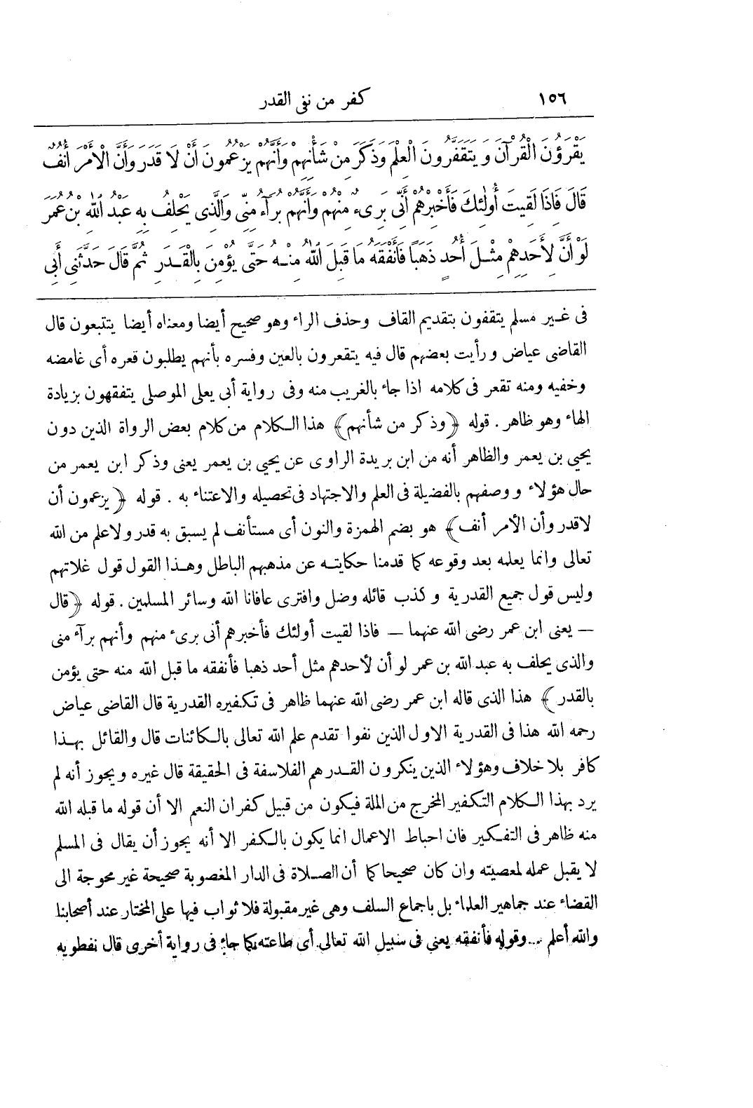 فى غير مسلم يتفقون بِتَقْدِيمِ الْقَافِ وَحَذْفِ الرَّاءِ وَهُوَ صَحِيحٌ أَيْضًا وَمَعْنَاهُ أَيْضًا يَتَتَبَّعُونَ قَالَ الْقَاضِي عِيَاضٌ وَرَأَيْتُ بَعْضَهُمْ قَالَ فِيهِ يَتَقَعَّرُونَ بِالْعَيْنِ وَفَسَّرَهُ بِأَنَّهُمْ يَطْلُبُونَ قَعْرَهُ أَيْ غَامِضَهُ وَخَفِيَّهُ وَمِنْهُ تَقَعَّرَ فِي كَلَامِهِ إِذَا جَاءَ بِالْغَرِيبِ مِنْهُ وَفِي رِوَايَةِ أَبِي يَعْلَى الْمَوْصِلِيِّ يَتَفَقَّهُونَ بِزِيَادَةِ الْهَاءِ وَهُوَ ظَاهِرٌ قَوْلُهُ (وَذَكَرَ مِنْ شَأْنِهِمْ) هَذَا الْكَلَامُ مِنْ كَلَامِ بَعْضِ الرُّوَاةِ الَّذِينَ دُونَ يحيى بن يعمر والظاهر أنه من بن بُرَيْدَةَ الرَّاوِي عَنْ يَحْيَى بْنِ يَعْمَرَ يَعْنِي وذكر بن يَعْمَرَ مِنْ حَالِ هَؤُلَاءِ وَوَصْفِهِمْ بِالْفَضِيلَةِ فِي الْعِلْمِ وَالِاجْتِهَادِ فِي تَحْصِيلِهِ وَالِاعْتِنَاءِ بِهِ قَوْلُهُ (يَزْعُمُونَ أَنْ لَا قَدَرَ وَأَنَّ الْأَمْرَ أُنُفٌ) هُوَ بِضَمِّ الْهَمْزَةِ وَالنُّونِ أَيْ مُسْتَأْنَفٌ لَمْ يَسْبِقْ بِهِ قَدَرٌ وَلَا عِلْمٌ مِنَ اللَّهِ تَعَالَى وَإِنَّمَا يَعْلَمُهُ بَعْدَ وُقُوعِهِ كَمَا قَدَّمْنَا حِكَايَتَهُ عَنْ مَذْهَبِهِمُ الْبَاطِلِ وَهَذَا الْقَوْلُ قَوْلُ غُلَاتِهِمْ وَلَيْسَ قَوْلُ جَمِيعِ الْقَدَرِيَّةِ وَكَذَبَ قَائِلُهُ وَضَلَّ وَافْتَرَى عَافَانَا اللَّهُ وَسَائِرَ الْمُسْلِمِينَ قَوْلُهُ (قال يعنى بن عُمَرَ رَضِيَ اللَّهُ عَنْهُمَا فَإِذَا لَقِيتَ أُولَئِكَ فَأَخْبِرْهُمْ أَنِّي بَرِيءٌ مِنْهُمْ وَأَنَّهُمْ بُرَآءُ مِنِّي وَالَّذِي يَحْلِفُ بِهِ عَبْدُ اللَّهِ بْنُ عُمَرَ لَوْ أَنَّ لِأَحَدِهِمْ مِثْلَ أُحُدٍ ذَهَبًا فَأَنْفَقَهُ مَا قَبِلَ اللَّهُ مِنْهُ حَتَّى يُؤْمِنَ بِالْقَدَرِ) هذا الذى قاله بن عُمَرَ رَضِيَ اللَّهُ عَنْهُمَا ظَاهِرٌ فِي تَكْفِيرِهِ الْقَدَرِيَّةَ قَالَ الْقَاضِي عِيَاضٌ رَحِمَهُ اللَّهُ هَذَا فِي الْقَدَرِيَّةِ الْأُوَلِ الَّذِينَ نَفَوْا تَقَدُّمَ عِلْمِ اللَّهِ تَعَالَى بِالْكَائِنَاتِ قَالَ وَالْقَائِلُ بِهَذَا كَافِرٌ بِلَا خِلَافٍ وَهَؤُلَاءِ الَّذِينَ يُنْكِرُونَ الْقَدَرَ هُمُ الْفَلَاسِفَةُ فِي الْحَقِيقَةِ قَالَ غَيْرُهُ وَيَجُوزُ أَنَّهُ لَمْ يُرِدْ بِهَذَا الْكَلَامَ التَّكْفِيرَ الْمُخْرِجَ مِنَ الْمِلَّةِ فَيَكُونُ مِنْ قَبِيلِ كُفْرَانِ النِّعَمِ إِلَّا أَنَّ قَوْلَهُ مَا قَبِلَهُ اللَّهُ مِنْهُ ظَاهِرٌ فى التكفير فَإِنَّ إِحْبَاطَ الْأَعْمَالِ إِنَّمَا يَكُونُ بِالْكُفْرِ إِلَّا أَنَّهُ يَجُوزُ أَنْ يُقَالَ فِي الْمُسْلِمِ لَا يُقْبَلُ عَمَلُهُ لِمَعْصِيَتِهِ وَإِنْ كَانَ صَحِيحًا كَمَا أَنَّ الصَّلَاةَ فِي الدَّارِ الْمَغْصُوبَةِ صَحِيحَةٌ غَيْرُ مُحْوِجَةٍ إِلَى الْقَضَاءِ عِنْدَ جَمَاهِيرِ الْعُلَمَاءِ بَلْ بِإِجْمَاعِ السَّلَفِ وَهِيَ غَيْرُ مَقْبُولَةٍ فَلَا ثَوَابَ فِيهَا عَلَى الْمُخْتَارِ عِنْدَ أَصْحَابِنَا وَاللَّهُ أَعْلَمُ وَقَوْلُهُ فَأَنْفَقَهُ يَعْنِي فِي سَبِيلِ اللَّهِ تَعَالَى أَيْ طَاعَتِهِ كَمَا جَاءَ فِي رِوَايَةٍ أُخْرَى قال نفطويه