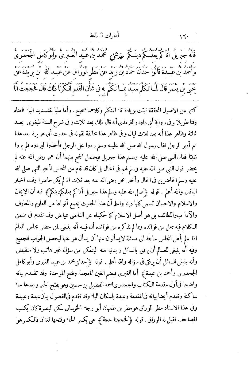 كَثِيرٍ مِنَ الْأُصُولِ الْمُحَقَّقَةِ لَبِثْتُ بِزِيَادَةِ تَاءِ الْمُتَكَلِّمِ وَكِلَاهُمَا صَحِيحٌ وَأَمَّا مَلِيًّا بِتَشْدِيدِ الْيَاءِ فَمَعْنَاهُ وَقْتًا طَوِيلًا وَفِي رِوَايَةِ أَبِي دَاوُدَ وَالتِّرْمِذِيِّ أَنَّهُ قَالَ ذَلِكَ بَعْدَ ثَلَاثٍ وَفِي شَرْحِ السُّنَّةِ لِلْبَغَوِيِّ بَعْدَ ثَالِثَةٍ وَظَاهِرُ هَذَا أَنَّهُ بَعْدَ ثَلَاثِ لَيَالٍ وَفِي ظَاهِرِ هَذَا مُخَالَفَةٌ لِقَوْلِهِ فِي حَدِيثِ أَبِي هُرَيْرَةَ بَعْدَ هَذَا ثُمَّ أَدْبَرَ الرَّجُلُ فَقَالَ رَسُولُ اللَّهِ صَلَّى اللَّهُ عَلَيْهِ وَسَلَّمَ رُدُّوا عَلَيَّ الرَّجُلَ فَأَخَذُوا لِيَرُدُّوهُ فَلَمْ يَرَوْا شَيْئًا فَقَالَ النَّبِيُّ صَلَّى اللَّهُ عَلَيْهِ وَسَلَّمَ هَذَا جِبْرِيلُ فَيَحْتَمِلُ الْجَمْعُ بَيْنَهُمَا أَنَّ عُمَرَ رَضِيَ اللَّهُ عَنْهُ لَمْ يَحْضُرَ قَوْلَ النَّبِيَّ صَلَّى اللَّهُ عَلَيْهِ وَسَلَّمَ لَهُمْ فِي الْحَالِ بَلْ كَانَ قَدْ قَامَ مِنَ الْمَجْلِسِ فَأَخْبَرَ النَّبِيُّ صَلَّى اللَّهُ عَلَيْهِ وَسَلَّمَ الْحَاضِرِينَ فِي الْحَالِ وَأُخْبِرَ عُمَرَ رَضِيَ اللَّهُ عَنْهُ بَعْدَ ثَلَاثٍ إِذْ لَمْ يَكُنْ حَاضِرًا وَقْتَ إِخْبَارِ الْبَاقِينَ وَاللَّهُ أَعْلَمُ قَوْلُهُ (صَلَّى اللَّهُ عَلَيْهِ وَسَلَّمَ هَذَا جِبْرِيلُ أَتَاكُمْ يُعَلِّمُكُمْ دِينَكُمْ) فِيهِ أَنَّ الْإِيمَانَ وَالْإِسْلَامَ وَالْإِحْسَانَ تُسَمَّى كُلُّهَا دِينًا وَاعْلَمْ أَنَّ هَذَا الْحَدِيثَ يَجْمَعُ أَنْوَاعًا مِنَ الْعُلُومِ وَالْمَعَارِفِ وَالْآدَابِ وَاللَّطَائِفِ بَلْ هُوَ أَصْلُ الْإِسْلَامِ كَمَا حُكِينَاهُ عَنِ الْقَاضِي عِيَاضٍ وَقَدْ تَقَدَّمَ فِي ضِمْنِ الْكَلَامِ فِيهِ جُمَلٌ مِنْ فَوَائِدِهِ وَمِمَّا لَمْ نَذْكُرُهُ مِنْ فَوَائِدِهِ أَنَّ فِيهِ أَنَّهُ يَنْبَغِي لِمَنْ حَضَرَ مَجْلِسَ الْعَالِمِ إِذَا عَلِمَ بِأَهْلِ الْمَجْلِسِ حَاجَةً إِلَى مَسْأَلَةٍ لَا يَسْأَلُونَ عَنْهَا أَنْ يَسْأَلَ هُوَ عَنْهَا لِيَحْصُلَ الْجَوَابُ لِلْجَمِيعِ وَفِيهِ أَنَّهُ يَنْبَغِي لِلْعَالِمِ أَنْ يَرْفُقَ بِالسَّائِلِ وَيُدْنِيَهُ مِنْهُ لِيَتَمَكَّنَ مِنْ سُؤَالِهِ غَيْرَ هَائِبٍ وَلَا مُنْقَبِضٍ وَأَنَّهُ يَنْبَغِي لِلسَّائِلِ أَنْ يَرْفُقَ فِي سُؤَالِهِ وَاللَّهُ أَعْلَمُ قَوْلُهُ (حَدَّثَنِي مُحَمَّدُ بْنُ عُبَيْدٍ الْغُبَرِيُّ وَأَبُو كَامِلٍ الْجَحْدَرِيُّ وَأَحْمَدُ بْنُ عَبْدَةَ) أَمَّا الْغُبَرِيُّ فَبِضَمِّ الْغَيْنِ الْمُعْجَمَةِ وَفَتْحِ الْمُوَحَّدَةِ وَقَدْ تَقَدَّمَ بَيَانُهُ وَاضِحًا فِي أول مقدمة الكتاب والجحدرى اسْمُهُ الْفُضَيْلُ بْنُ حُسَيْنٍ وَهُوَ بِفَتْحِ الْجِيمِ وَبَعْدَهَا حَاءٌ سَاكِنَةٌ وَتَقَدَّمَ أَيْضًا بَيَانُهُ فِي المقدمة وعبدة بِإِسْكَانِ الْبَاءِ وَقَدْ تَقَدَّمَ فِي الْفُصُولِ بَيَانُ عَبْدَةَ وَعُبَيْدَةَ وَفِي هَذَا الْإِسْنَادِ مَطَرٌ الْوَرَّاقُ هُوَ مَطَرُ بْنُ طَهْمَانَ أَبُو رَجَاءٍ الْخُرَسَانِيُّ سَكَنَ الْبَصْرَةَ كَانَ يَكْتُبُ الْمَصَاحِفَ فَقِيلَ لَهُ الْوَرَّاقُ قَوْلُهُ (فَحَجَجْنَا حِجَّةً) هِيَ بِكَسْرِ الْحَاءِ وَفَتْحِهَا لُغَتَانِ فَالْكَسْرُ هُوَ
