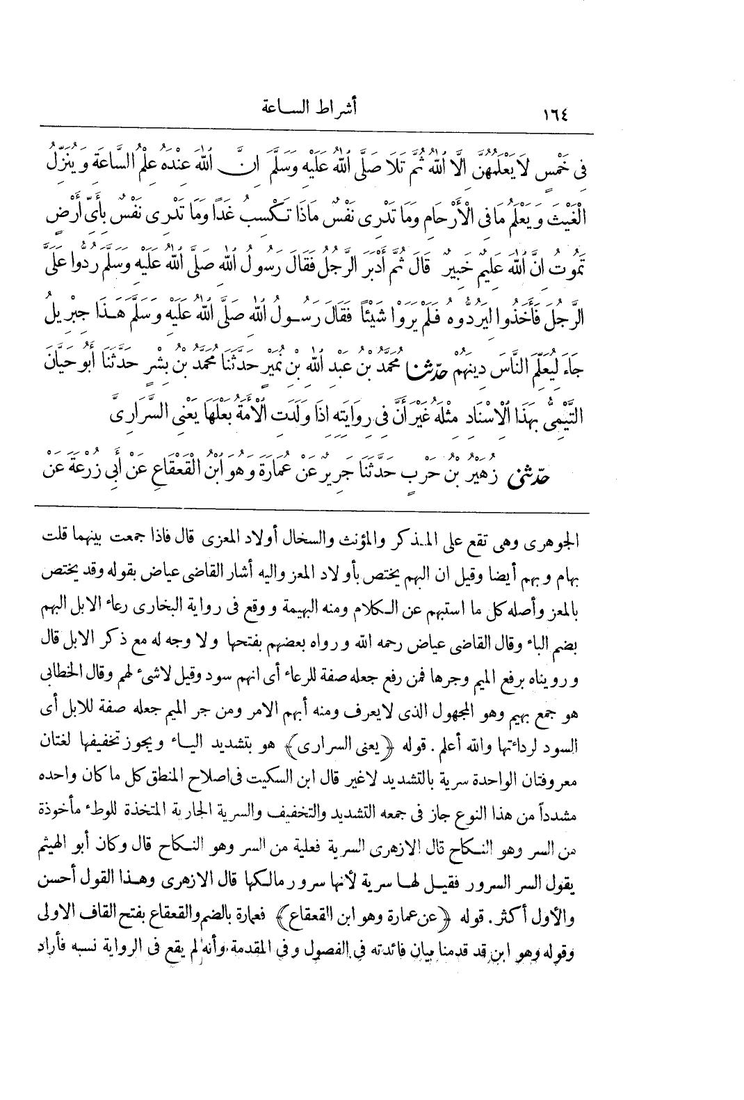 الْجَوْهَرِيُّ وَهِيَ تَقَعُ عَلَى الْمُذَكَّرِ وَالْمُؤَنَّثِ وَالسِّخَالُ أَوْلَادُ الْمِعْزَى قَالَ فَإِذَا جَمَعْتَ بَيْنَهُمَا قُلْتَ بِهَامٌ وَبَهْمٌ أَيْضًا وَقِيلَ إِنَّ الْبَهْمَ يَخْتَصُّ بِأَوْلَادِ الْمَعْزِ وَإِلَيْهِ أَشَارَ الْقَاضِي عِيَاضٌ بِقَوْلِهِ وَقَدْ يَخْتَصُّ بِالْمَعْزِ وَأَصْلُهُ كُلُّ مَا اسْتَبْهَمَ عَنِ الْكَلَامِ وَمِنْهُ الْبَهِيمَةُ وَوَقَعَ فِي رِوَايَةِ الْبُخَارِيِّ رِعَاءُ الْإِبِلِ الْبُهْمُ بِضَمِّ الْبَاءِ وَقَالَ الْقَاضِي عِيَاضٌ رَحِمَهُ اللَّهُ وَرَوَاهُ بَعْضُهُمْ بِفَتْحِهَا وَلَا وَجْهَ لَهُ مَعَ ذِكْرِ الْإِبِلِ قَالَ وَرُوِّينَاهُ بِرَفْعِ الْمِيمِ وَجَرِّهَا فَمَنْ رَفَعَ جَعَلَهُ صفة للرعاء أى انهم سود وقيل لاشىء لهم وقال الْخَطَّابِيُّ هُوَ جَمْعُ بَهِيمٍ وَهُوَ الْمَجْهُولُ الَّذِي لَا يُعْرَفُ وَمِنْهُ أَبْهَمَ الْأَمْرَ وَمَنْ جَرَّ الْمِيمَ جَعَلَهُ صِفَةً لِلْإِبِلِ أَيِ السُّودِ لِرَدَاءَتِهَا وَاللَّهُ أَعْلَمُ قَوْلُهُ (يَعْنِي السَّرَارِيَّ) هُوَ بِتَشْدِيدِ الْيَاءِ وَيَجُوزُ تَخْفِيفُهَا لُغَتَانِ مَعْرُوفَتَانِ الْوَاحِدَةُ سُرِّيَّةٌ بالتشديد لا غير قال بن السِّكِّيتِ فِي إِصْلَاحِ الْمَنْطِقِ كُلُّ مَا كَانَ وَاحِدُهُ مُشَدَّدًا مِنْ هَذَا النَّوْعِ جَازَ فِي جَمْعِهِ التَّشْدِيدُ وَالتَّخْفِيفُ وَالسُّرِّيَّةُ الْجَارِيَةُ الْمُتَّخَذَةُ لِلْوَطْءِ مَأْخُوذَةٌ مِنَ السِّرِّ وَهُوَ النِّكَاحُ قَالَ الْأَزْهَرِيُّ السُّرِّيَّةُ فُعْلِيَّةٌ مِنَ السِّرِّ وَهُوَ النِّكَاحُ قَالَ وَكَانَ أَبُو الْهَيْثَمِ يَقُولُ السُّرُّ السُّرُورُ فَقِيلَ لَهَا سُرِّيَّةُ لِأَنَّهَا سُرُورُ مَالِكِهَا قَالَ الْأَزْهَرِيُّ وَهَذَا الْقَوْلُ أَحْسَنُ وَالْأَوَّلُ أَكْثَرُ قَوْلُهُ