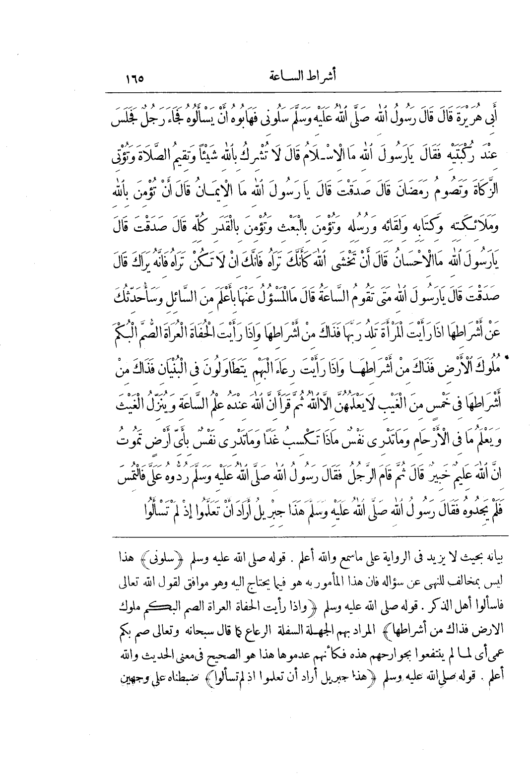 بَيَانَهُ بِحَيْثُ لَا يَزِيدُ فِي الرِّوَايَةِ عَلَى مَا سَمِعَ وَاللَّهُ أَعْلَمُ قَوْلُهُ صَلَّى اللَّهُ عَلَيْهِ وَسَلَّمَ (سَلُونِي) هَذَا لَيْسَ بِمُخَالِفٍ لِلنَّهْيِ عَنْ سُؤَالِهِ فَإِنَّ هَذَا الْمَأْمُورَ بِهِ هُوَ فِيمَا يُحْتَاجُ إِلَيْهِ وَهُوَ مُوَافِقٌ لِقَوْلِ اللَّهِ تعالى فاسألوا أهل الذكر قَوْلُهُ صَلَّى اللَّهُ عَلَيْهِ وَسَلَّمَ (وَإِذَا رَأَيْتَ الْحُفَاةَ الْعُرَاةَ الصُّمَّ الْبُكْمَ مُلُوكَ الْأَرْضِ فَذَاكَ مِنْ أَشْرَاطِهَا) الْمُرَادُ بِهِمُ الْجَهَلَةُ السَّفِلَةُ الرِّعَاعُ كَمَا قَالَ سُبْحَانَهُ وَتَعَالَى صُمٌّ بُكْمٌ عُمْيٌ أَيْ لَمَّا لَمْ يَنْتَفِعُوا بِجَوَارِحِهِمْ هَذِهِ فَكَأَنَّهُمْ عَدِمُوهَا هَذَا هُوَ الصَّحِيحُ فِي مَعْنَى الْحَدِيثِ وَاللَّهُ أَعْلَمُ قَوْلُهُ صَلَّى اللَّهُ عَلَيْهِ وَسَلَّمَ (هَذَا جِبْرِيلُ أَرَادَ أَنْ تَعَلَّمُوا إِذْ لَمْ تَسْأَلُوا) ضَبَطْنَاهُ عَلَى وَجْهَيْنِ