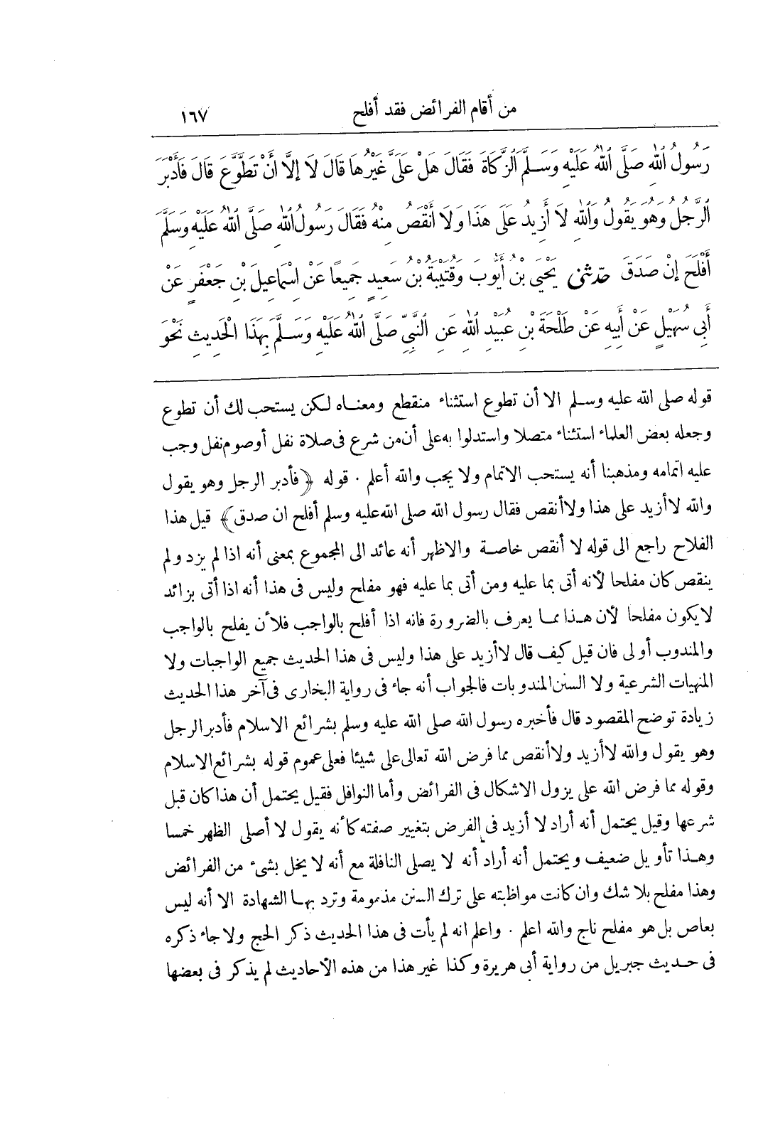قَوْلُهُ صَلَّى اللَّهُ عَلَيْهِ وَسَلَّمَ إِلَّا أَنْ تَطَّوَّعَ اسْتِثْنَاءٌ مُنْقَطِعٌ وَمَعْنَاهُ لَكِنْ يُسْتَحَبُّ لَكَ أَنْ تَطَّوَّعَ وَجَعَلَهُ بَعْضُ الْعُلَمَاءِ اسْتِثْنَاءً مُتَّصِلًا واستدلوا به على أن مَنْ شَرَعَ فِي صَلَاةِ نَفْلٍ أَوْ صَوْمِ نَفْلٍ وَجَبَ عَلَيْهِ إِتْمَامُهُ وَمَذْهَبُنَا أَنَّهُ يُسْتَحَبُّ الْإِتْمَامُ وَلَا يَجِبُ وَاللَّهُ أَعْلَمُ قَوْلُهُ (فَأَدْبَرَ الرَّجُلُ وَهُوَ يَقُولُ وَاللَّهِ لَا أَزِيدُ عَلَى هَذَا وَلَا أَنْقُصُ فَقَالَ رَسُولُ اللَّهِ صَلَّى اللَّهُ عَلَيْهِ وَسَلَّمَ أَفْلَحَ إِنْ صَدَقَ) قِيلَ هَذَا الْفَلَاحُ رَاجِعٌ إِلَى قَوْلِهُ لَا أَنْقُصُ خاصة والا ظهر أَنَّهُ عَائِدٌ إِلَى الْمَجْمُوعِ بِمَعْنَى أَنَّهُ إِذَا لَمْ يَزِدْ وَلَمْ يَنْقُصْ كَانَ مُفْلِحًا لِأَنَّهُ أَتَى بِمَا عَلَيْهِ وَمَنْ أَتَى بِمَا عَلَيْهِ فَهُوَ مُفْلِحٌ وَلَيْسَ فِي هَذَا أَنَّهُ إِذَا أَتَى بِزَائِدٍ لَا يَكُونُ مُفْلِحًا لِأَنَّ هَذَا مِمَّا يُعْرَفُ بِالضَّرُورَةِ فَإِنَّهُ إِذَا أَفْلَحَ بِالْوَاجِبِ فَلَأَنْ يُفْلِحَ بِالْوَاجِبِ وَالْمَنْدُوبِ أَوْلَى فَإِنْ قِيلَ كَيْفَ قَالَ لَا أَزِيدُ عَلَى هَذَا وَلَيْسَ فى هذا الحديث جميع الواجبات ولا االمنهيات الشَّرْعِيَّةِ وَلَا السُّنَنِ الْمَنْدُوبَاتِ فَالْجَوَابُ أَنَّهُ جَاءَ فِي رِوَايَةِ الْبُخَارِيِّ فِي آخِرِ هَذَا الْحَدِيثِ زِيَادَةٌ تُوَضِّحُ الْمَقْصُودَ قَالَ فَأَخْبَرَهُ رَسُولُ اللَّهِ صَلَّى اللَّهُ عَلَيْهِ وَسَلَّمَ بِشَرَائِعِ الْإِسْلَامِ فَأَدْبَرَ الرَّجُلُ وَهُوَ يَقُولُ وَاللَّهِ لَا أَزِيدُ وَلَا أَنْقُصُ مِمَّا فَرَضَ اللَّهُ تَعَالَى عَلَيَّ شَيْئًا فَعَلَى عُمُومِ قَوْلِهِ بِشَرَائِعِ الْإِسْلَامِ وَقَوْلِهِ مِمَّا فَرَضَ اللَّهُ عَلَيَّ يَزُولُ الْإِشْكَالُ فِي الْفَرَائِضِ وَأَمَّا النَّوَافِلُ فَقِيلَ يُحْتَمَلُ أَنَّ هَذَا كَانَ قَبْلَ شَرْعِهَا وَقِيلَ يُحْتَمَلُ أَنَّهُ أَرَادَ لَا أَزِيدُ فِي الْفَرْضِ بِتَغْيِيرِ صِفَتِهِ كَأَنَّهُ يَقُولُ لَا أُصَلِّي الظُّهْرَ خَمْسًا وَهَذَا تَأْوِيلٌ ضَعِيفٌ وَيُحْتَمَلُ أَنَّهُ أَرَادَ أَنَّهُ لَا يُصَلِّي النَّافِلَةَ مَعَ أَنَّهُ لَا يُخِلُّ بِشَيْءٍ مِنَ الْفَرَائِضِ وَهَذَا مُفْلِحٌ بِلَا شَكٍّ وَإِنْ كَانَتْ مُوَاظَبَتُهُ عَلَى تَرْكِ السُّنَنِ مَذْمُومَةٌ وَتُرَدُّ بِهَا الشَّهَادَةُ إِلَّا أَنَّهُ لَيْسَ بِعَاصٍ بَلْ هُوَ مُفْلِحٌ نَاجٍ وَاللَّهُ أَعْلَمُ وَاعْلَمْ أَنَّهُ لَمْ يَأْتِ فِي هَذَا الْحَدِيثِ ذِكْرُ الْحَجِّ وَلَا جَاءَ ذِكْرُهُ فِي حَدِيثِ جِبْرِيلَ مِنْ رِوَايَةِ أَبِي هُرَيْرَةَ وَكَذَا غَيْرُ هَذَا مِنْ هَذِهِ الْأَحَادِيثِ لَمْ يُذْكَرْ فِي بَعْضِهَا