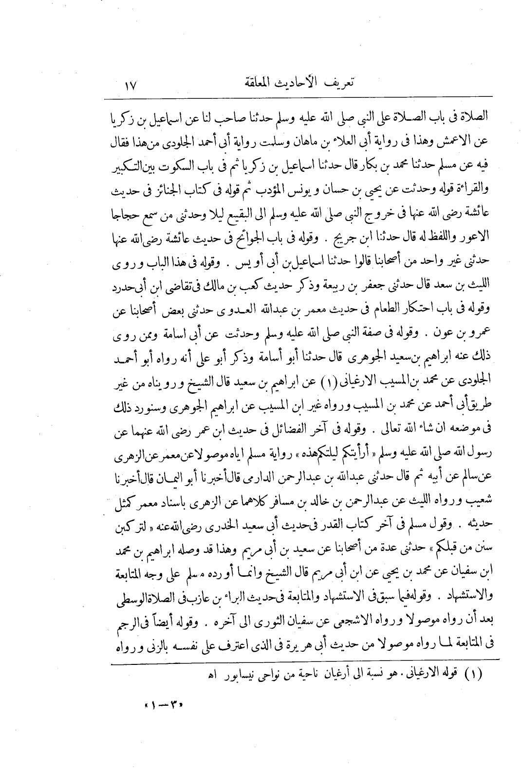 الصلاة فى باب الصَّلَاةِ عَلَى النَّبِيِّ صَلَّى اللَّهُ عَلَيْهِ وسلم حدثنا صاحب لنا عن إسماعيل بن زكريا عن الاعمش وهذا فى رواية أبى العلاء بن ماهان وسلمت رواة أبى أحمد الجلودى من هذا فقال فيه مسلم حدثنا محمد بن بكار قال حدثنا إسماعيل بن زكريا ثم فى باب السكوت بين التكبير والقراءة قوله وحدثت عن يحيى بن حسان ويونس المؤدب ثم قوله فى كتاب الجنائز فى حديث عائشة رضى الله عنها فِي خُرُوجِ النَّبِيِّ صَلَّى اللَّهُ عَلَيْهِ وَسَلَّمَ إِلَى البقيع ليلا وَحَدَّثَنِي مَنْ سَمِعَ حَجَّاجًا الْأَعْوَرَ وَاللَّفْظُ لَهُ قال حدثنا بن جريج وقوله فى باب الحوائج فى حديث عائشة رضى الله عنها حدثنى غَيْرُ وَاحِدٍ مِنْ أَصْحَابِنَا قَالُوا حَدَّثَنَا إِسْمَاعِيلُ بن أبى أويس وقوله في هذا الباب وروى اللَّيْثُ بْنُ سَعْدٍ قَالَ حَدَّثَنِي جَعْفَرُ بْنُ ربيعة وذكر حديث كعب بن مالك في تقاضي بن أبي حدرد وقوله في باب احتكار الطعام في حديث معمر بن عبد الله العدوي حدثني بعض أصحابنا عن عمرو بن عون وقوله فِي صِفَةِ النَّبِيِّ صَلَّى اللَّهُ عَلَيْهِ وَسَلَّمَ وَحُدِّثْتُ عَنْ أَبِي أُسَامَةَ وَمِمَّنْ رَوَى ذَلِكَ عنه ابراهيم بن سعيد الجوهري قال حدثنا أبو اسامة وذكر أبو علي أنه رواه أبو أحمد الجلودي عن محمد بن المسيب الارغيابي عن ابراهيم بن سعيد قال الشيخ وريناه من غير طريق أحمد عن محمد بن المسيب ورواه غير بن المسيب عن ابراهيم الجوهري وسنورد ذلك في موضعه ان شاء الله تعالى وقوله في آخر الفضائل في حديث بن عُمَرَ رَضِيَ اللَّهُ عَنْهُمَا عَنْ رَسُولِ اللَّهِ صَلَّى اللَّهُ عَلَيْهِ وَسَلَّمَ (أرأيتكم ليلتكم هذه) رواية مسلم اياه موصولا عن معمر عن الزهري عن سالم عن أبيه ثم قال حدثني عبد الله بن عبد الرحمن الدارمي قال أخبرنا أبو اليمان قال أخبرنا شعيب ورواه الليث عن عبد الرحمن بن خالد بن مسافر كلاهما عن الزهري باسناد معمر كمثل حديثه وقول مسلم في آخر كتاب القدر في حَدِيثُ أَبِي سَعِيدٍ الْخُدْرِيِّ رَضِيَ اللَّهُ عَنْهُ (لتركبن سنن من قبلكم) حَدَّثَنِي عِدَّةٌ مِنْ أَصْحَابِنَا عَنْ سَعِيدِ بْنِ أبي مريم وهذا قد وصله ابراهيم بن محمد بن سفيان عن محمد بن يحيى عن بن أبي أبي مريم قال الشيخ وانما أورده مسلم على وجه المتابعة والاستشهاد وقوله فيما سبق في الاستشهاد والمتابعة في حديث البراء بن عازب في الصلاة الوسطى بعد أن رواه موصولا ورواه الاشجعي عن سفيان الثوري إلى آخره وقوله أيضا في الرجم في المتابعة لما رواه موصولا من حديث أبي هريرة في الذي اعترف على نفسه بالزنى ورواه