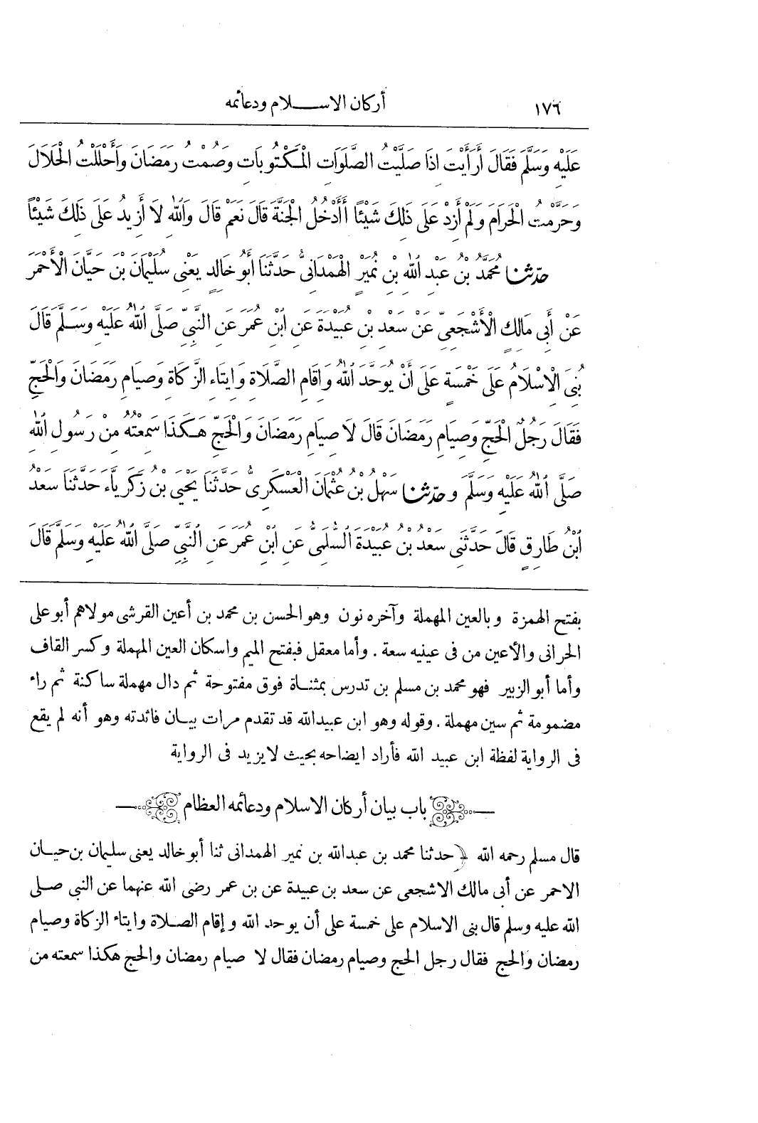 (باب بَيَانِ أَرْكَانِ الْإِسْلَامِ وَدَعَائِمِهِ الْعِظَامِ قَالَ مُسْلِمٌ رَحِمَهُ اللَّهُ (حَدَّثَنَا مُحَمَّدُ بْنُ عَبْدِ اللَّهِ بْنِ نُمَيْرٍ الْهَمْدَانِيُّ ثنا أَبُو خَالِدٍ يَعْنِي سُلَيْمَانَ بْنِ حَيَّانَ الْأَحْمَرَ عَنْ أَبِي مَالِكٍ الْأَشْجَعِيِّ عَنْ سَعْدِ بْنِ عبيدة عن بن عُمَرَ رَضِيَ اللَّهُ عَنْهُمَا عَنِ النَّبِيِّ صَلَّى اللَّهُ عَلَيْهِ وَسَلَّمَ قَالَ بُنِيَ الْإِسْلَامُ عَلَى خَمْسَةٍ عَلَى أَنْ يُوَحَّدَ اللَّهُ وَإِقَامِ الصَّلَاةَ وَإِيتَاءِ الزَّكَاةِ وَصِيَامِ رَمَضَانَ وَالْحَجِّ فَقَالَ رَجُلٌ الْحَجِّ وَصِيَامِ رَمَضَانَ فَقَالَ لَا صِيَامِ رَمَضَانَ وَالْحَجِّ هَكَذَا سَمِعْتُهُ مِنْ)