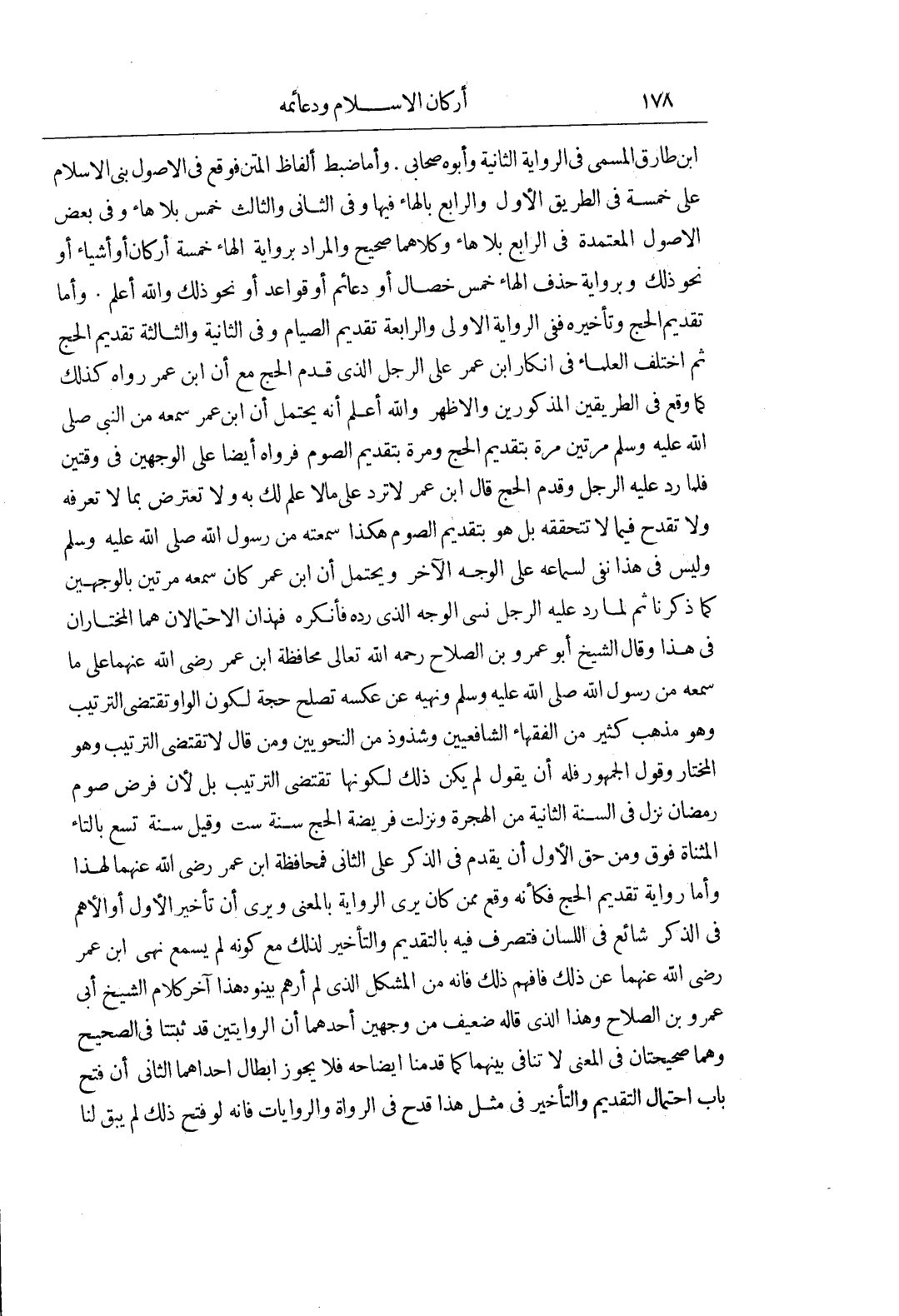 بْنُ طَارِقٍ الْمُسَمَّى فِي الرِّوَايَةِ الثَّانِيَةِ وَأَبُوهُ صَحَابِيٌّ وَأَمَّا ضَبْطُ أَلْفَاظِ الْمَتْنِ فَوَقَعَ فِي الْأُصُولِ بُنِيَ الْإِسْلَامُ عَلَى خَمْسَةٍ فِي الطَّرِيقِ الْأَوَّلِ وَالرَّابِعِ بِالْهَاءِ فِيهَا وَفِي الثَّانِي وَالثَّالِثِ خَمْسٍ بِلَا هَاءٍ وَفِي بَعْضِ الْأُصُولِ الْمُعْتَمَدَةِ فِي الرَّابِعِ بِلَا هَاءٍ وَكِلَاهُمَا صَحِيحٌ وَالْمُرَادُ بِرِوَايَةِ الْهَاءِ خَمْسَةُ أَرْكَانٍ أَوْ أَشْيَاءَ أَوْ نَحْوِ ذَلِكَ وَبِرِوَايَةِ حَذْفِ الْهَاءِ خَمْسُ خِصَالٍ أَوْ دَعَائِمَ أَوْ قَوَاعِدَ أَوْ نَحْو ذَلِكَ وَاللَّهُ أَعْلَمُ وَأَمَّا تَقْدِيمُ الْحَجِّ وَتَأْخِيرُهُ فَفِي الرِّوَايَةِ الْأُولَى وَالرَّابِعَةِ تَقْدِيمُ الصِّيَامِ وَفِي الثَّانِيَةِ وَالثَّالِثَةِ تَقْدِيمُ الْحَجِّ ثُمَّ اخْتَلَفَ الْعُلَمَاءُ فِي انكار بن عُمَرَ عَلَى الرَّجُلِ الَّذِي قَدَّمَ الْحَجَّ مَعَ أن بن عُمَرَ رَوَاهُ كَذَلِكَ كَمَا وَقَعَ فِي الطَّرِيقَيْنِ الْمَذْكُورَيْنِ وَالْأَظْهَرُ وَاللَّهُ أَعْلَمُ أَنَّهُ يُحْتَمَلُ أَنَّ بن عُمَرَ سَمِعَهُ مِنَ النَّبِيِّ صَلَّى اللَّهُ عَلَيْهِ وَسَلَّمَ مَرَّتَيْنِ مَرَّةً بِتَقْدِيمِ الْحَجِّ وَمَرَّةً بِتَقْدِيمِ الصَّوْمِ فَرَوَاهُ أَيْضًا عَلَى الْوَجْهَيْنِ فِي وَقْتَيْنِ فَلَمَّا رَدَّ عَلَيْهِ الرَّجُلُ وَقَدَّمَ الْحَجَّ قَالَ بن عُمَرَ لَا تَرُدَّ عَلَى مَا لَا عِلْمَ لَكَ بِهِ وَلَا تَعْتَرِضْ بِمَا لَا تَعْرِفُهُ وَلَا تَقْدَحُ فِيمَا لَا تَتَحَقَّقُهُ بَلْ هُوَ بِتَقْدِيمِ الصَّوْمِ هَكَذَا سَمِعْتُهُ مِنْ رَسُولِ اللَّهِ صَلَّى اللَّهُ عَلَيْهِ وَسَلَّمَ وَلَيْسَ فِي هَذَا نَفْيٌ لِسَمَاعِهِ عَلَى الْوَجْهِ الْآخَرِ وَيُحْتَمَلُ أَنَّ بن عُمَرَ كَانَ سَمِعَهُ مَرَّتَيْنِ بِالْوَجْهَيْنِ كَمَا ذَكَرْنَا ثُمَّ لَمَّا رَدَّ عَلَيْهِ الرَّجُلُ نَسِيَ الْوَجْهَ الَّذِي رَدَّهُ فَأَنْكَرَهُ فَهَذَانِ الِاحْتِمَالَانِ هُمَا الْمُخْتَارَانِ فِي هَذَا وَقَالَ الشَّيْخُ أَبُو عَمْرِو بْنُ الصَّلَاحِ رَحِمَهُ اللَّهُ تعالى محافظة بن عُمَرَ رَضِيَ اللَّهُ عَنْهُمَا عَلَى مَا سَمِعَهُ مِنْ رَسُولِ اللَّهِ صَلَّى اللَّهُ عَلَيْهِ وَسَلَّمَ وَنَهْيُهُ عَنْ عَكْسِهِ تَصْلُحُ حُجَّةً لِكَوْنِ الْوَاوِ تَقْتَضِي التَّرْتِيبَ وَهُوَ مَذْهَبُ كَثِيرٍ مِنَ الْفُقَهَاءِ الشَّافِعِيِّينَ وَشُذُوذٍ مِنَ النَّحْوِيِّينَ وَمَنْ قَالَ لَا تَقْتَضِي التَّرْتِيبَ وَهُوَ الْمُخْتَارُ وَقَوْلُ الْجُمْهُورِ فَلَهُ أَنْ يَقُولَ لَمْ يَكُنْ ذَلِكَ لِكَوْنِهَا تَقْتَضِي التَّرْتِيبَ بَلْ لِأَنَّ فَرْضَ صَوْمِ رَمَضَانَ نَزَلَ فِي السَّنَةِ الثَّانِيَةِ مِنَ الْهِجْرَةِ وَنَزَلَتْ فَرِيضَةُ الْحَجِّ سَنَةَ سِتٍّ وَقِيلَ سَنَةَ تِسْعٍ بِالتَّاءِ الْمُثَنَّاةِ فَوْقُ وَمِنْ حَقِّ الْأَوَّلِ أَنْ يُقَدَّمَ فى الذكر على الثانى فمحافظة بن عُمَرَ رَضِيَ اللَّهُ عَنْهُمَا لِهَذَا وَأَمَّا رِوَايَةُ تَقْدِيمِ الْحَجِّ فَكَأَنَّهُ وَقَعَ مِمَّنْ كَانَ يَرَى الرِّوَايَةَ بِالْمَعْنَى وَيَرَى أَنَّ تَأْخِيرَ الْأَوَّلِ أَوِ الْأَهَمِّ فِي الذِّكْرِ شَائِعٌ فِي اللِّسَانِ فَتَصَرَّفَ فِيهِ بِالتَّقْدِيمِ وَالتَّأْخِيرِ لِذَلِكَ مَعَ كَوْنِهِ لَمْ يسمع نهى بن عُمَرَ رَضِيَ اللَّهُ عَنْهُمَا عَنْ ذَلِكَ فَافْهَمْ ذَلِكَ فَإِنَّهُ مِنَ الْمُشْكِلِ الَّذِي لَمْ أَرَهُمْ بَيَّنُوهُ هَذَا آخِرُ كَلَامِ الشَّيْخِ أَبِي عَمْرِو بْنِ الصَّلَاحِ وَهَذَا الَّذِي قَالَهُ ضَعِيفٌ مِنْ وَجْهَيْنِ أَحَدُهُمَا أَنَّ الرِّوَايَتَيْنِ قَدْ ثَبَتَتَا فِي الصَّحِيحِ وَهُمَا صَحِيحَتَانِ فِي الْمَعْنَى لَا تَنَافِيَ بَيْنهمَا كَمَا 