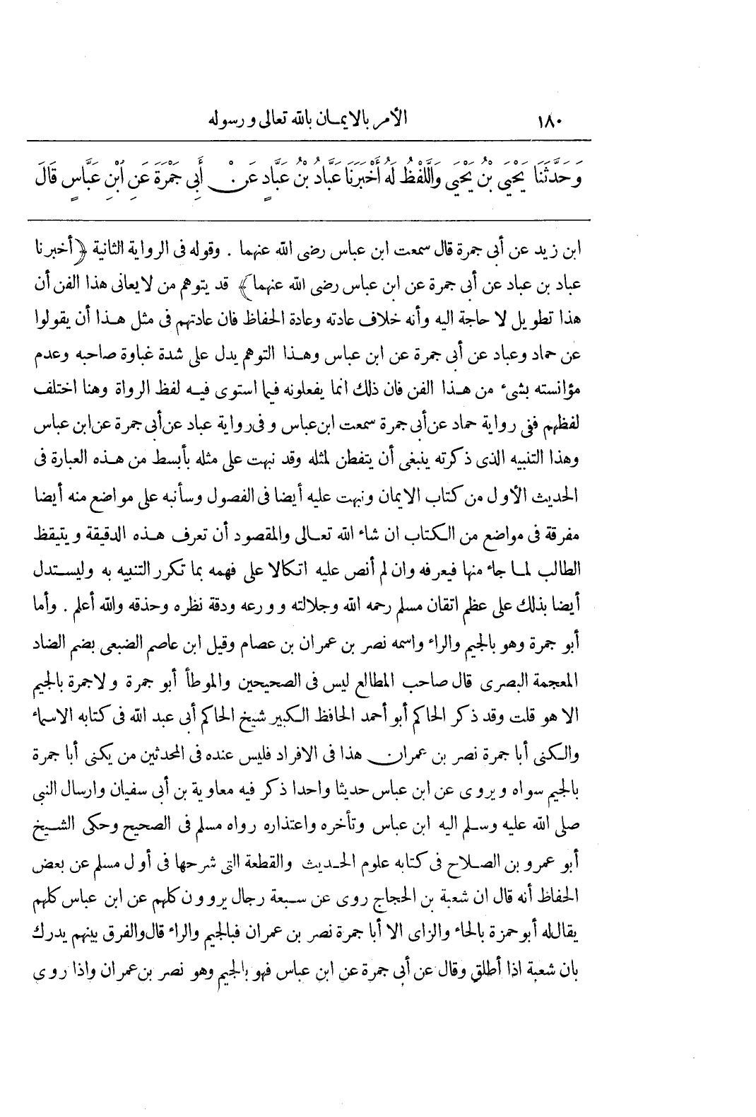 بْنُ زَيْدٍ عَنْ أَبِي جَمْرَةَ قَالَ سَمِعْتُ بن عَبَّاسٍ رَضِيَ اللَّهُ عَنْهُمَا وَقَوْلُهُ فِي الرِّوَايَةِ الثَّانِيَةِ (أَخْبَرَنَا عَبَّادُ بْنُ عَبَّادٍ عَنْ أَبِي جمرة عن بن عَبَّاسٍ رَضِيَ اللَّهُ عَنْهُمَا) قَدْ يَتَوَهَّمُ مَنْ لَا يُعَانِي هَذَا الْفَنَّ أَنَّ هَذَا تَطْوِيلٌ لَا حَاجَةَ إِلَيْهِ وَأَنَّهُ خِلَافَ عَادَتِهِ وَعَادَةِ الْحُفَّاظِ فَإِنَّ عَادَتَهُمْ فِي مِثْلِ هَذَا أَنْ يَقُولُوا عَنْ حَمَّادٍ وَعَبَّادٍ عَنْ أَبِي جَمْرَةَ عن بن عَبَّاسٍ وَهَذَا التَّوَهُّمُ يَدُلُّ عَلَى شِدَّةِ غَبَاوَةِ صَاحِبِهِ وَعَدَمِ مُؤَانَسَتِهِ بِشَيْءٍ مِنْ هَذَا الْفَنِّ فَإِنَّ ذَلِكَ إِنَّمَا يَفْعَلُونَهُ فِيمَا اسْتَوَى فِيهِ لَفْظُ الرُّوَاةِ وَهُنَا اخْتَلَفَ لَفْظُهُمْ فَفِي رِوَايَةِ حماد عن أبى جمرة سمعت بن عَبَّاسٍ وَفِي رِوَايَةِ عَبَّادٍ عَنْ أَبِي جَمْرَةَ عن بن عَبَّاسٍ وَهَذَا التَّنْبِيهُ الَّذِي ذَكَرْتُهُ يَنْبَغِي أَنْ يُتَفَطَّنَ لِمِثْلِهِ وَقَدْ نَبَّهْتُ عَلَى مِثْلِهِ بِأَبْسَطَ مِنْ هَذِهِ الْعِبَارَةِ فِي الْحَدِيثِ الْأَوَّلِ مِنْ كِتَابِ الْإِيمَانِ وَنَبَّهْتُ عَلَيْهِ أَيْضًا فِي الْفُصُولِ وَسَأُنَبِّهُ عَلَى مَوَاضِعَ مِنْهُ أَيْضًا مُفَرَّقَةٍ فِي مَوَاضِعَ مِنَ الْكِتَابِ إِنْ شَاءَ اللَّهُ تَعَالَى وَالْمَقْصُودُ أَنْ تَعْرِفَ هَذِهِ الدَّقِيقَةَ وَيَتَيَقَّظُ الطَّالِبُ لِمَا جَاءَ مِنْهَا فَيَعْرِفَهُ وَإِنْ لَمْ أَنُصَّ عَلَيْهِ اتِّكَالًا عَلَى فَهْمِهِ بِمَا تَكَرَّرَ التَّنْبِيهُ بِهِ وَلِيُسْتَدَلَّ أَيْضًا بِذَلِكَ عَلَى عِظَمِ إِتْقَانِ مُسْلِمٍ رَحِمَهُ اللَّهُ وَجَلَالَتِهِ وَوَرَعِهِ وَدِقَّةِ نَظَرِهِ وَحِذْقِهِ وَاللَّهُ أَعْلَمُ وَأَمَّا أَبُو جَمْرَةَ وَهُوَ بِالْجِيمِ وَالرَّاءِ وَاسْمُهُ نَصْرُ بْنُ عِمْرَانَ بْنِ عصام وقيل بن عَاصِمٍ الضُّبَعِيُّ بِضَمِّ الضَّادِ الْمُعْجَمَةِ الْبَصْرِيُّ قَالَ صَاحِبُ الْمَطَالِعِ لَيْسَ فِي الصَّحِيحَيْنِ وَالْمُوَطَّأِ أَبُو جَمْرَةَ وَلَا جَمْرَةَ بِالْجِيمِ إِلَّا هُوَ قُلْتُ وَقَدْ ذَكَرَ الْحَاكِمُ أَبُو أَحْمَدَ الْحَافِظُ الْكَبِيرُ شيخ الحاكم أبى عبد الله فى كتاب الْأَسْمَاءُ وَالْكُنَى أَبَا جَمْرَةَ نَصْرُ بْنُ عِمْرَانَ هَذَا فِي الْأَفْرَادِ فَلَيْسَ عِنْدَهُ فِي الْمُحَدِّثِينَ مَنْ يُكْنَى أَبَا جَمْرَةَ بِالْجِيمِ سِوَاهُ وَيَرْوِي عن بن عَبَّاسٍ حَدِيثًا وَاحِدًا ذَكَرَ فِيهِ مُعَاوِيَةَ بْنَ أَبِي سُفْيَانَ وَإِرْسَالَ النَّبِيِّ صَلَّى اللَّهُ عَلَيْهِ وسلم إليه بن عَبَّاسٍ وَتَأَخُّرَهُ وَاعْتِذَارَهُ رَوَاهُ مُسْلِمٌ فِي الصَّحِيحِ وَحَكَى الشَّيْخُ أَبُو عَمْرِو بْنُ الصَّلَاحِ فِي كِتَابِهِ عُلُومُ الْحَدِيثِ وَالْقِطْعَةُ الَّتِي شَرَحَهَا فِي أَوَّلِ مُسْلِمٍ عَنْ بَعْضِ الْحُفَّاظِ أَنَّهُ قَالَ إِنَّ شُعْبَةَ بْنَ الْحَجَّاجِ رَوَى عَنْ سَبْعَةِ رجال يروون كلهم عن بن عَبَّاسٍ كُلُّهُمْ يُقَالُ لَهُ أَبُو حَمْزَةَ بِالْحَاءِ والزاى الاأبا جَمْرَةَ نَصْرُ بْنُ عِمْرَانَ فَبِالْجِيمِ وَالرَّاءِ قَالَ وَالْفَرْقُ بَيْنهمْ يُدْرَكُ بِأَنَّ شُعْبَةَ إِذَا أَطْلَقَ وقال عن أبى جمرة عن بن عَبَّاسٍ فَهُوَ بِالْجِيمِ وَهُوَ نَصْرُ بْنُ عِمْرَانَ واذا روى