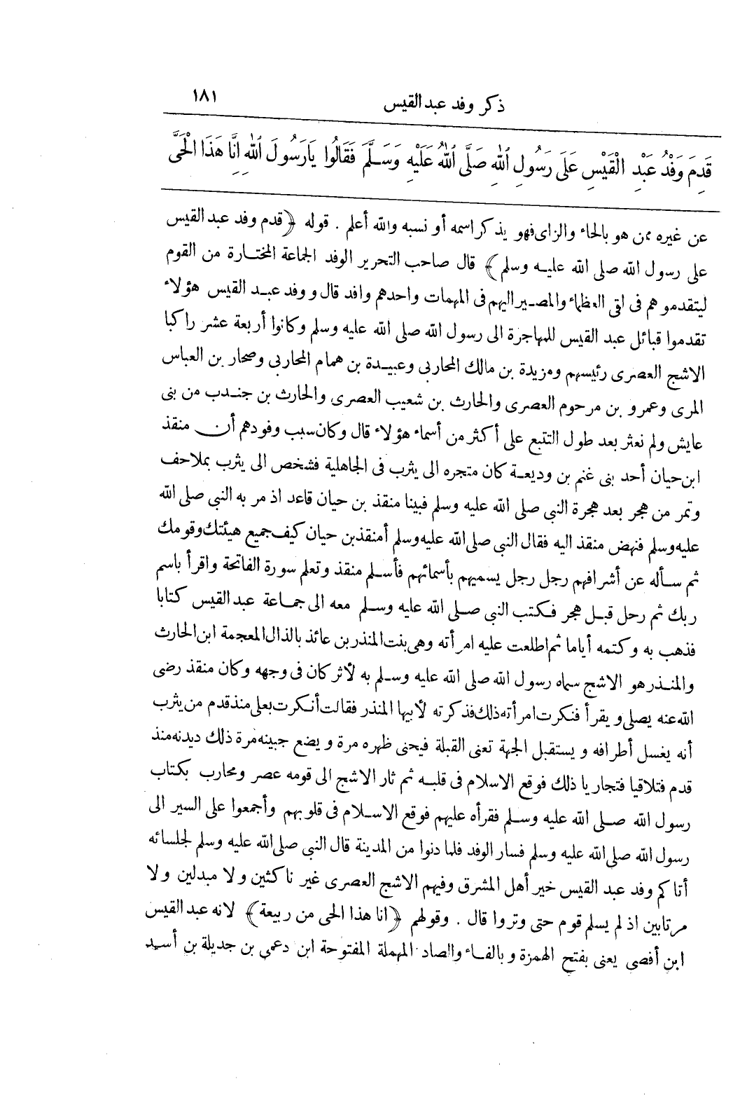 عَنْ غَيْرِهِ مِمَّنْ هُوَ بِالْحَاءِ وَالزَّايِ فَهُوَ يَذْكُرُ اسْمَهُ أَوْ نَسَبَهُ وَاللَّهُ أَعْلَمُ قَوْلُهُ (قَدِمَ وَفْدُ عَبْدِ الْقَيْسِ عَلَى رَسُولِ اللَّهِ صَلَّى اللَّهُ عَلَيْهِ وَسَلَّمَ) قَالَ صَاحِبُ التَّحْرِيرِ الْوَفْدُ الْجَمَاعَةُ الْمُخْتَارَةُ مِنَ الْقَوْمِ لِيَتَقَدَّمُوهُمْ فِي لُقِيِّ الْعُظَمَاءِ وَالْمَصِيرِ إِلَيْهِمْ فِي الْمُهِمَّاتِ وَاحِدُهُمْ وَافِدٌ قَالَ وَوَفْدُ عَبْدِ الْقَيْسِ هَؤُلَاءِ تَقَدَّمُوا قَبَائِلَ عَبْدِ الْقَيْسِ لِلْمُهَاجَرَةِ إِلَى رَسُولِ اللَّهِ صَلَّى اللَّهُ عَلَيْهِ وَسَلَّمَ وَكَانُوا أَرْبَعَةَ عَشَرَ رَاكِبًا الْأَشَجُّ الْعَصْرِيُّ رَئِيسُهُمْ وَمَزِيدَةُ بْنُ مَالِكٍ الْمُحَارِبِيُّ وَعُبَيْدَةُ بْنُ هَمَّامٍ الْمُحَارِبِيُّ وَصَحَّارُ بْنُ العباس المرى وعمرو بن مرحوم الْعَصْرِيُّ وَالْحَارِثُ بْنُ شُعَيْبٍ الْعَصْرِيُّ وَالْحَارِثُ بْنُ جُنْدُبٍ مِنْ بَنِي عَايِشٍ وَلَمْ نَعْثُرْ بَعْدَ طُولِ التَّتَبُّعِ عَلَى أَكْثَرَ مِنْ أَسْمَاءِ هَؤُلَاءِ قَالَ وَكَانَ سَبَبُ وُفُودِهِمْ أَنَّ مُنْقِذَ بْنَ حَيَّانَ أَحَدُ بَنِي غَنْمِ بْنِ وَدِيعَةَ كَانَ مَتْجَرُهُ إِلَى يَثْرِبَ فِي الْجَاهِلِيَّةِ فَشَخَصَ إِلَى يَثْرِبَ بِمَلَاحِفَ وَتَمْرٍ مِنْ هَجَرَ بَعْدَ هِجْرَةِ النَّبِيِّ صَلَّى اللَّهُ عَلَيْهِ وَسَلَّمَ فَبَيْنَا مُنْقِذُ بْنُ حَيَّانَ قَاعِدٌ إِذْ مَرَّ بِهِ النَّبِيُّ صَلَّى اللَّهُ عَلَيْهِ وَسَلَّمَ فَنَهَضَ مُنْقِذٌ إِلَيْهِ فَقَالَ النَّبِيُّ صَلَّى اللَّهُ عَلَيْهِ وَسَلَّمَ أَمُنْقِذُ بْنُ حَيَّانَ كَيْفَ جَمِيعُ هَيْئَتِكَ وَقَوْمِكَ ثُمَّ سأله عن أشرافهم رجل رجل يسميهم بأسمائهم فَأَسْلَمَ مُنْقِذٌ وَتَعَلَّمَ سُورَةَ الْفَاتِحَةِ وَاقْرَأْ بِاسْمِ رَبِّكَ ثُمَّ رَحَلَ قِبَلَ هَجَرَ فَكَتَبَ النَّبِيُّ صَلَّى اللَّهُ عَلَيْهِ وَسَلَّمَ مَعَهُ إِلَى جَمَاعَةِ عَبْدِ الْقَيْسِ كِتَابًا فَذَهَبَ بِهِ وَكَتَمَهُ أَيَّامًا ثُمَّ اطَّلَعَتْ عَلَيْهِ امْرَأَتُهُ وَهِيَ بِنْتُ الْمُنْذِرِ بن عائذ بالذال المعجمة بن الحارث وَالْمُنْذِرُ هُوَ الْأَشَجُّ سَمَّاهُ رَسُولُ اللَّهِ صَلَّى اللَّهُ عَلَيْهِ وَسَلَّمَ بِهِ لِأَثَرٍ كَانَ فِي وَجْهِهِ وَكَانَ مُنْقِذٌ رَضِيَ اللَّهُ عَنْهُ يُصَلِّي وَيَقْرَأُ فَنَكِرَتِ امْرَأَتُهُ ذَلِكَ فَذَكَرَتْهُ لِأَبِيهَا الْمُنْذِرِ فَقَالَتْ أَنْكَرْتُ بَعْلِي مُنْذُ قَدِمَ مِنْ يَثْرِبَ إِنَّهُ يَغْسِلُ أَطْرَافَهُ وَيَسْتَقْبِلُ الْجِهَةَ تَعْنِي الْقِبْلَةَ فَيَحْنِي ظَهْرَهُ مَرَّةً وَيَضَعُ جَبِينَهُ مَرَّةً ذَلِكَ دَيْدَنُهُ مُنْذُ قَدِمَ فَتَلَاقَيَا فَتَجَارَيَا ذَلِكَ فَوَقَعَ الْإِسْلَامُ فِي قَلْبِهِ ثُمَّ ثَارَ الْأَشَجُّ إِلَى قَوْمِهِ عَصَرٍ وَمُحَارِبٍ بِكِتَابِ رَسُولِ اللَّهِ صَلَّى اللَّهُ عَلَيْهِ وَسَلَّمَ فَقَرَأَهُ عَلَيْهِمْ فَوَقَعَ الْإِسْلَامُ فِي قُلُوبِهِمْ وَأَجْمَعُوا عَلَى السَّيْرِ إِلَى رَسُولِ اللَّهِ صَلَّى اللَّهُ عَلَيْهِ وَسَلَّمَ فَسَارَ الْوَفْدُ فَلَمَّا دَنَوْا مِنَ الْمَدِينَةِ قَالَ النَّبِيُّ صَلَّى اللَّهُ عَلَيْهِ وَسَلَّمَ لِجُلَسَائِهِ أَتَاكُمْ وَفْدُ عَبْدِ الْقَيْسِ خَيْرُ أَهْلِ الْمَشْرِقِ وَفِيهِمُ الْأَشَجُّ الْعَصَرِيُّ غَيْرَ نَاكِثِينَ وَلَا مُبَدِّلِينَ وَلَا مُرْتَابِينَ إِذْ لَمْ يُسْلِمْ قَوْمٌ حَتَّى وُتِرُوا قَالَ وَقَوْلُهُمْ (إِنَّا هَذَا الْحَيَّ مِنْ رَبِيعَةَ) لِأَنَّهُ عَبْدُ الْقَيْسِ بْنُ أَفْصَى يَعْنِي بِفَتْحِ الْهَمْزَةِ وَبِالْفَاءِ والصاد المهملة المفتوحة بن دَعْمِيِّ بْنِ جَدِيلَةَ بْنِ أَسَدِ