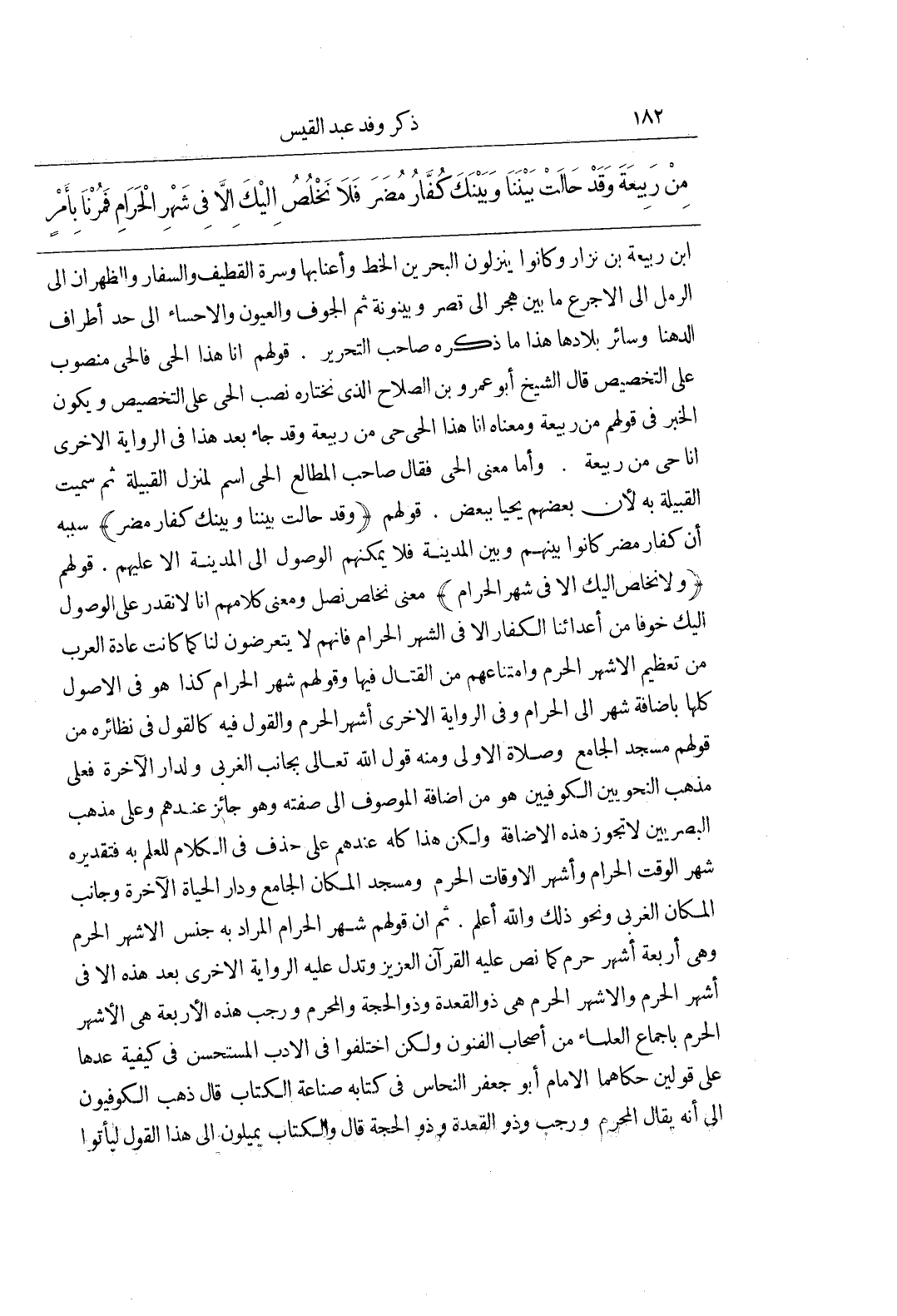 بْنِ رَبِيعَةَ بْنِ نِزَارٍ وَكَانُوا يَنْزِلُونَ الْبَحْرَيْنَ الخط وأعنابها وسرة القطيف والسفار والظهران إلى لرمل إِلَى الْأَجْرَعِ مَا بَيْنَ هَجَرَ إِلَى قَصْرِ وَبَيْنُونَةَ ثُمَّ الْجَوْفَ وَالْعُيُونَ وَالْأَحْسَاءَ إِلَى حَدِّ أطراف الدهنا وَسَائِرِ بِلَادِهَا هَذَا مَا ذَكَرَهُ صَاحِبُ التَّحْرِيرِ قَوْلُهُمْ إِنَّا هَذَا الْحَيَّ فَالْحَيُّ مَنْصُوبٌ عَلَى التَّخْصِيصِ قَالَ الشَّيْخُ أَبُو عَمْرِو بْنُ الصَّلَاحِ الَّذِي نَخْتَارُهُ نَصْبُ الْحَيِّ عَلَى التَّخْصِيصِ وَيَكُونُ الْخَبَرُ فِي قَوْلِهِمْ مِنْ رَبِيعَةَ وَمَعْنَاهُ إِنَّا هَذَا الْحَيُّ حَيٌّ مِنْ رَبِيعَةَ وَقَدْ جَاءَ بَعْدَ هَذَا فِي الرِّوَايَةِ الْأُخْرَى إِنَّا حَيٌّ مِنْ رَبِيعَةَ وَأَمَّا مَعْنَى الْحَيِّ فَقَالَ صَاحِبُ الْمَطَالِعِ الْحَيُّ اسْمٌ لِمَنْزِلِ الْقَبِيلَةِ ثُمَّ سُمِّيَتِ الْقَبِيلَةُ بِهِ لِأَنَّ بَعْضَهُمْ يَحْيَا بِبَعْضٍ قَوْلُهُمْ (وَقَدْ حَالَتْ بَيْننَا وَبَيْنَكَ كُفَّارُ مُضَرَ) سَبَبُهُ أَنَّ كُفَّارَ مُضَرَ كَانُوا بَيْنَهُمْ وَبَيْنَ الْمَدِينَةِ فَلَا يُمْكِنُهُمُ الْوُصُولُ إِلَى الْمَدِينَةِ إِلَّا عَلَيْهِمْ قَوْلُهُمْ (وَلَا نَخْلُصُ إِلَيْكَ إِلَّا فِي شَهْرِ الْحَرَامِ) مَعْنَى نَخْلُصُ نَصِلُ وَمَعْنَى كَلَامِهِمْ أَنَّا لَا نَقْدِرُ عَلَى الْوُصُولِ إِلَيْكَ خَوْفًا مِنْ أَعْدَائِنَا الْكُفَّارِ إِلَّا فِي الشَّهْرِ الْحَرَامِ فَإِنَّهُمْ لَا يَتَعَرَّضُونَ لَنَا كَمَا كَانَتْ عَادَةُ الْعَرَبِ من تعظيم الاشهر الحرم وَامْتِنَاعِهِمْ مِنَ الْقِتَالِ فِيهَا وَقَوْلُهُمْ شَهْرُ الْحَرَامِ كَذَا هُوَ فِي الْأُصُولِ كُلِّهَا بِإِضَافَةِ شَهْرٍ إِلَى الْحَرَامِ وَفِي الرِّوَايَةِ الْأُخْرَى أَشْهُرُ الْحُرُمُ وَالْقَوْلُ فِيهِ كَالْقَوْلِ فِي نَظَائِرِهِ مِنْ قَوْلِهِمْ مَسْجِدُ الْجَامِعِ وَصَلَاةُ الْأُولَى وَمِنْهُ قَوْلُ اللَّهِ تعالى بجانب الغربى ولدار الآخرة فَعَلَى مَذْهَبِ النَّحْوِيِّينَ الْكُوفِيِّينَ هُوَ مِنْ إِضَافَةِ الْمَوْصُوفِ إِلَى صِفَتِهِ وَهُوَ جَائِزٌ عِنْدَهُمْ وَعَلَى مَذْهَبِ الْبَصْرِيِّينَ لَا تَجُوزُ هَذِهِ الْإِضَافَةُ وَلَكِنَّ هَذَا كُلَّهُ عِنْدَهُمْ عَلَى حَذْفٍ فِي الْكَلَامِ لِلْعِلْمِ بِهِ فَتَقْدِيرُهُ شَهْرُ الْوَقْتِ الْحَرَامِ وَأَشْهُرُ الْأَوْقَاتِ الْحُرُمِ وَمَسْجِدُ الْمَكَانِ الْجَامِعِ وَدَارُ الْحَيَاةِ الْآخِرَةِ وَجَانِبُ الْمَكَانِ الْغَرْبِيِّ وَنَحْوُ ذَلِكَ وَاللَّهُ أَعْلَمُ ثُمَّ إِنَّ قَوْلَهُمْ شَهْرُ الْحَرَامِ الْمُرَادُ بِهِ جِنْسُ الْأَشْهُرِ الْحُرُمِ وَهِيَ أَرْبَعَةُ أَشْهُرٍ حُرُمٍ كَمَا نَصَّ عَلَيْهِ الْقُرْآنُ الْعَزِيزُ وَتَدُلُّ عَلَيْهِ الرِّوَايَةُ الْأُخْرَى بَعْدَ هَذِهِ إِلَّا فِي أَشْهُرِ الْحُرُمِ وَالْأَشْهُرُ الْحُرُمُ هِيَ ذُو الْقَعْدَةِ وَذُو الْحِجَّةِ وَالْمُحَرَّمُ وَرَجَبٌ هَذِهِ الْأَرْبَعَةُ هِيَ الْأَشْهُرُ الْحُرُمُ بِإِجْمَاعِ الْعُلَمَاءِ مِنْ أَصْحَابِ الْفُنُونِ وَلَكِنِ اخْتَلَفُوا فِي الْأَدَبِ الْمُسْتَحْسَنِ فِي كَيْفِيَّةِ عَدِّهَا عَلَى قَوْلَيْنِ حَكَاهُمَا الْإِمَامُ أَبُو جَعْفَرٍ النَّحَّاسُ فِي كِتَابِهِ صِنَاعَةُ الْكُتَّابِ قَالَ ذَهَبَ الْكُوفِيّونَ إِلَى أَنَّهُ يُقَالُ الْمُحَرَّمُ وَرَجَبٌ وَذُو الْقَعْدَةِ وَذُو الْحِجَّةِ قَالَ وَالْكُتَّابُ يَمِيلُونَ إِلَى هَذَا الْقَوْلِ لِيَأْتُوا