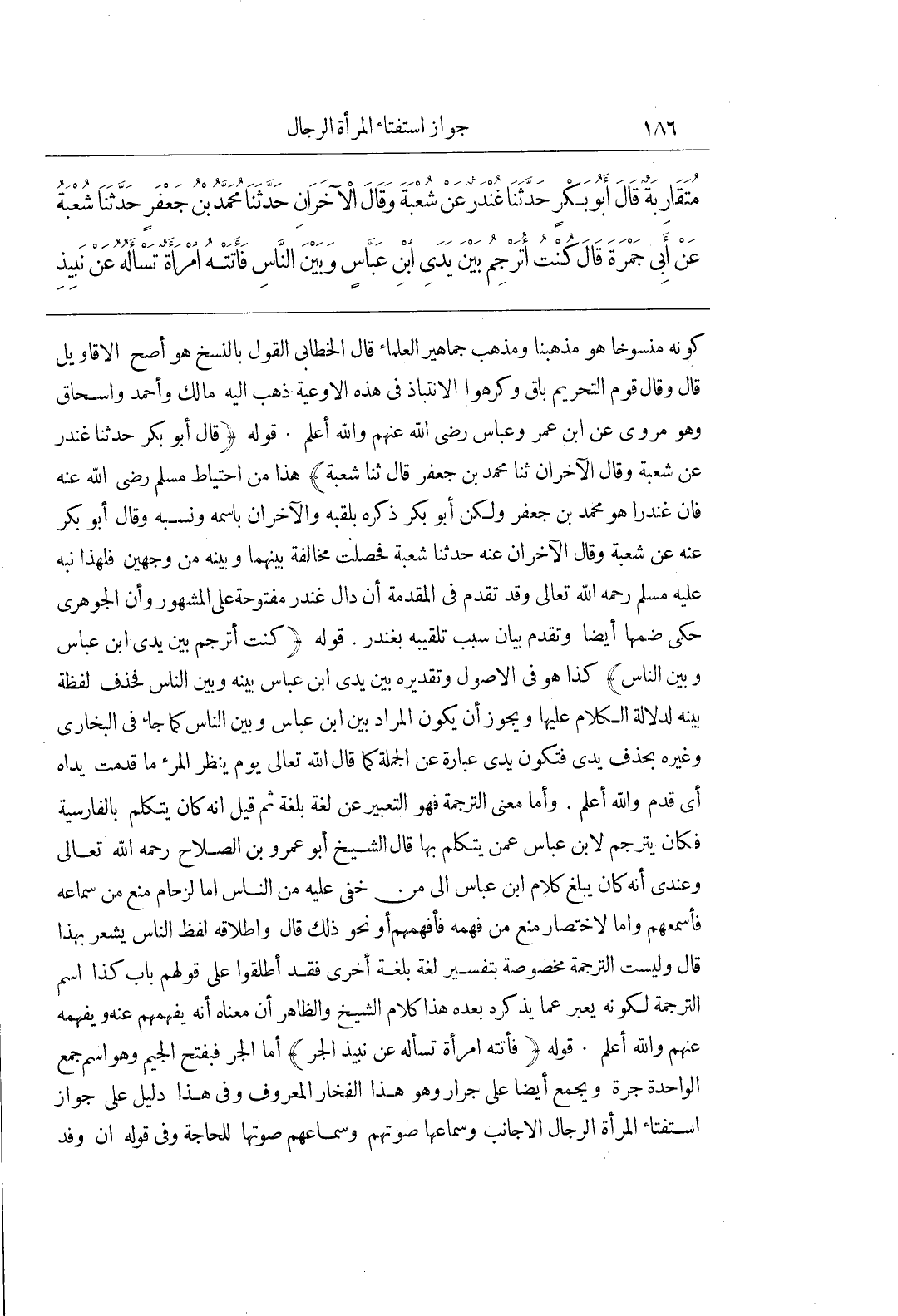 كونه منسوحا هُوَ مَذْهَبُنَا وَمَذْهَبُ جَمَاهِيرِ الْعُلَمَاءِ قَالَ الْخَطَّابِيُّ الْقَوْلُ بِالنَّسْخِ هُوَ أَصَحُّ الْأَقَاوِيلِ قَالَ وَقَالَ قَوْمٌ التَّحْرِيمُ بَاقٍ وَكَرِهُوا الِانْتِبَاذَ فِي هَذِهِ الْأَوْعِيَةِ ذَهَبَ إِلَيْهِ مَالِكٌ وَأَحْمَدُ وَإِسْحَاقُ وَهُوَ مروى عن بن عُمَرَ وَعَبَّاسٍ رَضِيَ اللَّهُ عَنْهُمْ وَاللَّهُ أَعْلَمُ قَوْلُهُ (قَالَ أَبُو بَكْرٍ حَدَّثَنَا غُنْدَرٌ عَنْ شعبة وقال الآخران ثنا محمد بن جعفر قال ثنا شُعْبَةُ) هَذَا مِنِ احْتِيَاطِ مُسْلِمٍ رَضِيَ اللَّهُ عَنْهُ فَإِنَّ غُنْدَرًا هُوَ مُحَمَّدُ بْنُ جَعْفَرٍ وَلَكِنْ أَبُو بَكْرٍ ذَكَرَهُ بِلَقَبِهِ وَالْآخَرَانِ بِاسْمِهِ وَنَسَبهِ وَقَالَ أَبُو بَكْرٍ عَنْهُ عَنْ شُعْبَةَ وقال الْآخَرَانِ عَنْهُ حَدَّثَنَا شُعْبَةُ فَحَصَلَتْ مُخَالَفَةٌ بَيْنهمَا وَبَيْنَهُ مِنْ وَجْهَيْنِ فَلِهَذَا نَبَّهَ عَلَيْهِ مُسْلِمٌ رَحِمَهُ اللَّهُ تَعَالَى وَقَدْ تَقَدَّمَ فِي الْمُقَدِّمَةِ أَنَّ دَالَ غُنْدَرٍ مَفْتُوحَةٌ عَلَى الْمَشْهُورِ وَأَنَّ الْجَوْهَرِيَّ حَكَى ضَمَّهَا أَيْضًا وَتَقَدَّمَ بَيَانُ سَبَبِ تَلْقِيبِهِ بِغُنْدَرٍ قَوْلُهُ (كُنْتُ أُتَرْجِمُ بَيْنَ يَدَيِ بن عَبَّاسٍ وَبَيْنَ النَّاسِ) كَذَا هُوَ فِي الْأُصُولِ وتقديره بين يدى بن عَبَّاسٍ بَيْنَهُ وَبَيْنَ النَّاسِ فَحَذَفَ لَفْظَةَ بَيْنَهُ لِدَلَالَةِ الْكَلَامِ عَلَيْهَا وَيَجُوزُ أَنْ يَكُونَ الْمُرَادُ بين بن عَبَّاسٍ وَبَيْنَ النَّاسِ كَمَا جَاءَ فِي الْبُخَارِيِّ وَغَيْرِهِ بِحَذْفِ يَدَيْ فَتَكُونُ يَدَيْ عِبَارَةً عَنِ الْجُمْلَةِ كَمَا قَالَ اللَّهُ تَعَالَى يَوْمَ يَنْظُرُ المرء ما قدمت يداه أَيْ قَدَّمَ وَاللَّهُ أَعْلَمُ وَأَمَّا مَعْنَى التَّرْجَمَةِ فَهُوَ التَّعْبِيرُ عَنْ لُغَةٍ بِلُغَةٍ ثُمَّ قِيلَ إِنَّهُ كَانَ يَتَكَلَّمُ بِالْفَارِسِيَّةِ فَكَانَ يُتَرْجِمُ لِابْنِ عَبَّاسٍ عَمَّنْ يَتَكَلَّمُ بِهَا قَالَ الشَّيْخُ أَبُو عَمْرِو بْنُ الصَّلَاحِ رَحِمَهُ اللَّهُ تَعَالَى وَعِنْدِي أنه كان يبلغ كلام بن عَبَّاسٍ إِلَى مَنْ خَفِيَ عَلَيْهِ مِنَ النَّاسِ إِمَّا لِزِحَامٍ مَنَعَ مِنْ سَمَاعِهِ فَأَسْمَعَهُمْ وَإِمَّا لِاخْتِصَارٍ مَنَعَ مِنْ فَهْمِهِ فَأَفْهَمَهُمْ أَوْ نَحْوِ ذَلِكَ قَالَ وَإِطْلَاقُهُ لَفْظَ النَّاسِ يُشْعِرُ بِهَذَا قَالَ وَلَيْسَتِ التَّرْجَمَةُ مَخْصُوصَةً بِتَفْسِيرِ لُغَةٍ بِلُغَةٍ أُخْرَى فَقَدْ أَطْلَقُوا عَلَى قَوْلِهِمْ بَابُ كَذَا اسْمَ التَّرْجَمَةِ لِكَوْنِهِ يُعَبِّرُ عَمَّا يَذْكُرُهُ بَعْدَهُ هَذَا كَلَامُ الشَّيْخِ وَالظَّاهِرُ أَنَّ مَعْنَاهُ أَنَّهُ يُفْهِمُهُمْ عَنْهُ وَيُفْهِمُهُ عَنْهُمْ وَاللَّهُ أَعْلَمُ قَوْلُهُ (فَأَتَتْهُ امْرَأَةٌ تَسْأَلهُ عَنْ نَبِيذِ الْجَرِّ) أَمَّا الْجَرُّ فَبِفَتْحِ الْجِيمِ وَهُوَ اسْمُ جَمْعٍ الْوَاحِدَةُ جَرَّةٌ وَيُجْمَعُ أَيْضًا عَلَى جِرَارٍ وَهُوَ هَذَا الْفَخَّارُ الْمَعْرُوفُ وَفِي هَذَا دَلِيلٌ عَلَى جَوَازِ اسْتِفْتَاءِ الْمَرْأَةِ الرِّجَالَ الْأَجَانِبَ وَسَمَاعِهَا صَوْتَهُمْ وَسَمَاعِهِمْ صَوْتَهَا لِلْحَاجَةِ وَفِي قَوْلِهِ إِنَّ وَفْدَ