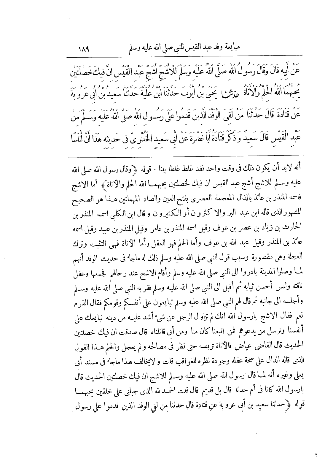 أنه لابد أَنْ يَكُونَ ذَلِكَ فِي وَقْتٍ وَاحِدٍ فَقَدْ غَلِطَ غَلَطًا بَيِّنًا قَوْلُهُ (وَقَالَ رَسُولُ اللَّهِ صَلَّى اللَّهُ عَلَيْهِ وَسَلَّمَ لِلْأَشَجِّ أَشَجِّ عَبْدِ الْقَيْسِ إِنَّ فِيكَ لَخَصْلَتَيْنِ يُحِبُّهُمَا اللَّهُ الْحِلْمُ وَالْأَنَاةُ) أَمَّا الْأَشَجُّ فَاسْمُهُ الْمُنْذِرُ بْنُ عَائِذٍ بِالذَّالِ الْمُعْجَمَةِ الْعَصَرِيُّ بِفَتْحِ الْعَيْنِ وَالصَّادِ الْمُهْمَلَتَيْنِ هذا هو الصحيح المشهور الذى قاله بن عبد البر والاكثرون أو الكثيرون وقال بن الكلبى اسمه المنذر بن الْحَارِثِ بْنُ زِيَادِ بْنِ عَصَرِ بْنِ عَوْفٍ وَقِيلَ اسْمُهُ الْمُنْذِرُ بْنُ عَامِرٍ وَقِيلَ الْمُنْذِرُ بن عبيد وقيل اسمه عائذ بن الْمُنْذِرِ وَقِيلَ عَبْدُ اللَّهِ بْنُ عَوْفٍ وَأَمَّا الحلم فهو العقل وأما الأناة فهي التثبت وَتَرْكُ الْعَجَلَةِ وَهِيَ مَقْصُورَةٌ وَسَبَبُ قَوْلِ النَّبِيِّ صَلَّى اللَّهُ عَلَيْهِ وَسَلَّمَ ذَلِكَ لَهُ مَا جَاءَ فِي حَدِيثِ الْوَفْدِ أَنَّهُمْ لَمَّا وَصَلُوا الْمَدِينَةَ بَادَرُوا إِلَى النَّبِيِّ صَلَّى اللَّهُ عَلَيْهِ وَسَلَّمَ وَأَقَامَ الْأَشَجُّ عِنْدَ رِحَالِهِمْ فَجَمَعَهَا وَعَقَلَ نَاقَتَهُ وَلَبِسَ أَحْسَنَ ثِيَابِهِ ثُمَّ أَقْبَلَ إِلَى النبى صلى الله عليه وسلم فقر به النَّبِيُّ صَلَّى اللَّهُ عَلَيْهِ وَسَلَّمَ وَأَجْلَسَهُ إِلَى جَانِبِهِ ثُمَّ قَالَ لَهُمُ النَّبِيُّ صَلَّى اللَّهُ عَلَيْهِ وَسَلَّمَ تُبَايِعُونَ عَلَى أَنْفُسِكُمْ وَقَوْمِكُمْ فَقَالَ الْقَوْمُ نَعَمْ فَقَالَ الْأَشَجُّ يَا رَسُولَ اللَّهِ إِنَّكَ لَمْ تُزَاوِلِ الرَّجُلَ عَنْ شَيْءٍ أَشَدَّ عَلَيْهِ مِنْ دِينِهِ نُبَايِعُكَ عَلَى أَنْفُسِنَا وَنُرْسِلُ مَنْ يَدْعُوهُمْ فَمَنِ اتَّبَعَنَا كَانَ مِنَّا وَمَنْ أَبَى قَاتَلْنَاهُ قَالَ صَدَقْتَ إِنَّ فِيكَ خَصْلَتَيْنِ الْحَدِيثَ قَالَ الْقَاضِي عِيَاضٌ فَالْأَنَاةُ تَرَبُّصُهُ حَتَّى نَظَرَ فِي مَصَالِحِهِ وَلَمْ يَعْجَلْ وَالْحِلْمُ هَذَا الْقَوْلُ الَّذِي قَالَهُ الدَّالُّ عَلَى صِحَّةِ عَقْلِهِ وَجَوْدَةِ نَظَرِهِ لِلْعَوَاقِبِ قُلْتُ وَلَا يُخَالِفُ هَذَا مَا جَاءَ فِي مُسْنَدِ أَبِي يَعْلَى وَغَيْرِهِ أَنَّهُ لَمَّا قَالَ رَسُولُ اللَّهِ صَلَّى اللَّهُ عَلَيْهِ وَسَلَّمَ لِلْأَشَجِّ إِنَّ فِيكَ خَصْلَتَيْنِ الْحَدِيثَ قَالَ يَا رَسُولَ اللَّهِ كَانَا فِيَّ أَمْ حَدَثَا قَالَ بَلْ قَدِيمٌ قَالَ قُلْتُ الْحَمْدُ لِلَّهِ الَّذِي جَبَلَنِي عَلَى خُلُقَيْنِ يُحِبُّهُمَا قَوْلُهُ