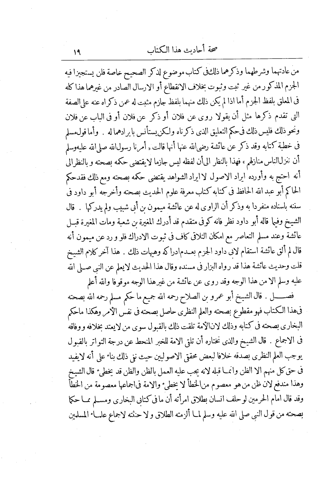 من عادتهما وشرطهما وذكرهما ذلك فى كتاب موضوع لذكر الصحيح خاصة فلن يستجيرا فيه الجزم المذكور من غير ثبت وثبوت بخلاف الانقطاع أو الارسال الصادر من غيرهما هذا كله فى المعلق بلفظ الجزم أما اذا لم يكن ذلك منهما بلفظ جازم مثبت له عمن ذاكره عنه على الصفة التى تقدم ذكرها مثل أن يقولا روى عن فلان أو ذكر عن فلان أو في الباب عن فلان ونحو ذلك فليس ذلك في حكم التعليق الذي ذكرناه ولكن يستأنس بإيرادهما له وأما قول مسلم في خطبة كتابه وقد ذكر عَنْ عَائِشَةَ رَضِيَ اللَّهُ عَنْهَا أَنَّهَا قَالَتْ (أَمَرَنَا رَسُولُ اللَّهِ صَلَّى اللَّهُ عَلَيْهِ وَسَلَّمَ أن ننزل الناس منازلهم) فهذا بالنظر إلى أن لفظه ليس جازما لا يقتضي حكمه بصحته وبالنظر إلى أنه احتج به وأورده ايراد الاصول لا ايراد الشواهد يقتضى حكمه بصحته ومع ذلك فقد حكم الحاكم أبو عبد الله الحافظ في كتابه كتاب معرفة علوم الحديث بصحته وأخرجه أبو داود في سننه باسناده منفردا به وذكر أن الراوي له عن عائشة ميمون بن أبي شبيب ولم يدركها قال الشيخ وفيما قاله أبو داود نظر فانه كوفى متقدم قد أدرك المغيرة بن شعبة ومات المغيرة قبل عائشة وعند مسلم التعاصر مع امكان التلاقي كاف في ثبوت الادراك فلو ورد عن ميمون أنه قال لم ألق عائشة استقام لابي داود الجزم بعدم ادراكه وهيهات ذلك هذا آخر كلام الشيخ قلت وحديث عائشة هذا قد رواه البزار في مسنده وقال هذا الحديث لا يعلم عَنِ النَّبِيِّ صَلَّى اللَّهُ عَلَيْهِ وَسَلَّمَ إِلَّا من هذا الوجه وقد روى عن عائشة من غير هذا الوجه موقوفا والله أعلم