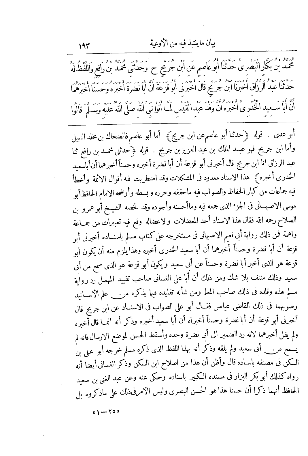 أَبُو عَدِيٍّ قَوْلُهُ (حَدَّثَنَا أَبُو عَاصِمٍ عَنِ بن جُرَيْجٍ أَمَّا أَبُو عَاصِمٍ فَالضَّحَّاكُ بْنُ مَخْلَدٍ النبيل وأما بن جُرَيْجٍ فَهُوَ عَبْدُ الْمَلِكِ بْنُ عَبْدِ الْعَزِيزِ بْنِ جُرَيْجٍ قَوْلُهُ (حَدَّثَنِي مُحَمَّدُ بْنُ رَافِعٍ ثنا عبد الرزاق انا بن جُرَيْجٍ قَالَ أَخْبَرَنِي أَبُو قَزَعَةَ أَنَّ أَبَا نَضْرَةَ أَخْبَرَهُ وَحَسَنًا أَخْبَرَهُمَا أَنَّ أَبَا سَعِيدٍ الْخُدْرِيَّ أَخْبَرَهُ) هَذَا الْإِسْنَادُ مَعْدُودٌ فِي الْمُشْكِلَاتِ وَقَدِ اضْطَرَبَتْ فِيهِ أَقْوَالُ الْأَئِمَّةِ وَأَخْطَأَ فِيهِ جماعات من كبار الحفاظ والصواب فِيهِ مَا حَقَّقَهُ وَحَرَّرَهُ وَبَسَطَهُ وَأَوْضَحَهُ الْإِمَامُ الْحَافِظُ أَبُو مُوسَى الْأَصْبَهَانِيُّ فِي الْجُزْءِ الَّذِي جَمَعَهُ فِيهِ وَمَا أَحْسَنَهُ وَأَجْوَدَهُ وَقَدْ لَخَّصَهُ الشَّيْخُ أَبُو عَمْرِو بْنُ الصَّلَاحِ رَحِمَهُ اللَّهُ فَقَالَ هَذَا الْإِسْنَادُ أَحَدُ الْمُعْضِلَاتِ وَلِإِعْضَالِهِ وَقَعَ فِيهِ تَعْبِيرَاتٌ مِنْ جَمَاعَةٍ وَاهِمَةٍ فَمِنْ ذَلِكَ رِوَايَةُ أَبِي نُعَيْمٍ الْأَصْبَهَانِيِّ فِي مُسْتَخْرَجِهِ عَلَى كِتَابِ مُسْلِمٍ بِإِسْنَادِهِ أَخْبَرَنِي أَبُو قَزَعَةَ أَنَّ أَبَا نَضْرَةَ وَحَسَنًا أَخْبَرَهُمَا أَنَّ أَبَا سَعِيدٍ الْخُدْرِيَّ أَخْبَرَهُ وَهَذَا يَلْزَمُ مِنْهُ أَنْ يَكُونَ أَبُو قَزَعَةَ هُوَ الَّذِي أَخْبَرَ أَبَا نَضْرَةَ وَحَسَنًا عَنْ أَبِي سَعِيدٍ وَيَكُونُ أَبُو قَزَعَةَ هُوَ الَّذِي سَمِعَ مِنْ أَبِي سَعِيدٍ وَذَلِكَ مُنْتَفٍ بِلَا شَكٍّ وَمِنْ ذَلِكَ أَنَّ أَبَا عَلِيٍّ الْغَسَّانِيَّ صَاحِبَ تَقْيِيدِ الْمُهْمَلِ رَدَّ رِوَايَةَ مُسْلِمٍ هَذِهِ وَقَلَّدَهُ فِي ذَلِكَ صَاحِبُ الْمُعْلِمِ وَمِنْ شَأْنِهِ تَقْلِيدُهُ فِيمَا يَذْكُرُهُ مِنْ عِلْمِ الْأَسَانِيدِ وَصَوَّبَهُمَا فِي ذَلِكَ الْقَاضِي عِيَاضٌ فَقَالَ أبو علي الصواب فى الاسناد عن بن جُرَيْجٍ قَالَ أَخْبَرَنِي أَبُو قَزَعَةَ أَنَّ أَبَا نَضْرَةَ وَحَسَنًا أَخْبَرَاهُ أَنَّ أَبَا سَعِيدٍ أَخْبَرَهُ وَذَكَرَ أَنَّهُ إِنَّمَا قَالَ أَخْبَرَهُ وَلَمْ يَقُلْ أَخْبَرَهُمَا لِأَنَّهُ رَدَّ الضَّمِيرَ إِلَى أَبِي نَضْرَةَ وَحْدَهُ وَأَسْقَطَ الْحَسَنَ لِمَوْضِعِ الْإِرْسَالِ فَإِنَّهُ لَمْ يَسْمَعْ مِنْ أَبِي سَعِيدٍ وَلَمْ يَلْقَهُ وَذَكَرَ أَنَّهُ بِهَذَا اللَّفْظِ الَّذِي ذَكَرَهُ مُسْلِمٌ خَرَّجَهُ أَبُو عَلِيِّ بْنُ السَّكَنِ فِي مُصَنَّفِهِ بِإِسْنَادِهِ قال وأظن أن هذا من اصلاح بن السَّكَنِ وَذَكَرَ الْغَسَّانِيُّ أَيْضًا أَنَّهُ رَوَاهُ كَذَلِكَ أَبُو بَكْرٍ الْبَزَّارُ فِي مُسْنَدِهِ الْكَبِيرِ بِإِسْنَادِهِ وَحُكِيَ عَنْهُ وَعَنْ عَبْدِ الْغَنِيِّ بْنِ سَعِيدٍ الْحَافِظِ أَنَّهُمَا ذَكَرَا أَنَّ حَسَنًا هَذَا هُوَ الْحَسَنُ الْبَصْرِيُّ وَلَيْسَ الْأَمْرُ فِي ذَلِكَ عَلَى مَا ذَكَرُوهُ بَلْ