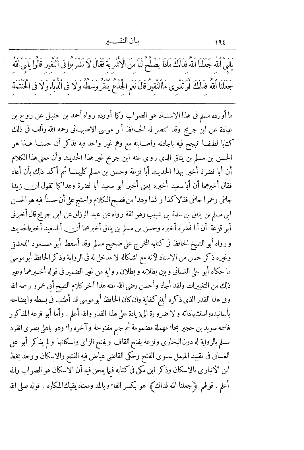 مَا أَوْرَدَهُ مُسْلِمٌ فِي هَذَا الْإِسْنَادِ هُوَ الصَّوَابُ وَكَمَا أَوْرَدَهُ رَوَاهُ أَحْمَدُ بْنُ حَنْبَلٍ عن روح بن عبادة عن بن جُرَيْجٍ وَقَدِ انْتَصَرَ لَهُ الْحَافِظُ أَبُو مُوسَى الْأَصْبَهَانِيُّ رَحِمَهُ اللَّهُ وَأَلَّفَ فِي ذَلِكَ كِتَابًا لَطِيفًا تَبَجَّحَ فِيهِ بِإِجَادَتِهِ وَإِصَابَتِهِ مَعَ وَهْمِ غَيْرِ وَاحِدٍ فِيهِ فَذَكَرَ أَنَّ حَسَنًا هَذَا هُوَ الْحَسَنُ بْنُ مُسْلِمِ بْنِ يَنَاقَ الَّذِي روى عنه بن جريج غَيْرَ هَذَا الْحَدِيثِ وَأَنَّ مَعْنَى هَذَا الْكَلَامِ أَنَّ أَبَا نَضْرَةَ أَخْبَرَ بِهَذَا الْحَدِيثِ أَبَا قَزَعَةَ وَحَسَنُ بْنُ مُسْلِمٍ كِلَيْهِمَا ثُمَّ أَكَّدَ ذَلِكَ بِأَنْ أَعَادَ فَقَالَ أَخْبَرَهُمَا أَنَّ أَبَا سَعِيدٍ أَخْبَرَهُ يَعْنِي أَخْبَرَ أَبُو سَعِيدٍ أَبَا نَضْرَةَ وَهَذَا كَمَا تَقُولُ إِنَّ زَيْدًا جَاءَنِي وَعَمْرًا جَاءَنِي فَقَالَا كَذَا وَكَذَا وَهَذَا مِنْ فَصِيحِ الْكَلَامِ وَاحْتَجَّ عَلِيٌّ أَنَّ حَسَنًا فِيهِ هُوَ الْحَسَنُ بْنُ مُسْلِمِ بْنِ يَنَاقَ بْنِ سَلَمَةَ بْنِ شَبِيبٍ وَهُوَ ثِقَةٌ رَوَاهُ عَنْ عبد الرزاق عن بن جُرَيْجٍ قَالَ أَخْبَرَنِي أَبُو قَزَعَةَ أَنَّ أَبَا نَضْرَةَ أَخْبَرَهُ وَحَسَنُ بْنُ مُسْلِمِ بْنِ يَنَاقَ أَخْبَرَهُمَا أَنَّ أَبَا سَعِيدٍ أَخْبَرَهُ الْحَدِيثَ وَرَوَاهُ أَبُو الشَّيْخِ الْحَافِظُ فِي كِتَابِهِ الْمُخَرَّجُ عَلَى صَحِيحِ مُسْلِمٍ وَقَدْ أَسْقَطَ أَبُو مَسْعُودٍ الدِّمَشْقِيُّ وَغَيْرُهُ ذِكْرَ حَسَنٍ مِنَ الْإِسْنَادِ لِأَنَّهُ مَعَ إِشْكَالِهِ لَا مَدْخَلَ لَهُ فِي الرِّوَايَةِ وَذَكَرَ الْحَافِظُ أَبُو مُوسَى مَا حَكَاهُ أَبُو عَلِيٍّ الْغَسَّانِيُّ وَبَيَّنَ بُطْلَانَهُ وَبُطْلَانَ رِوَايَةِ مِنْ غَيْرِ الضَّمِيرِ فِي قَوْلِهِ أَخْبَرَهُمَا وَغَيْرِ ذَلِكَ مِنَ التَّغْيِيرَاتِ وَلَقَدْ أَجَادَ وَأَحْسَنَ رَضِيَ اللَّهُ عَنْهُ هذا آخر كلام الشيخ أبي عمرو رحمه اللَّهُ وَفِي هَذَا الْقَدْرِ الَّذِي ذَكَرَهُ أَبْلَغُ كِفَايَةٍ وَإِنْ كَانَ الْحَافِظُ أَبُو مُوسَى قَدْ أَطْنَبَ فِي بَسْطِهِ وَإِيضَاحِهِ بِأَسَانِيدِهِ وَاسْتِشْهَادَاتِهِ وَلَا ضَرُورَةَ إِلَى زِيَادَةٍ عَلَى هَذَا الْقَدْرِ وَاللَّهُ أَعْلَمُ وَأَمَّا أَبُو قَزَعَةَ الْمَذْكُورُ فَاسْمُهُ سُوَيْدُ بْنُ حُجَيْرٍ بِحَاءٍ مُهْمَلَةٍ مَضْمُومَةٍ ثُمَّ جِيمٍ مَفْتُوحَةٍ وَآخِرُهُ رَاءٌ وَهُوَ بَاهِلِيٌّ بَصْرِيٌّ انْفَرَدَ مُسْلِمٌ بِالرِّوَايَةِ لَهُ دُونَ الْبُخَارِيِّ وَقَزَعَةُ بِفَتْحِ الْقَافِ وَبِفَتْحِ الزَّايِ وَإِسْكَانِهَا وَلَمْ يَذْكُرْ أَبُو عَلِيٍّ الْغَسَّانِيُّ فِي تَقْيِيدِ الْمُهْمَلِ سِوَى الْفَتْحِ وَحَكَى الْقَاضِي عِيَاضٌ فِيهِ الْفَتْحَ وَالْإِسْكَانَ وَوُجِدَ بخط بن الأنباري بالاسكان وذكر بن مَكِّيٍّ فِي كِتَابِهِ فِيمَا يُلْحَنُ فِيهِ أَنَّ الْإِسْكَانَ هُوَ الصَّوَابُ وَاللَّهُ أَعْلَمُ قَوْلُهُمْ (جَعَلَنَا الله فداك) هو بكسر الفاء وبالمد ومعناه يَقِيكَ الْمَكَارِهَ قَوْلُهُ صَلَّى اللَّهُ عَلَيْهِ وَسَلَّمَ