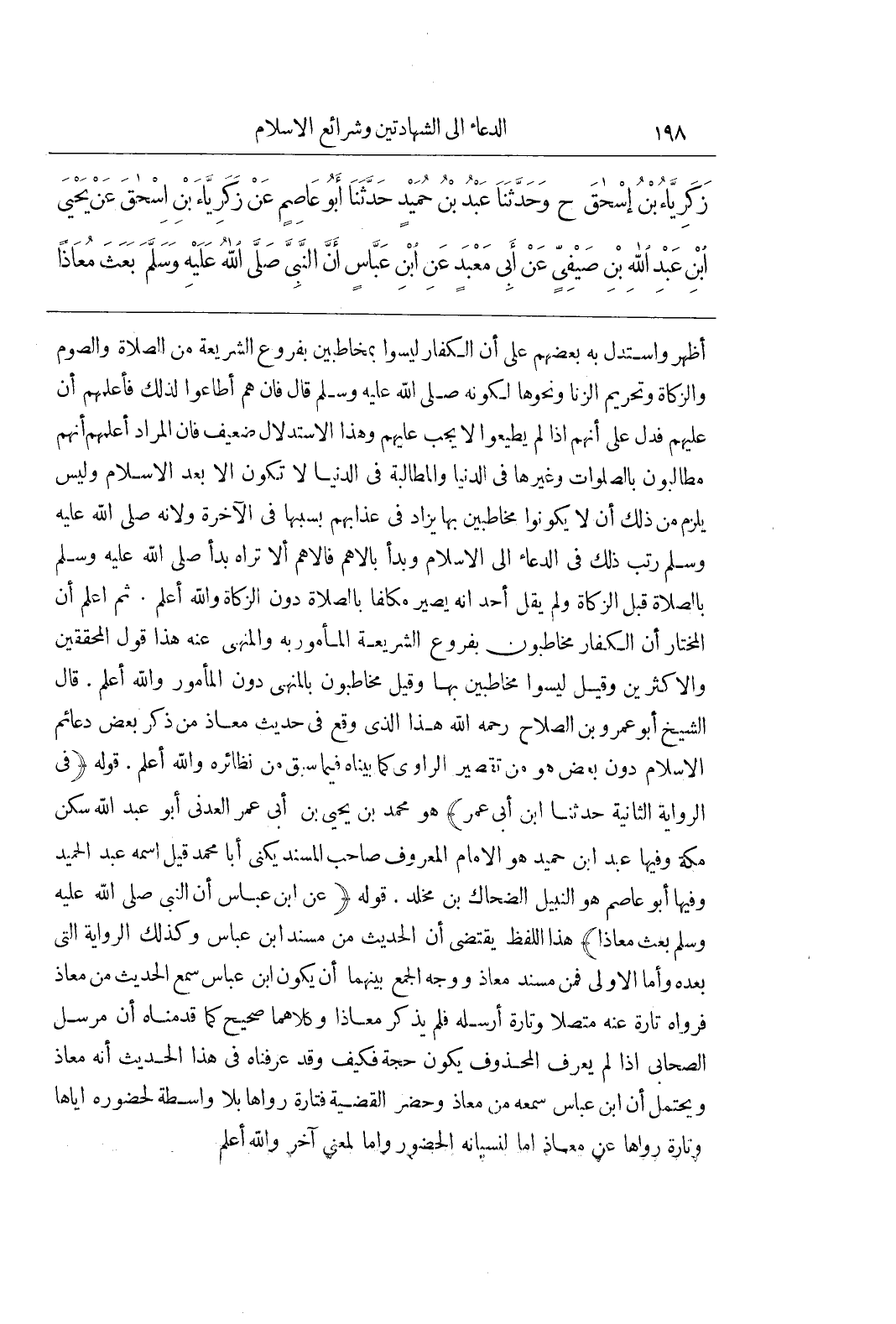 أَظْهَرُ وَاسْتَدَلَّ بِهِ بَعْضُهُمْ عَلَى أَنَّ الْكُفَّارَ لَيْسُوا بِمُخَاطَبِينَ بِفُرُوعِ الشَّرِيعَةِ مِنَ الصَّلَاةِ وَالصَّوْمِ والزكاة وتحريم الزنى وَنَحْوِهَا لِكَوْنِهِ صَلَّى اللَّهُ عَلَيْهِ وَسَلَّمَ قَالَ فَإِنْ هُمْ أَطَاعُوا لِذَلِكَ فَأَعْلِمْهُمْ أَنَّ عَلَيْهِمْ فَدَلَّ عَلَى أَنَّهُمْ إِذَا لَمْ يُطِيعُوا لَا يَجِبُ عَلَيْهِمْ وَهَذَا الِاسْتِدْلَالُ ضَعِيفٌ فَإِنَّ الْمُرَادَ أَعْلِمْهُمْ أَنَّهُمْ مُطَالَبُونَ بِالصَّلَوَاتِ وَغَيْرِهَا فِي الدُّنْيَا وَالْمُطَالَبَةُ فِي الدُّنْيَا لَا تَكُونُ إِلَّا بَعْدَ الْإِسْلَامِ وَلَيْسَ يَلْزَمُ مِنْ ذَلِكَ أَنْ لَا يَكُونُوا مُخَاطَبِينَ بِهَا يُزَادُ فِي عَذَابِهِمْ بِسَبَبِهَا فِي الْآخِرَةِ وَلِأَنَّهُ صَلَّى اللَّهُ عَلَيْهِ وَسَلَّمَ رَتَّبَ ذَلِكَ فِي الدُّعَاءِ إِلَى الْإِسْلَامِ وَبَدَأَ بِالْأَهَمِّ فَالْأَهَمِّ أَلَا تَرَاهُ بَدَأَ صَلَّى اللَّهُ عَلَيْهِ وَسَلَّمَ بِالصَّلَاةِ قَبْلَ الزَّكَاةِ وَلَمْ يَقُلْ أَحَدٌ إِنَّهُ يَصِيرُ مُكَلَّفًا بِالصَّلَاةِ دُونَ الزَّكَاةِ وَاللَّهُ أَعْلَمُ ثُمَّ اعْلَمْ أَنَّ الْمُخْتَارَ أَنَّ الْكُفَّارَ مُخَاطَبُونَ بِفُرُوعِ الشَّرِيعَةِ الْمَأْمُورِ بِهِ وَالْمَنْهِيِّ عَنْهُ هَذَا قَوْلُ الْمُحَقِّقِينَ وَالْأَكْثَرِينَ وَقِيلَ لَيْسُوا مُخَاطَبِينَ بِهَا وَقِيلَ مُخَاطَبُونَ بِالْمَنْهِيِّ دُونَ الْمَأْمُورِ وَاللَّهُ أَعْلَمُ قَالَ الشَّيْخُ أَبُو عَمْرِو بْنُ الصَّلَاحِ رَحِمَهُ اللَّهُ هَذَا الَّذِي وَقَعَ فِي حَدِيثِ مُعَاذٍ مِنْ ذِكْرِ بَعْضِ دَعَائِمِ الْإِسْلَامِ دُونَ بَعْضِ هُوَ مِنْ تَقْصِيرِ الرَّاوِي كَمَا بَيَّنَّاهُ فِيمَا سَبَقَ مِنْ نَظَائِرِهِ وَاللَّهُ أَعْلَمُ قوله (فى الرواية الثانية حدثنا بن أَبِي عُمَرَ) هُوَ مُحَمَّدُ بْنُ يَحْيَى بْنِ أَبِي عُمَرَ الْعَدَنِيُّ أَبُو عَبْدِ اللَّهِ سَكَنَ مَكَّةَ وَفِيهَا عَبْدُ بْنُ حُمَيْدٍ هُوَ الْإِمَامُ الْمَعْرُوفُ صَاحِبُ الْمُسْنَدِ يُكَنَى أَبَا مُحَمَّدٍ قِيلَ اسْمُهُ عَبْدُ الْحَمِيدِ وَفِيهَا أَبُو عَاصِمٍ هُوَ النبيل الضحاك بن مخلد قوله (عن بن عَبَّاسٍ أَنَّ النَّبِيَّ صَلَّى اللَّهُ عَلَيْهِ وَسَلَّمَ بَعَثَ مُعَاذًا) هَذَا اللَّفْظُ يَقْتَضِي أَنَّ الْحَدِيثَ من مسند بن عَبَّاسٍ وَكَذَلِكَ الرِّوَايَةُ الَّتِي بَعْدَهُ وَأَمَّا الْأُولَى فَمِنْ مُسْنَدِ مُعَاذٍ وَوَجْهُ الْجَمْعِ بَيْنَهُمَا أَنْ يكون بن عَبَّاسٍ سَمِعَ الْحَدِيثَ مِنْ مُعَاذٍ فَرَوَاهُ تَارَةً عَنْهُ مُتَّصِلًا وَتَارَةً أَرْسَلَهُ فَلَمْ يَذْكُرْ مُعَاذًا وَكِلَاهُمَا صَحِيحٌ كَمَا قَدَّمْنَاهُ أَنَّ مُرْسَلَ الصَّحَابِيِّ إِذَا لَمْ يُعْرَفِ الْمَحْذُوفُ يَكُونُ حُجَّةً فَكَيْفَ وَقَدْ عَرَفْنَاهُ فِي هَذَا الْحَدِيثِ أَنَّهُ مُعَاذٌ ويحتمل ان بن عَبَّاسٍ سَمِعَهُ مِنْ مُعَاذٍ وَحَضَرَ الْقَضِيَّةَ فَتَارَةً رَوَاهَا بِلَا وَاسِطَةٍ لِحُضُورِهِ إِيَّاهَا وَتَارَةً رَوَاهَا عَنْ مُعَاذٍ إِمَّا لِنِسْيَانِهِ الْحُضُورَ وَإِمَّا لِمَعْنًى آخَرَ وَاللَّهُ أَعْلَمُ